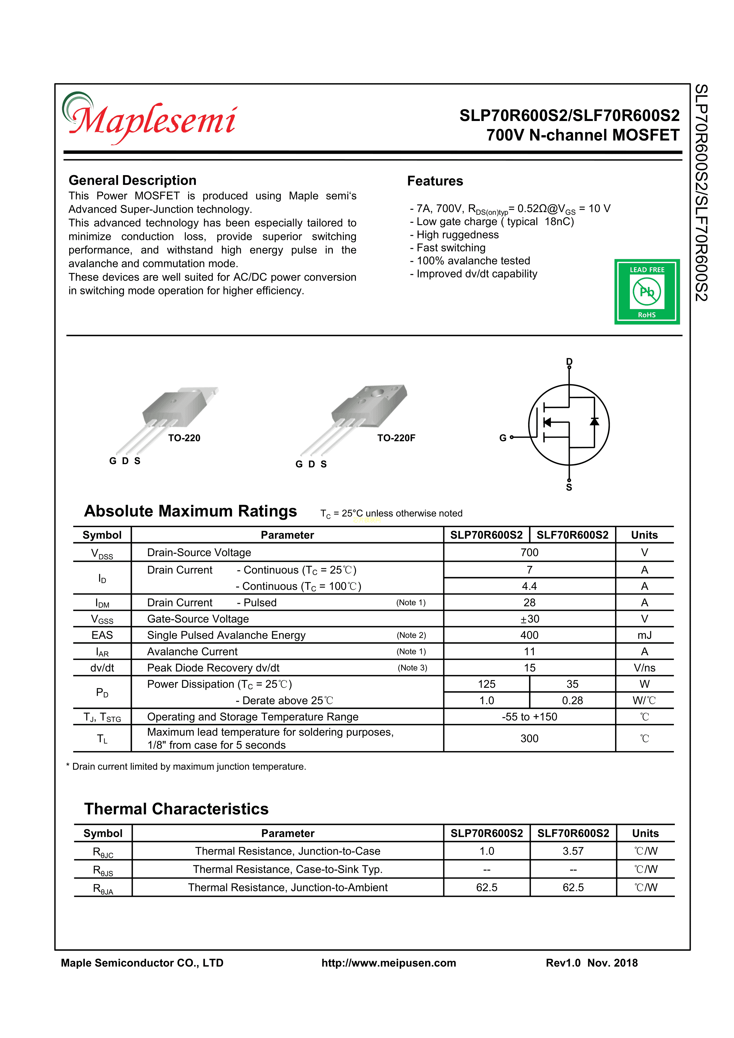 SLF70R600S2数据手册TO-220F封装Maplesemi(美浦森)PDF规格书,中英文下载