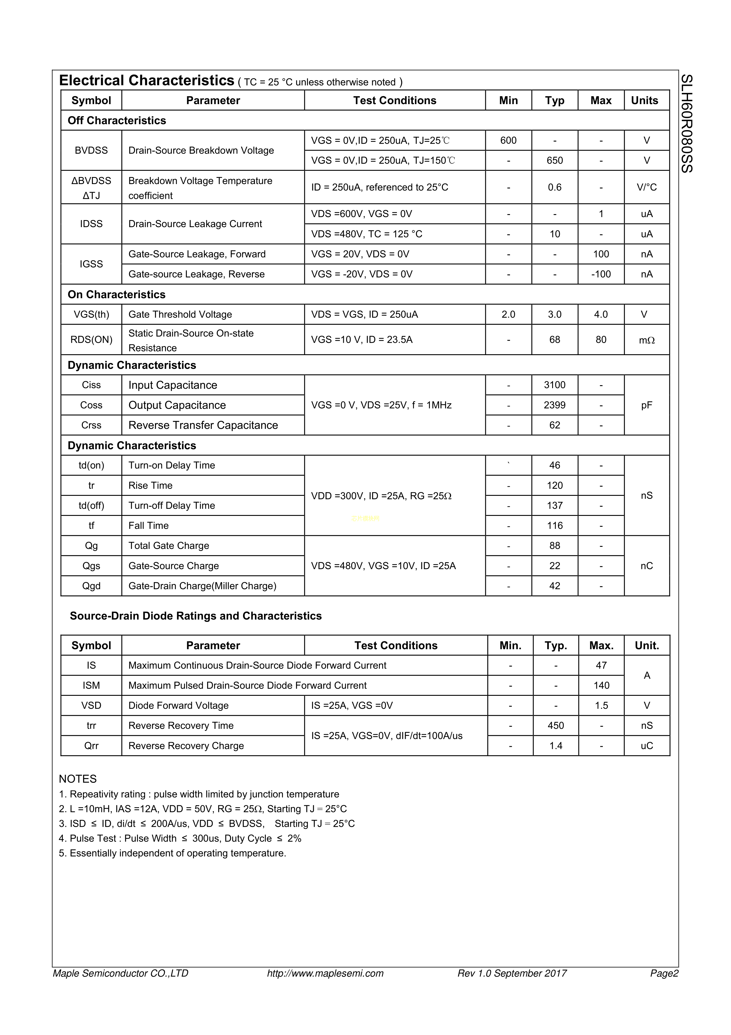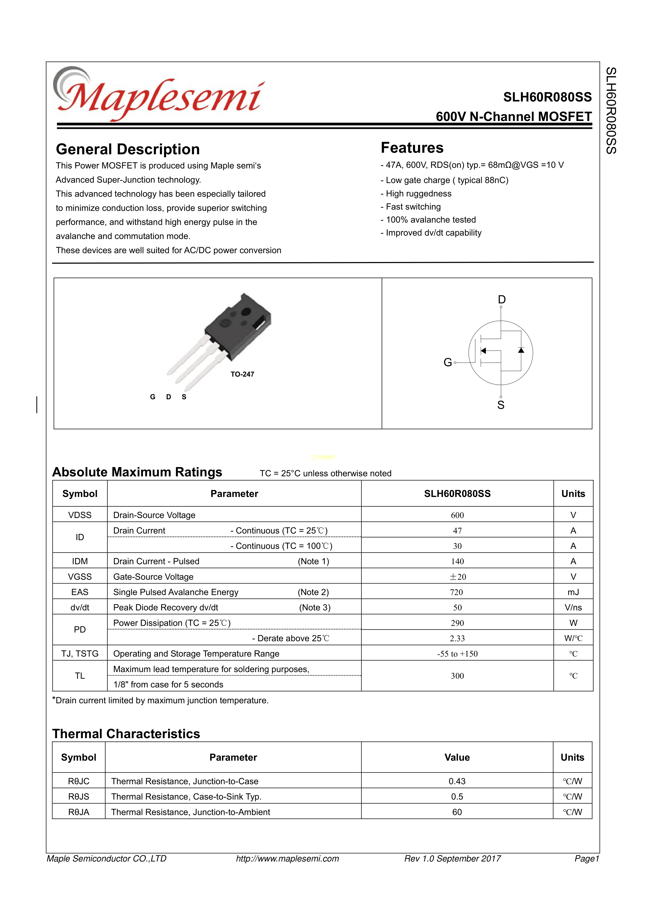 SLH60R080SS数据手册TO-247封装Maplesemi(美浦森)PDF规格书,中英文下载