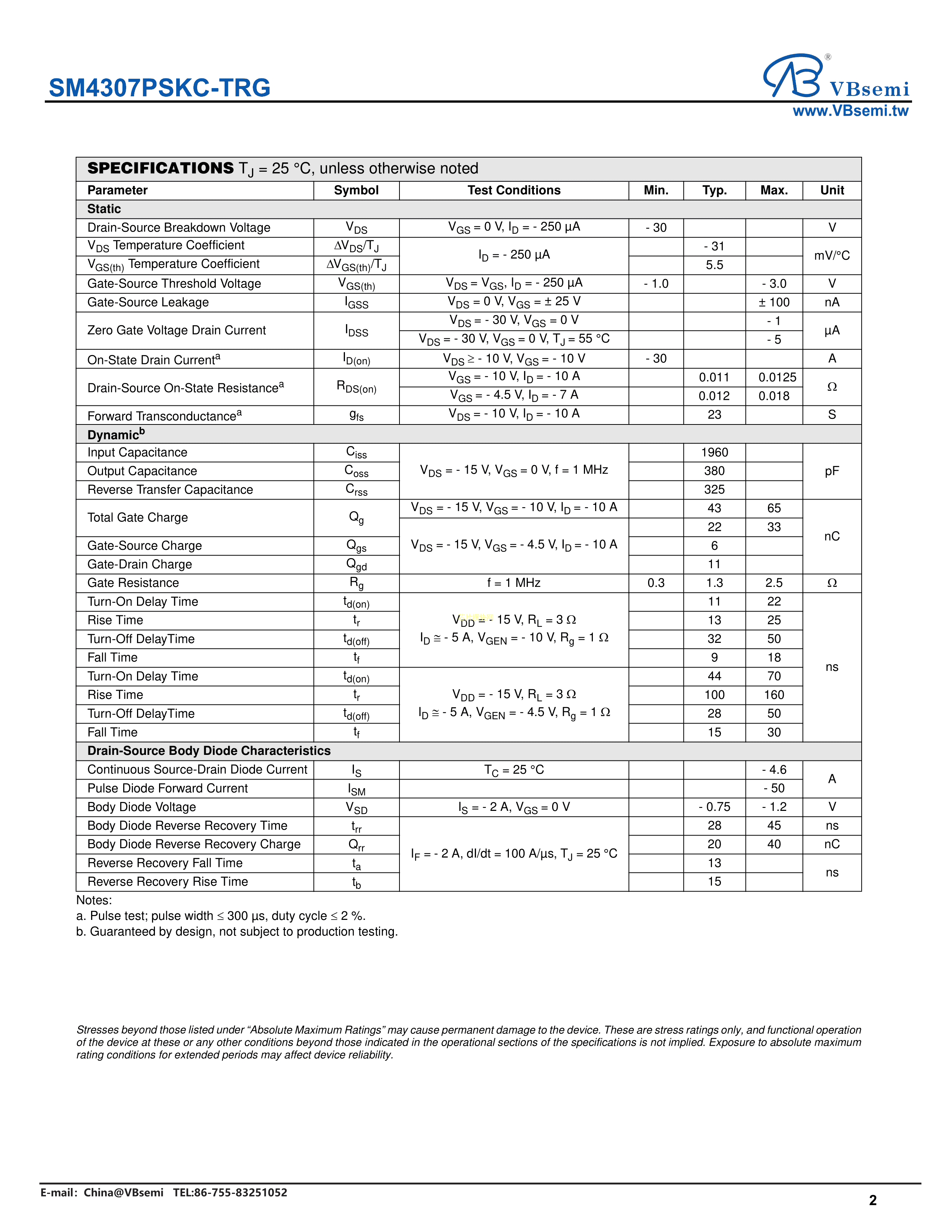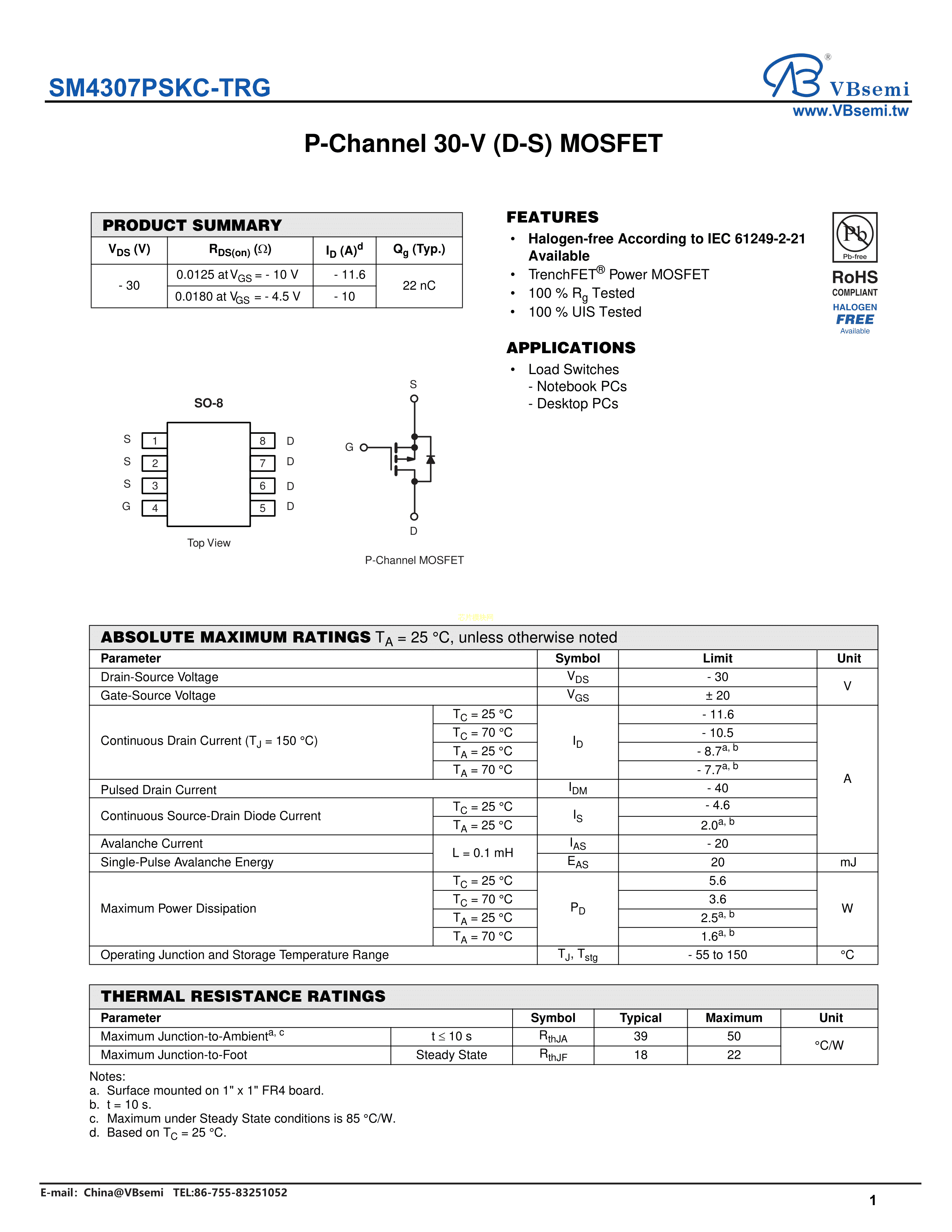 SM4307PSKC-TRG数据手册SOP-8封装VBsemi(台湾微碧)PDF规格书,中英文下载