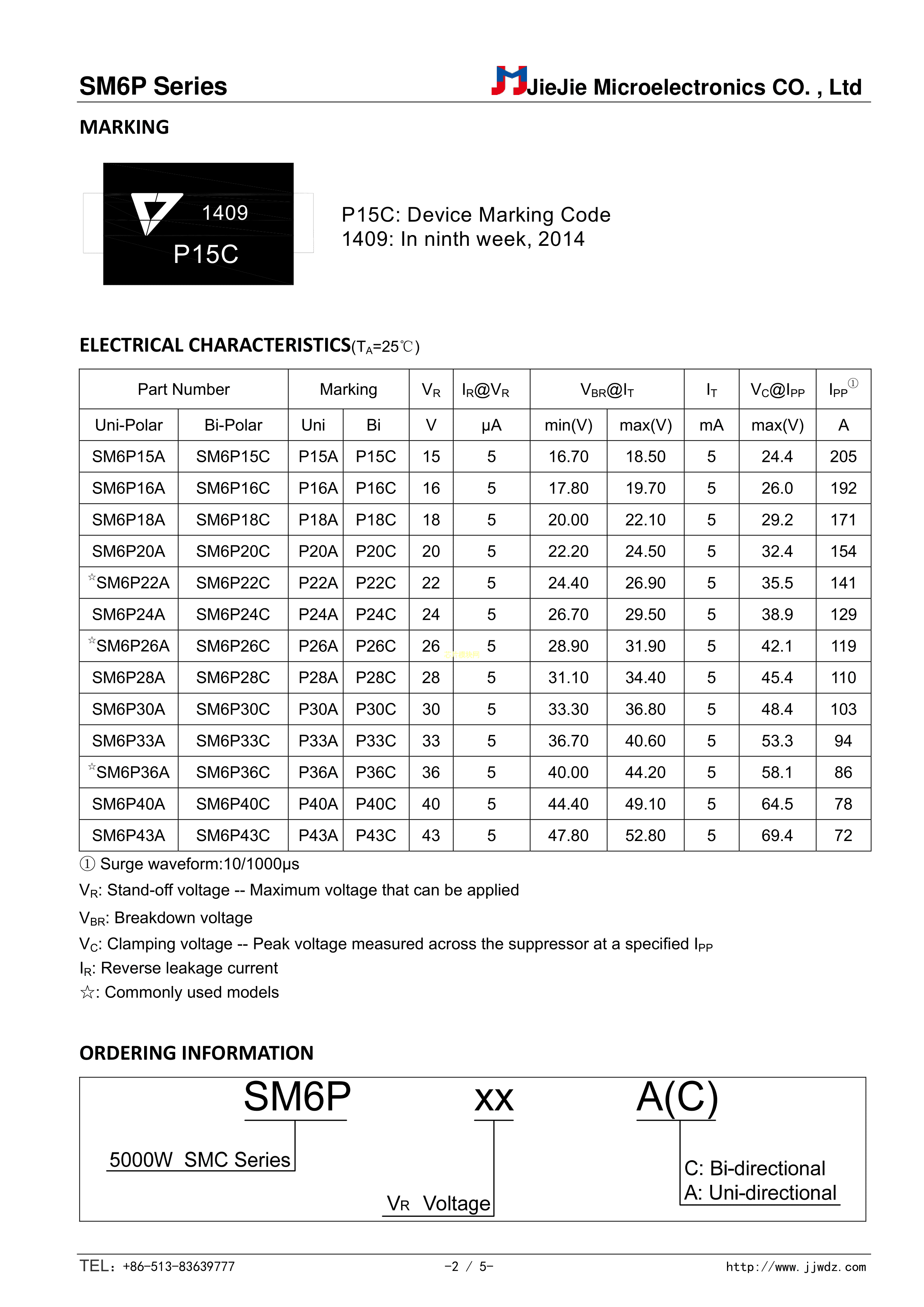 SM6P22A数据手册SMC(DO-214AB)封装JJW(捷捷微)PDF规格书,中英文下载