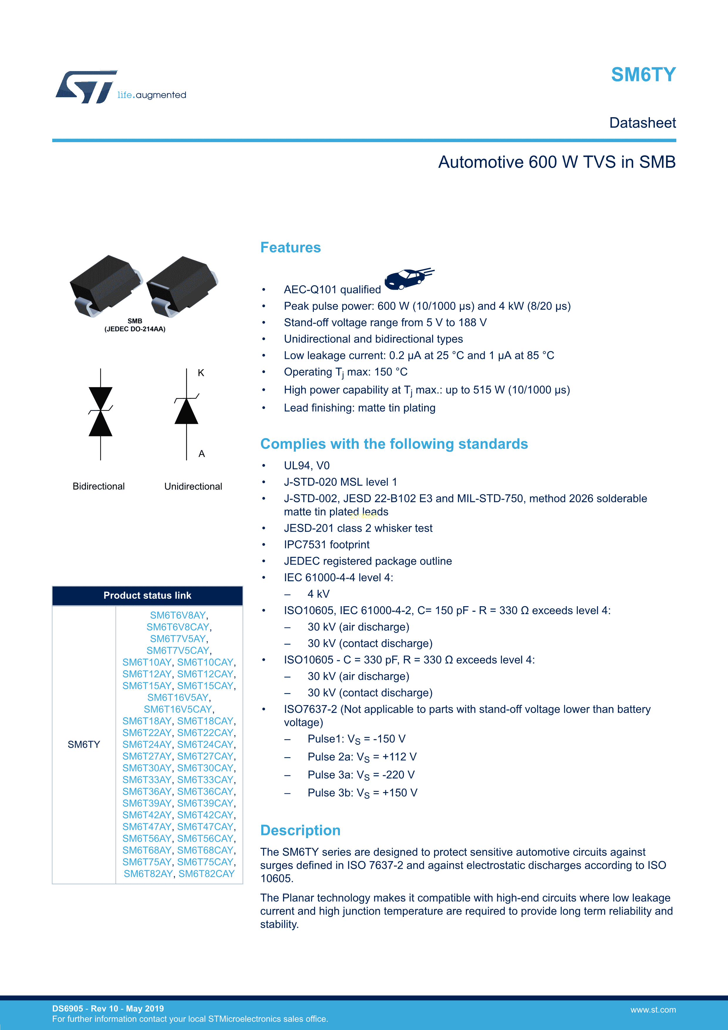 SM6T10AY数据手册SMB(DO-214AA)封装ST(意法半导体)PDF规格书,中英文下载