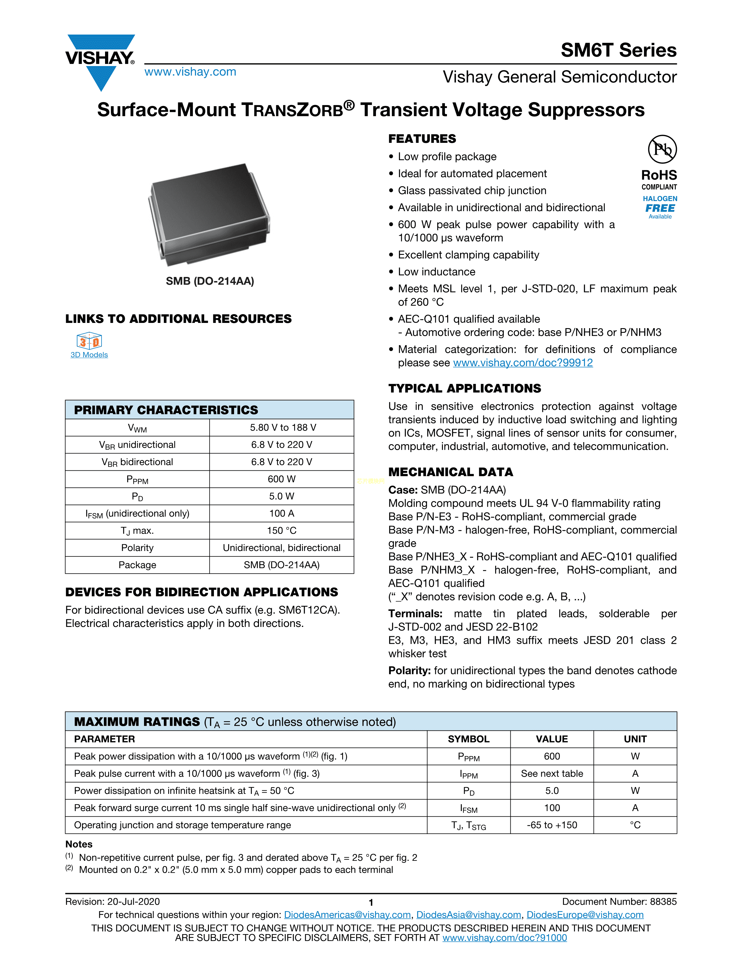 SM6T10CA-M3-52数据手册DO-214AA(SMBJ)封装VISHAY(威世)PDF规格书