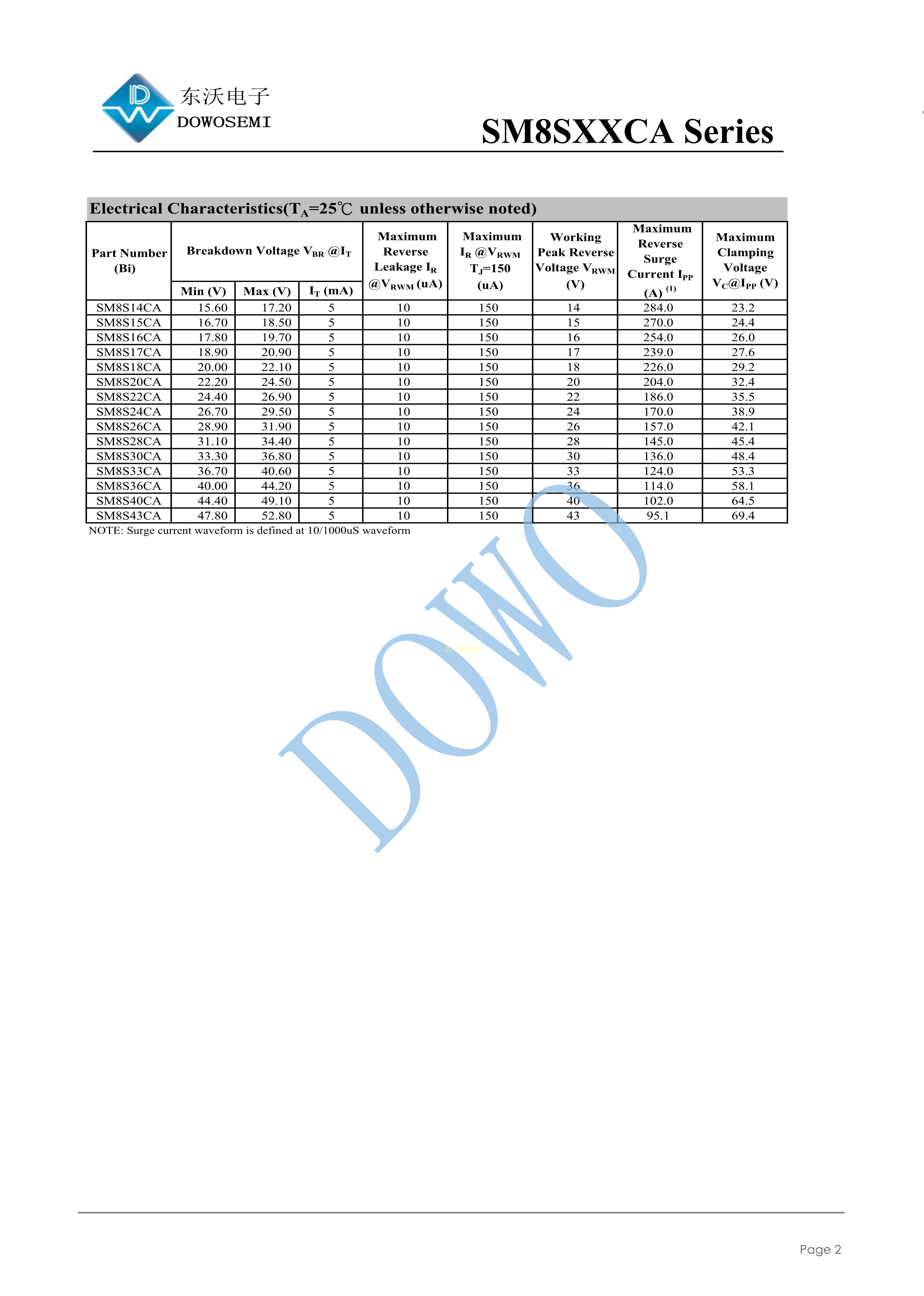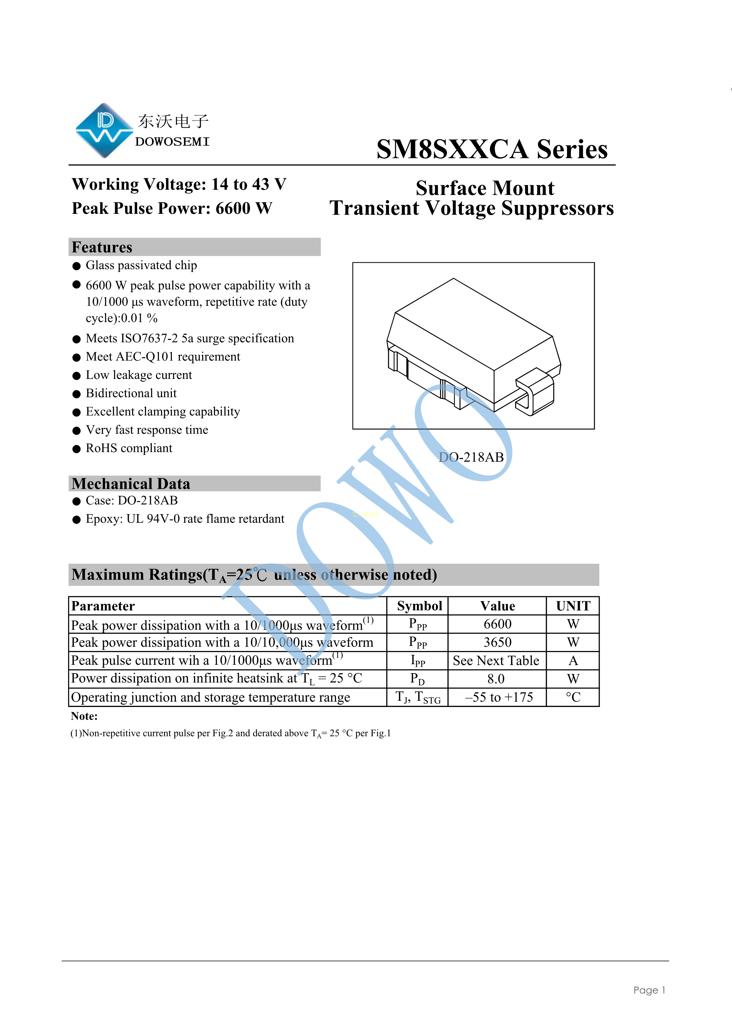 SM8S33CA数据手册DO-218AB封装DOWO(东沃)PDF规格书,中英文下载