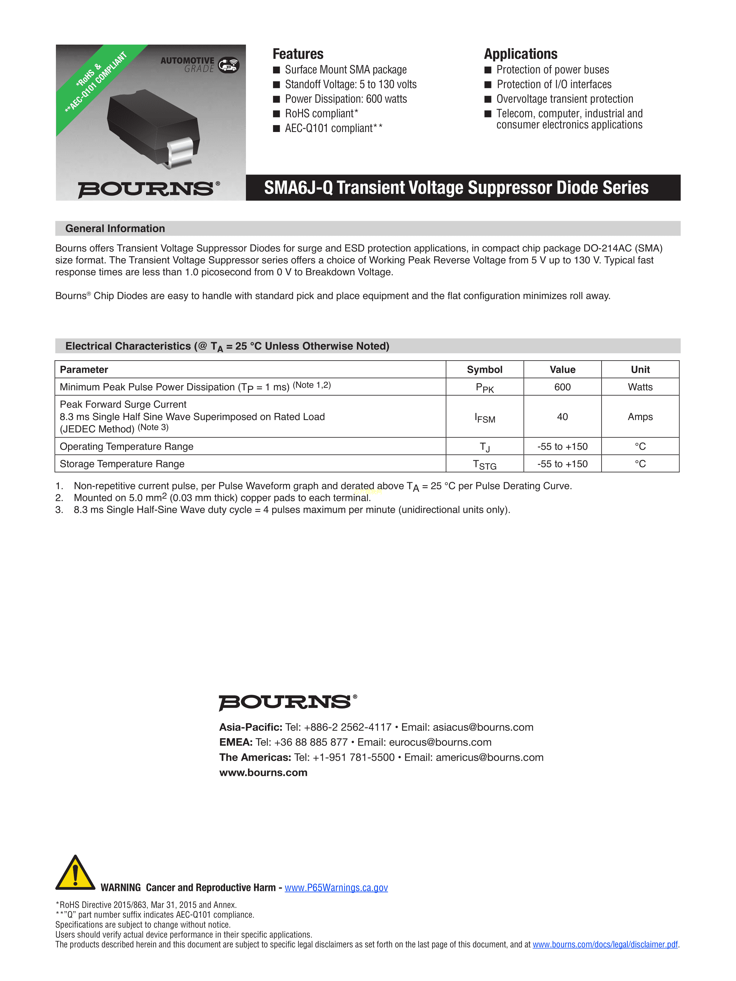 SMA6J14A-Q数据手册SMA(DO-214AC)封装BOURNSPDF规格书,中英文下载