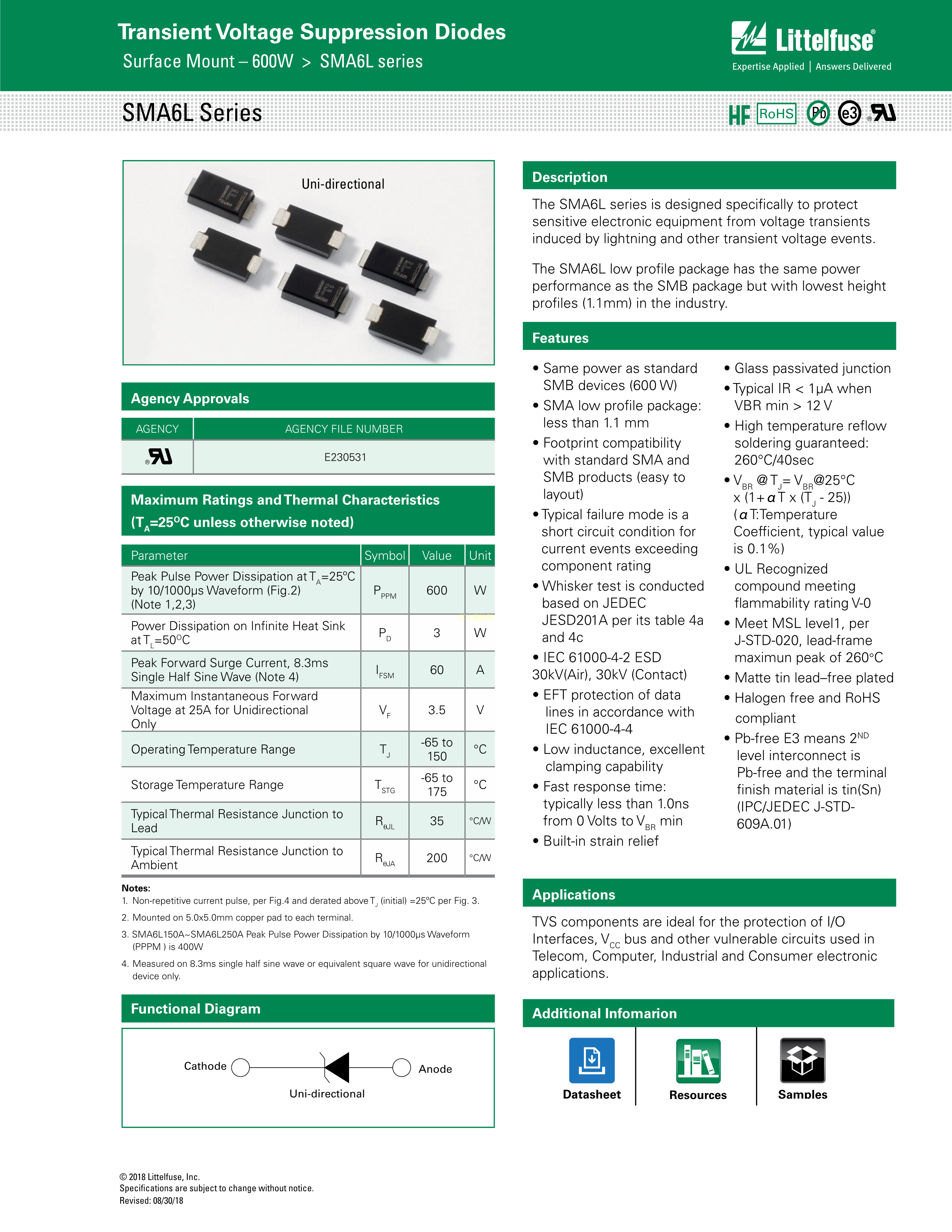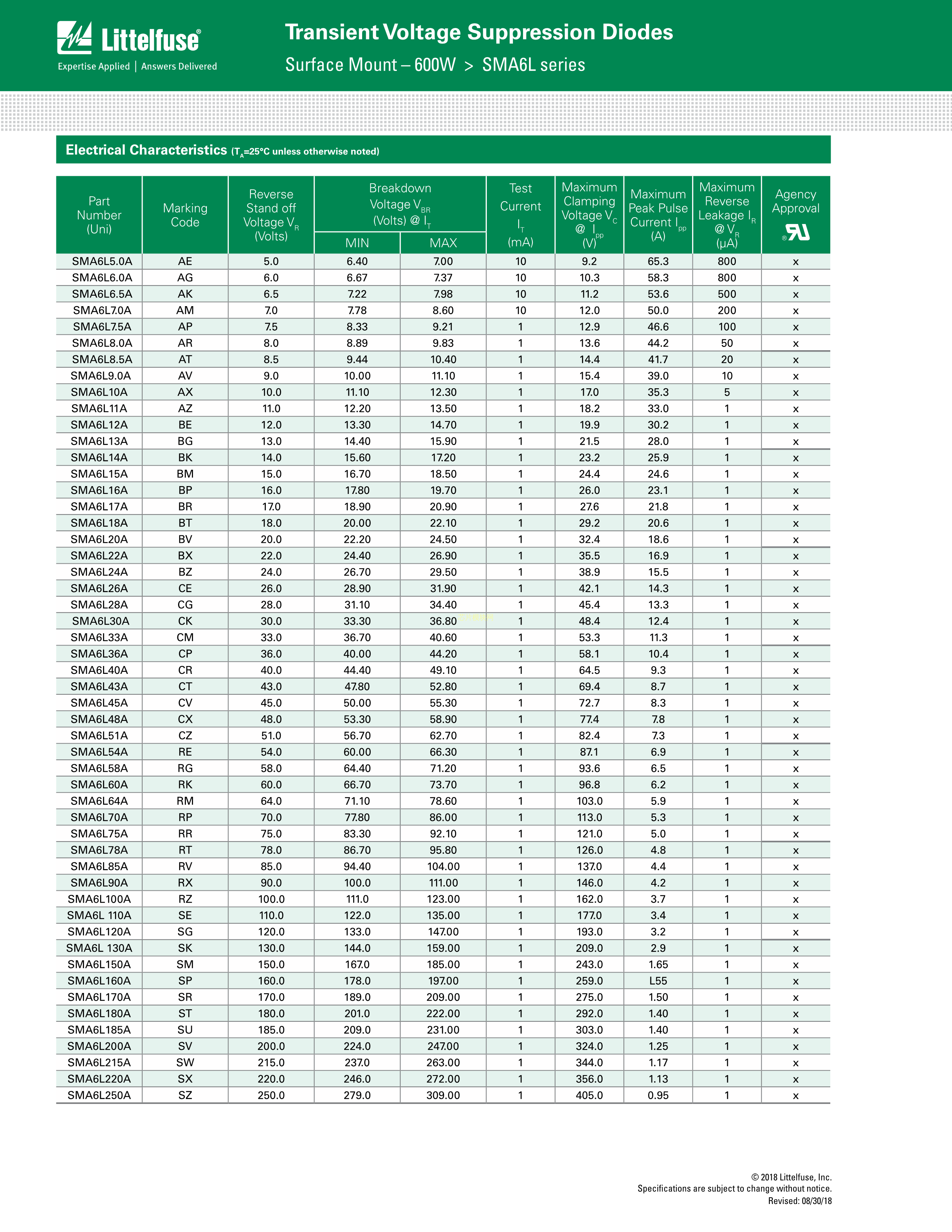 SMA6L16A数据手册DO-221AC-2封装Littelfuse(美国力特)PDF规格书,中英文