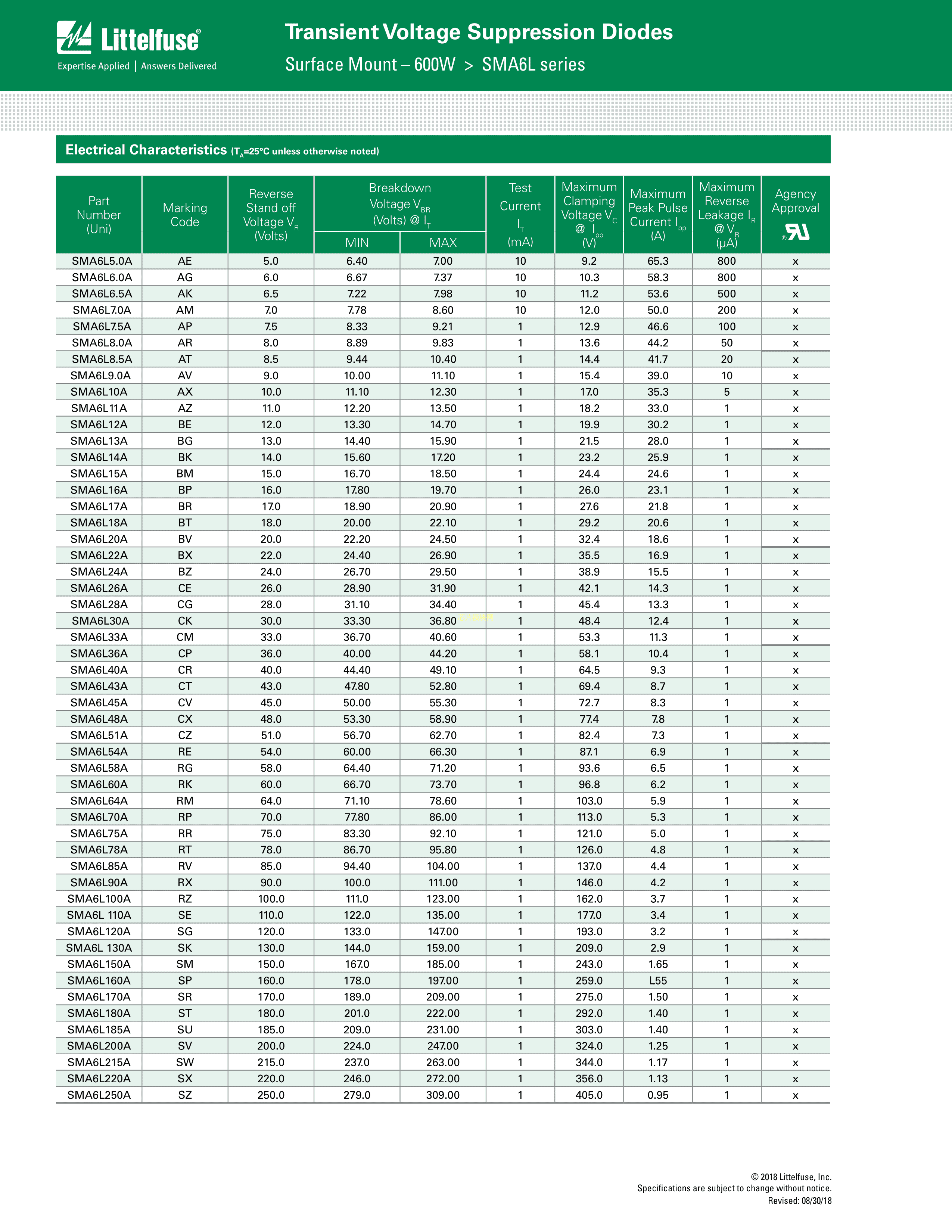 SMA6L6.0A数据手册DO-221AC封装Littelfuse(美国力特)PDF规格书,中英文下