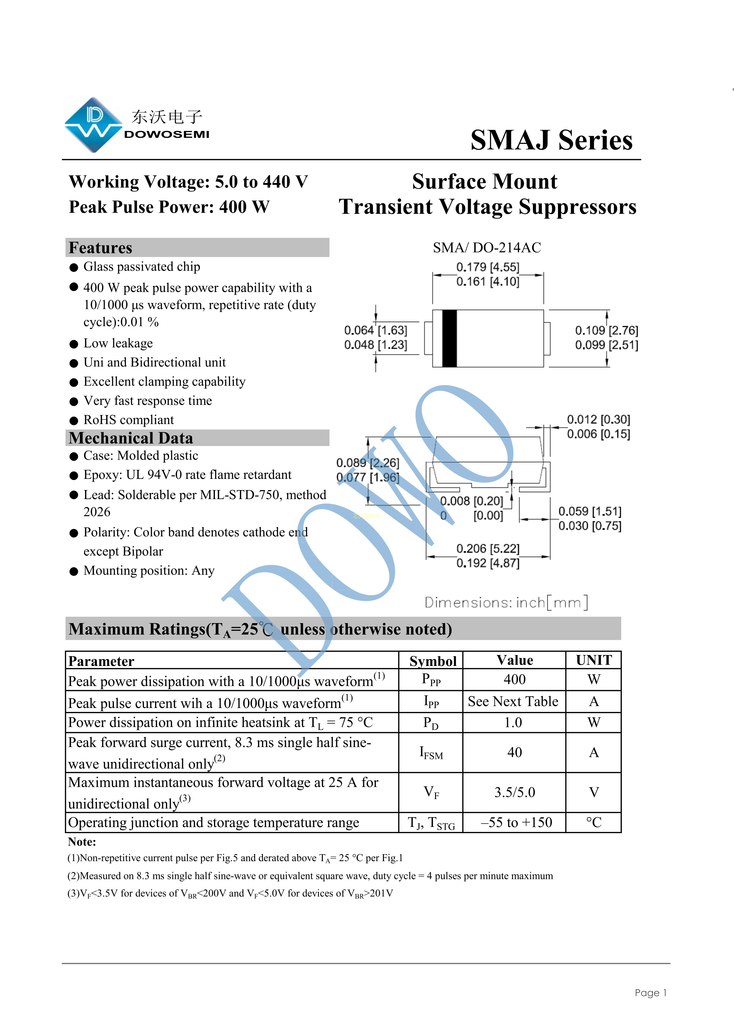 SMAJ11A数据手册SMA(DO-214AC)封装DOWO(东沃)PDF规格书,中英文下载
