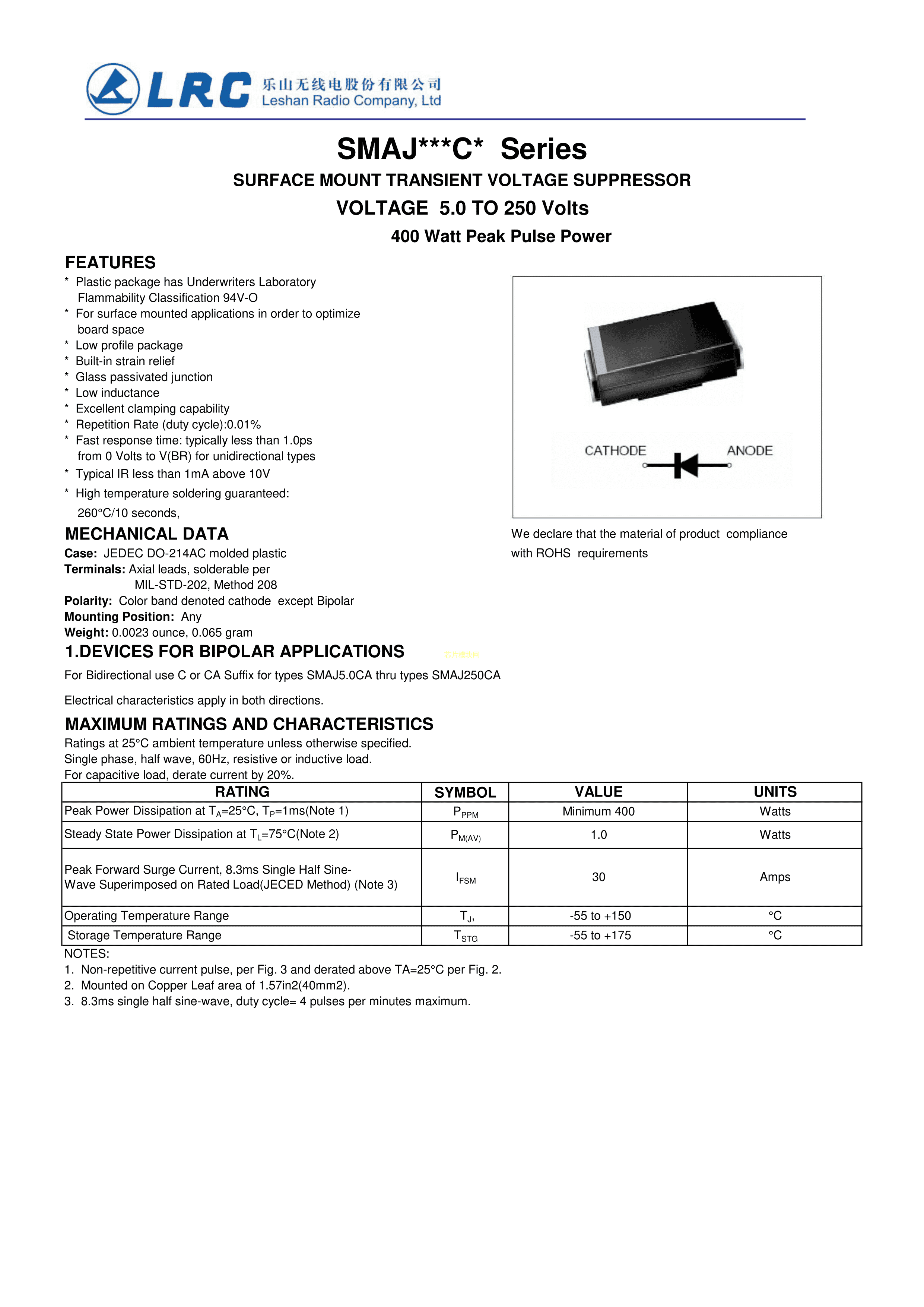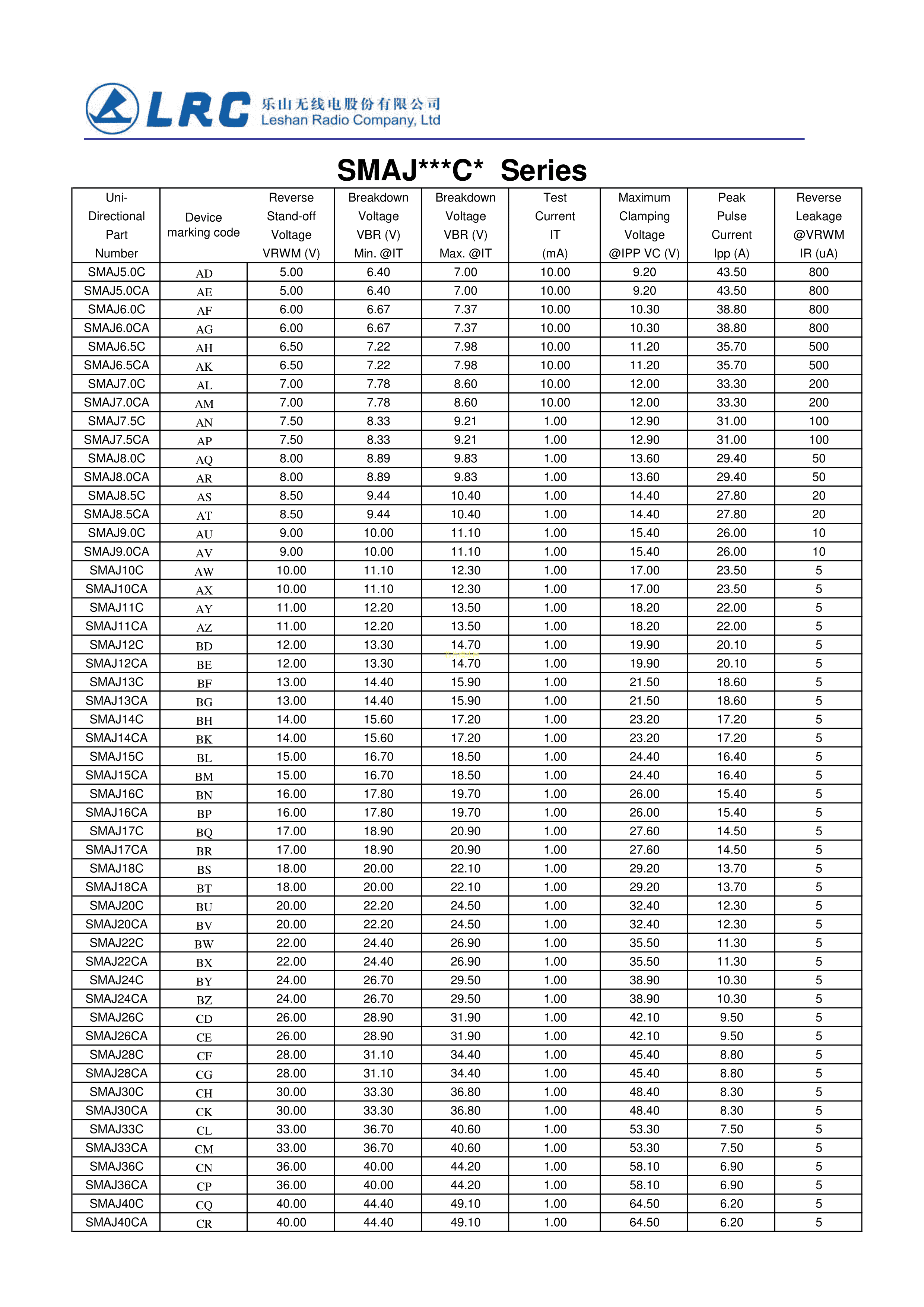 SMAJ12CA数据手册SMA(DO-214AC)封装LRC(乐山无线电)PDF规格书,中英文下载