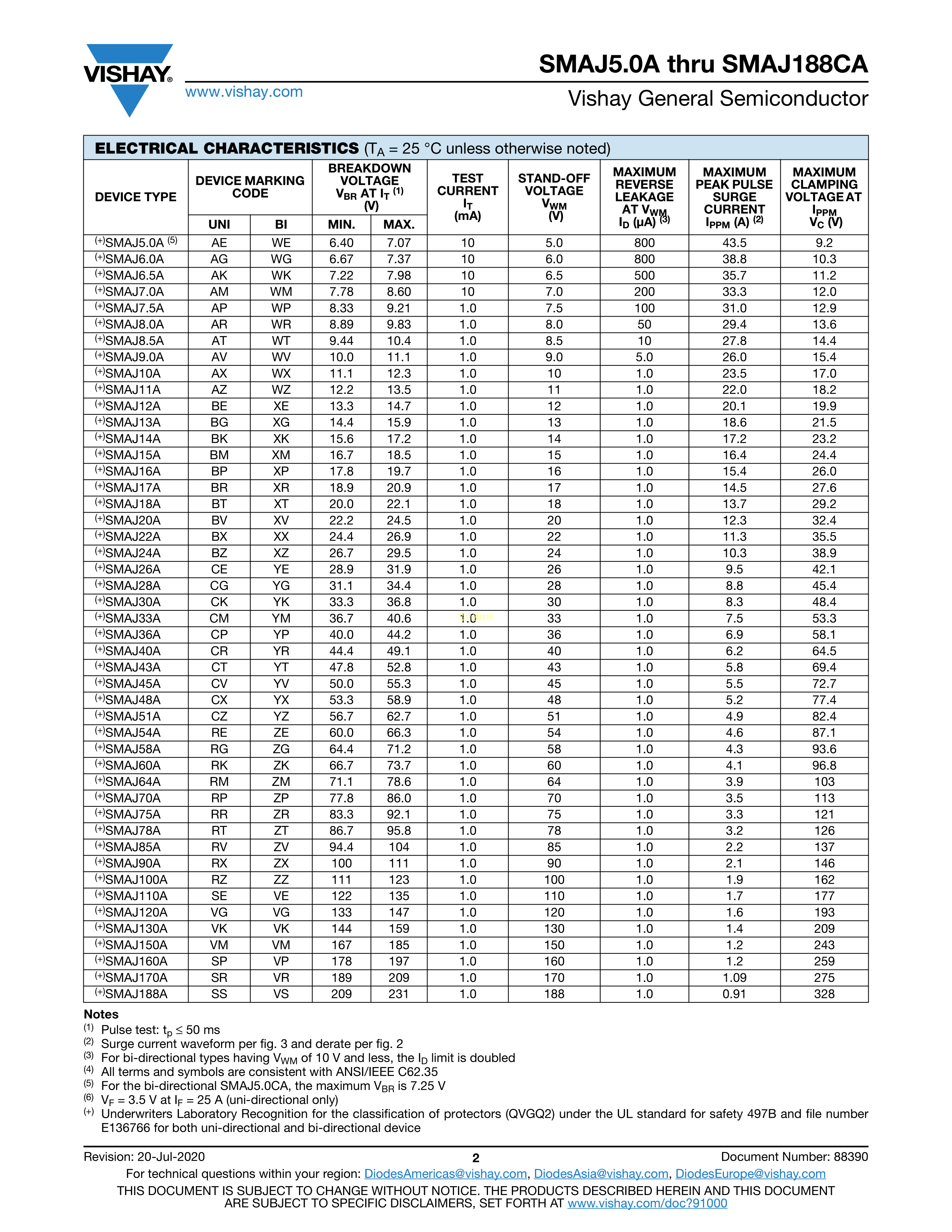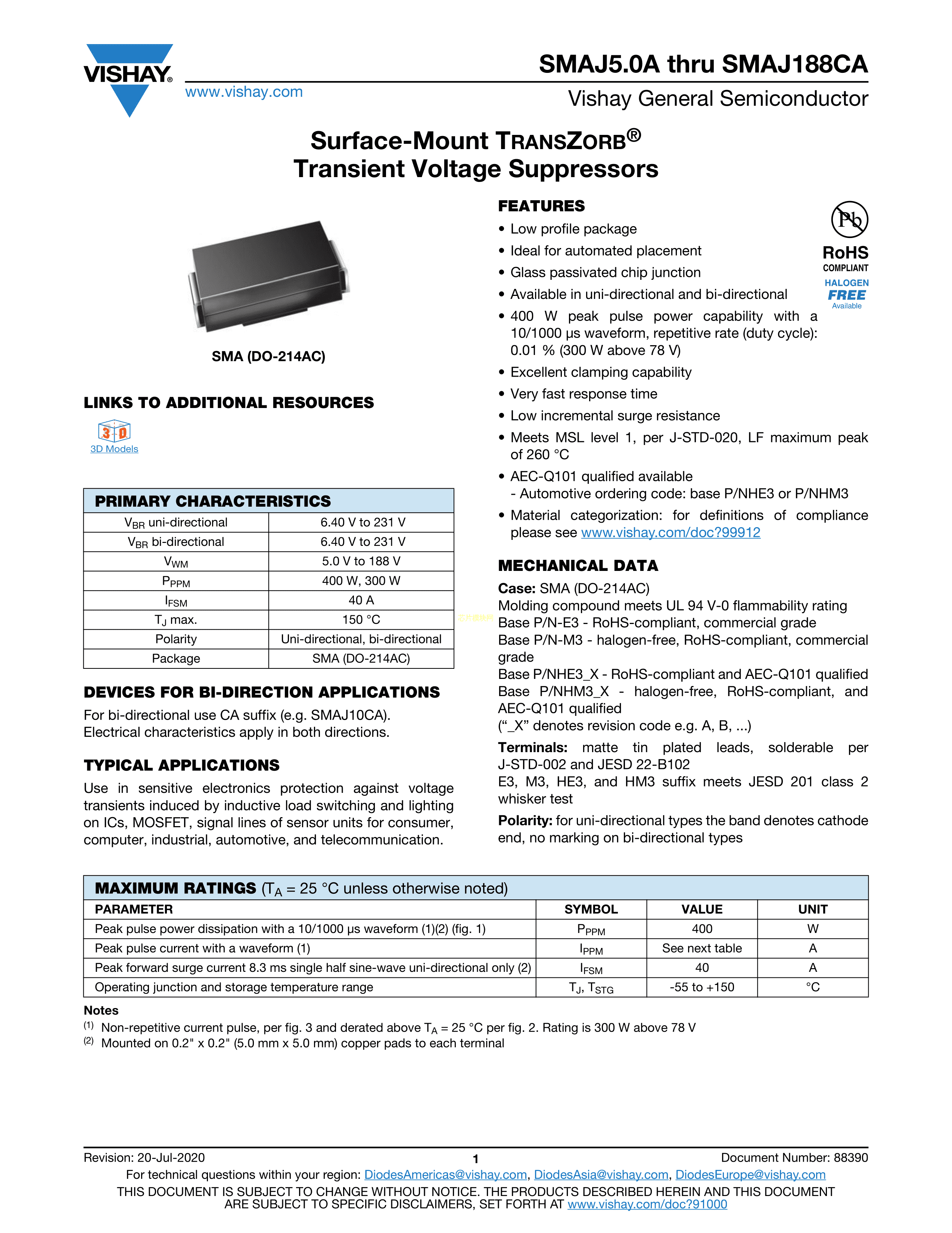 SMAJ13A-E3-5A数据手册SMA(DO-214AC)封装VISHAY(威世)PDF规格书,中