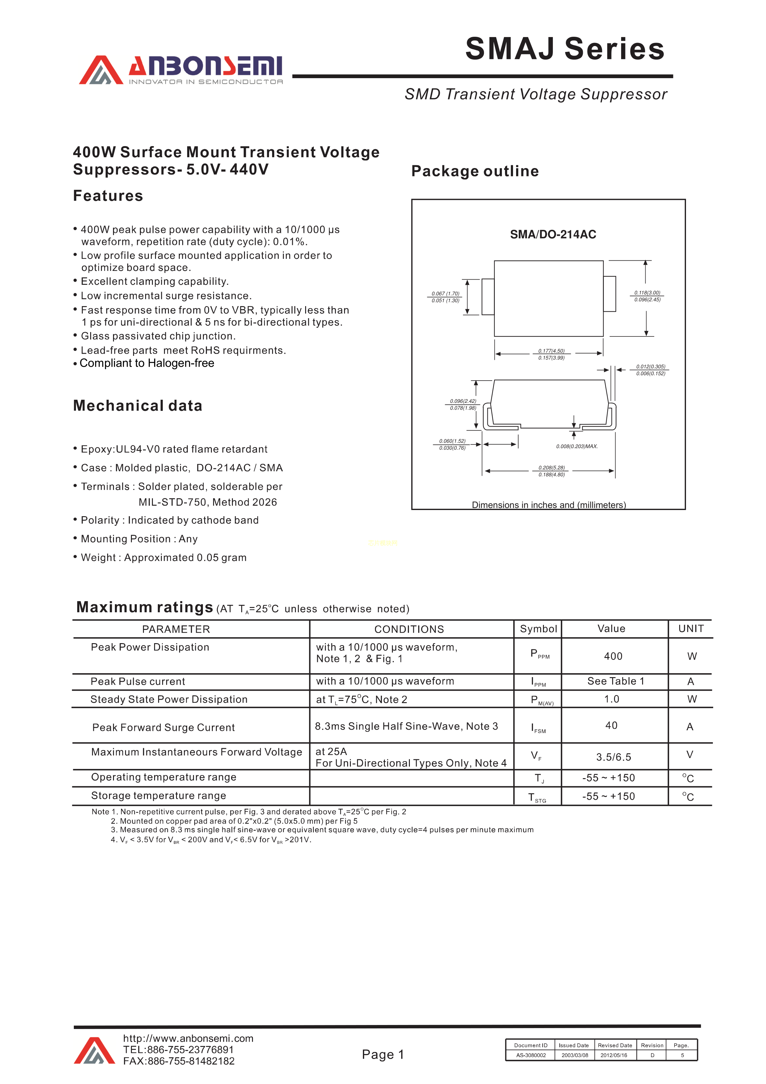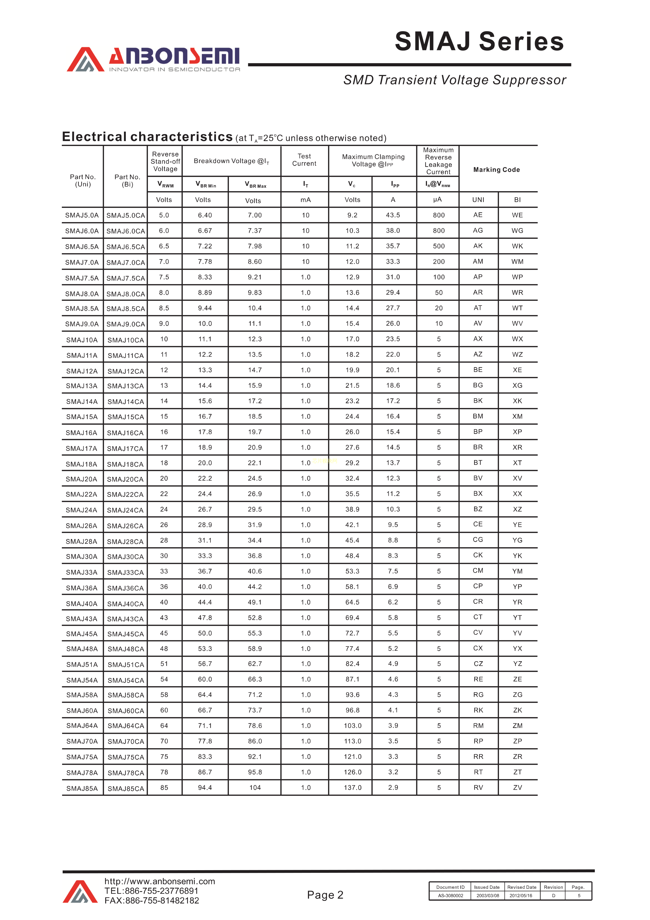 SMAJ14CA数据手册SMA封装AnBon(台湾安邦)PDF规格书,中英文下载