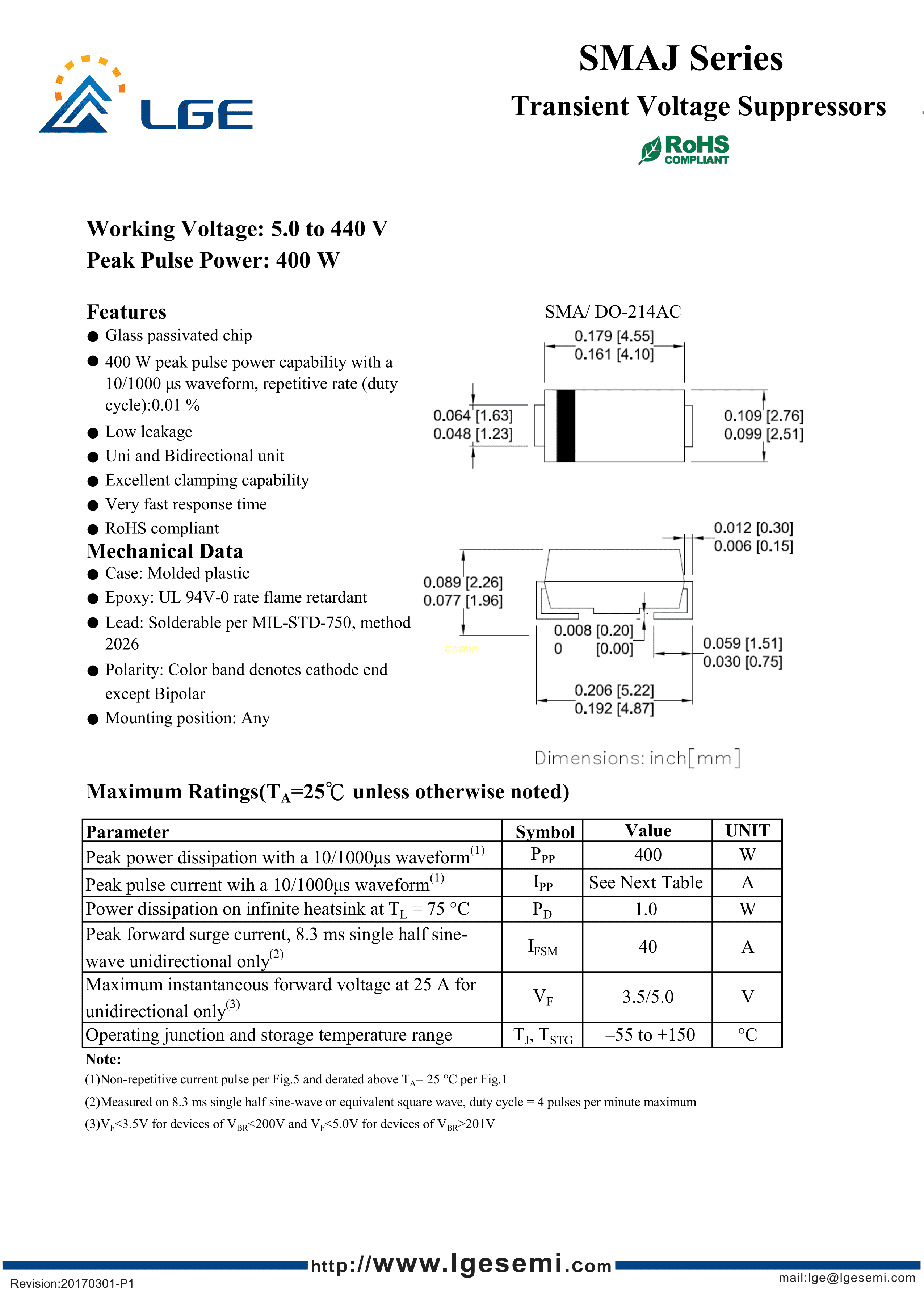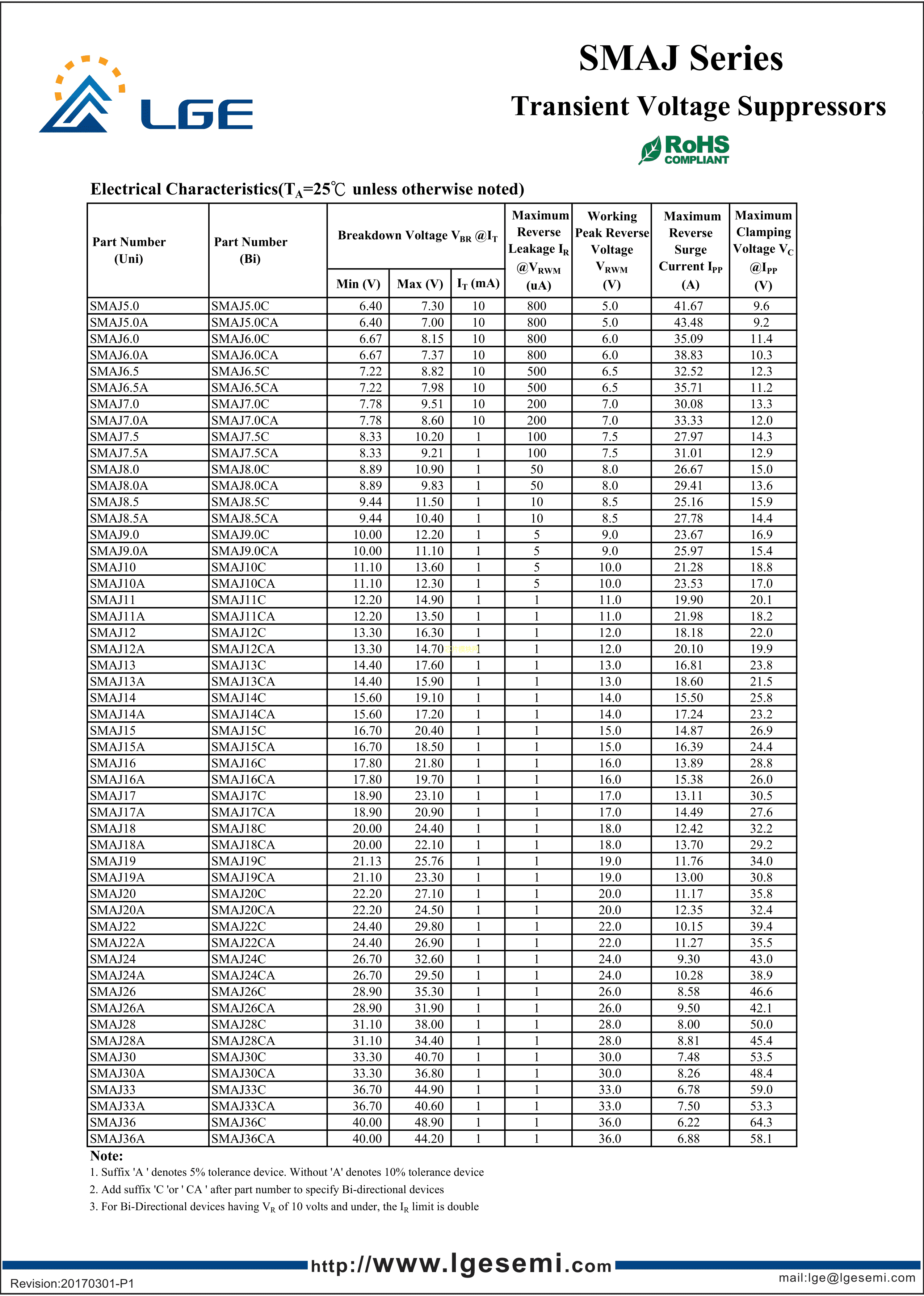 SMAJ14CA数据手册SMA封装LGE(鲁光)PDF规格书,中英文下载