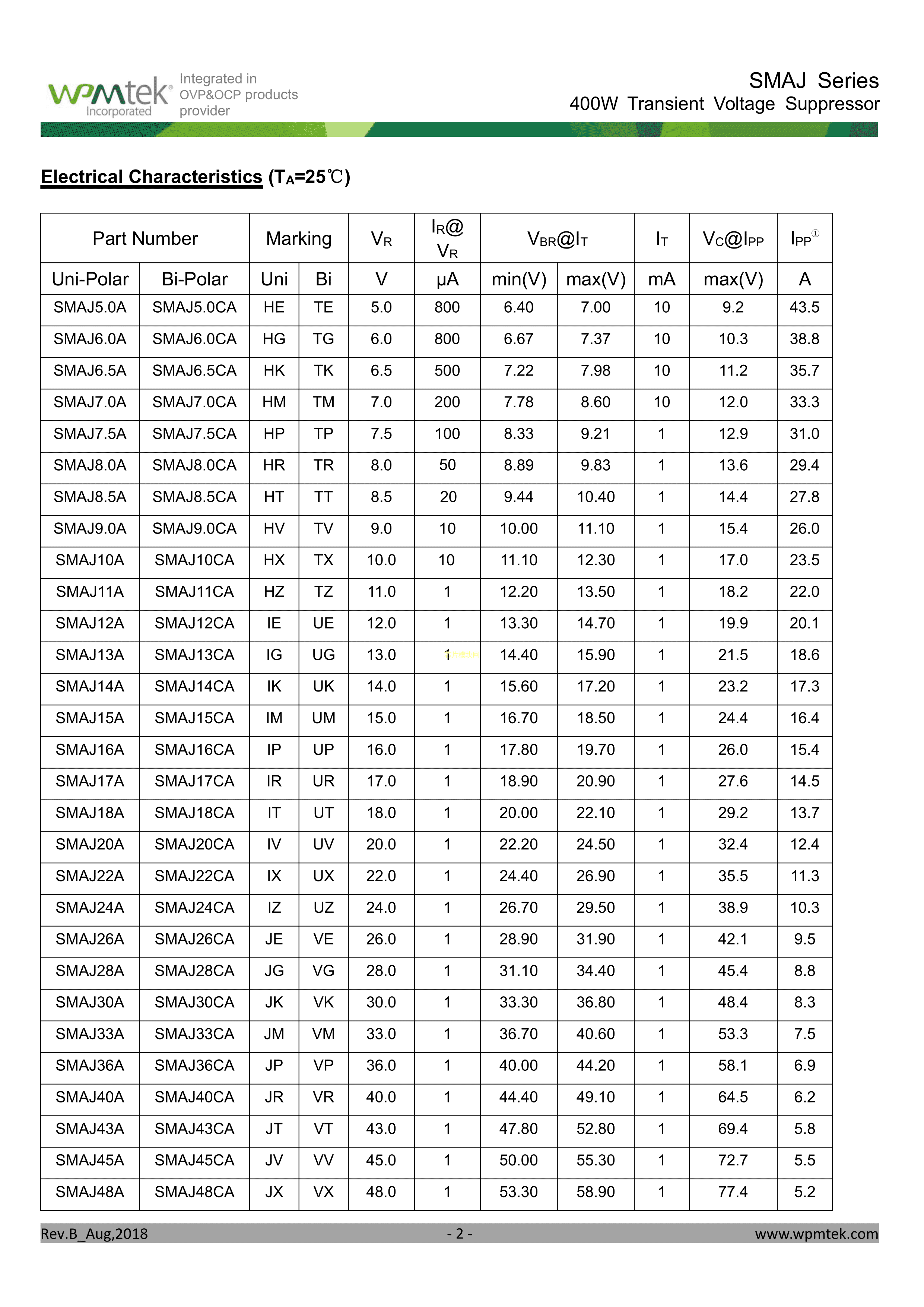 SMAJ15A数据手册SMA封装WPMtek(维攀微)PDF规格书,中英文下载