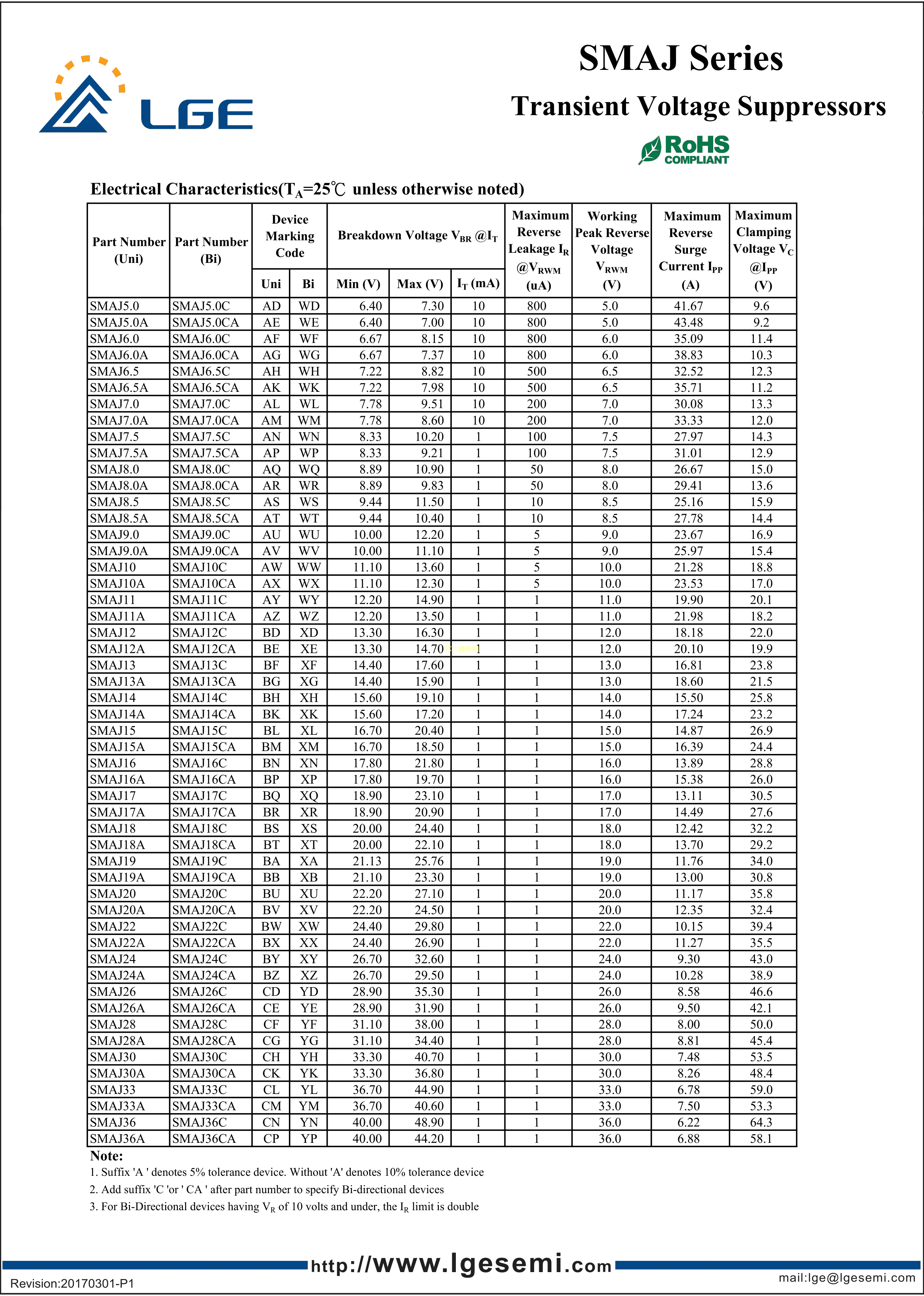 SMAJ15CA数据手册SMA(DO-214AC)封装LGE(鲁光)PDF规格书,中英文下载