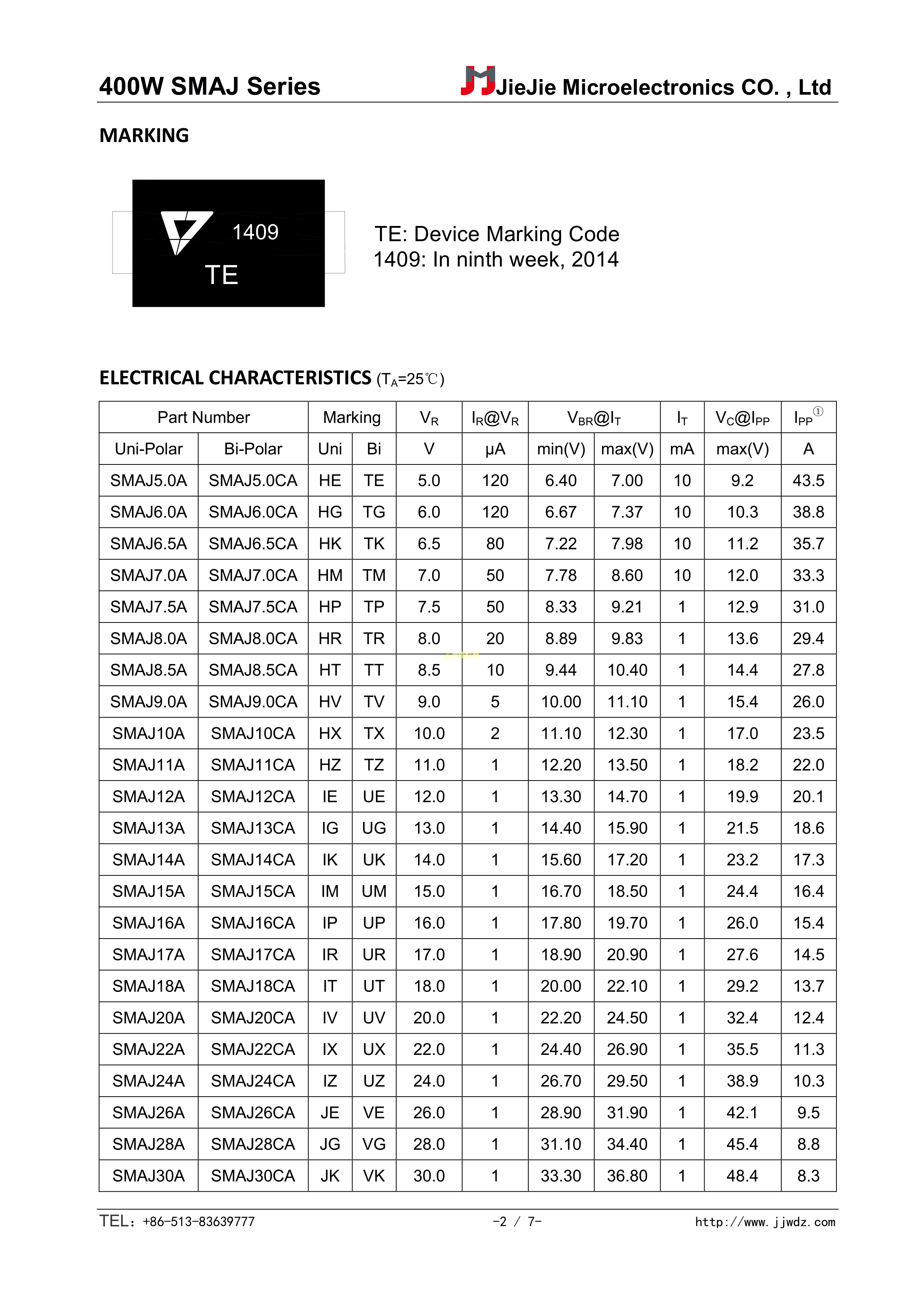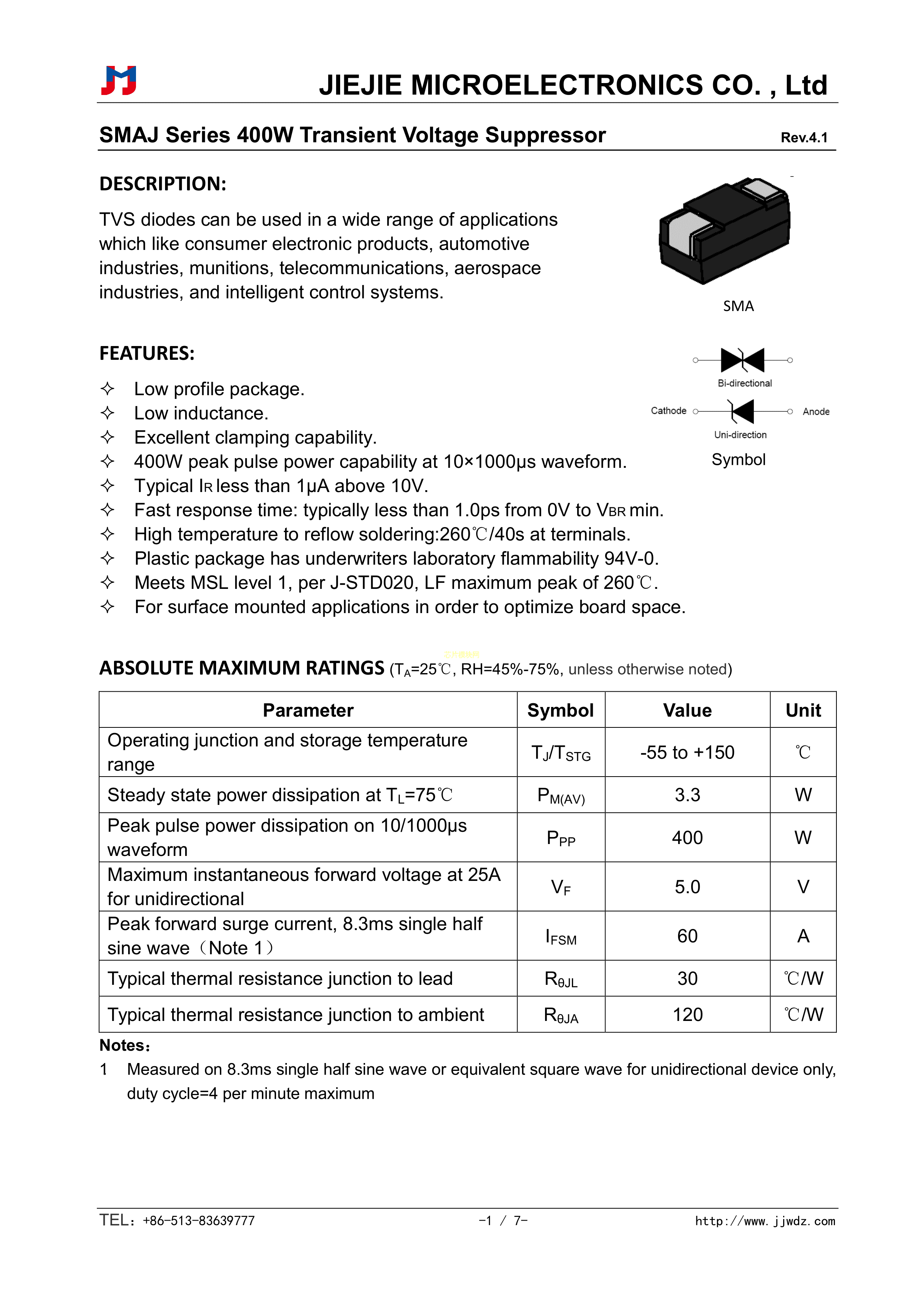 SMAJ15CA数据手册SMA封装JJW(捷捷微)PDF规格书,中英文下载
