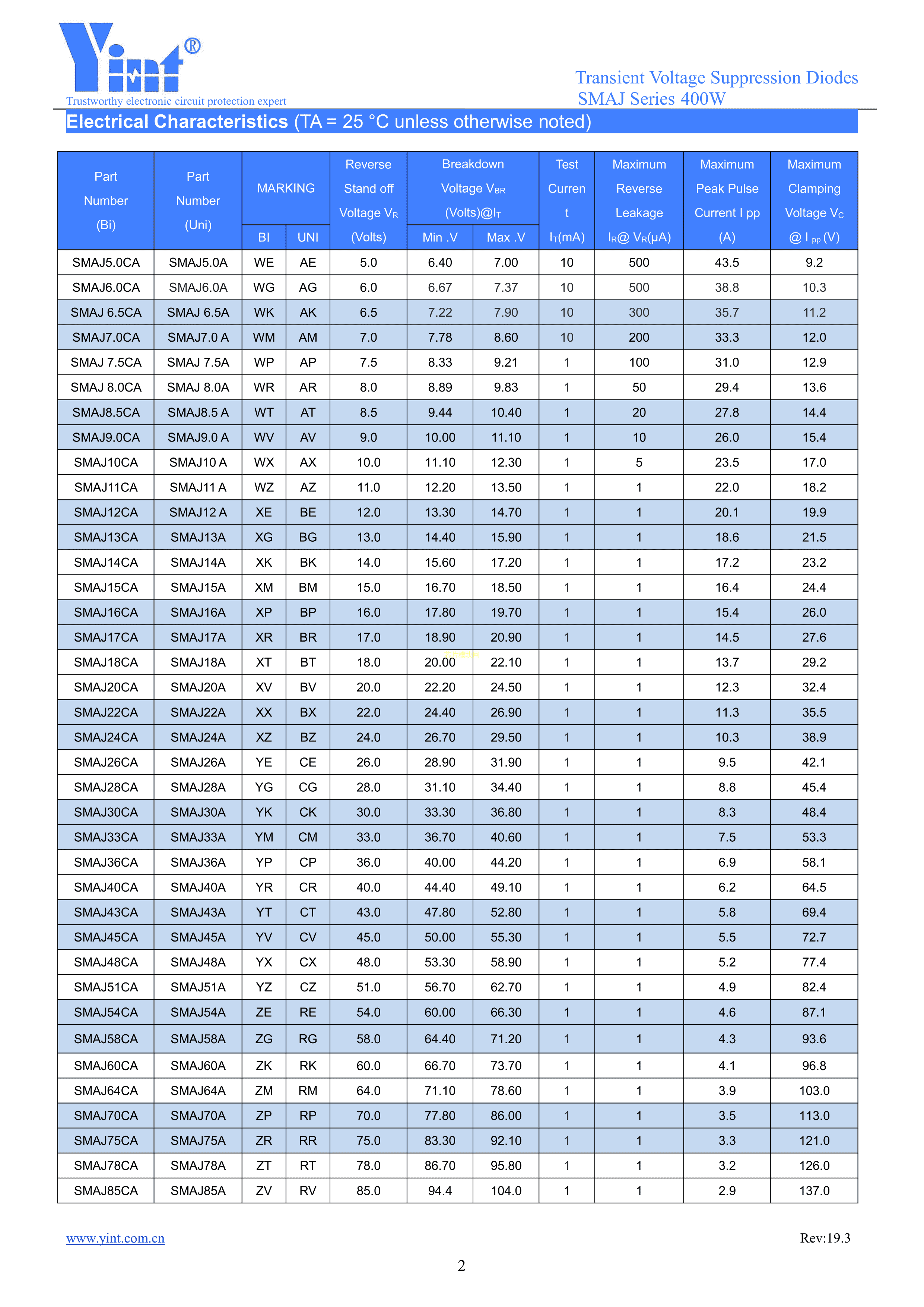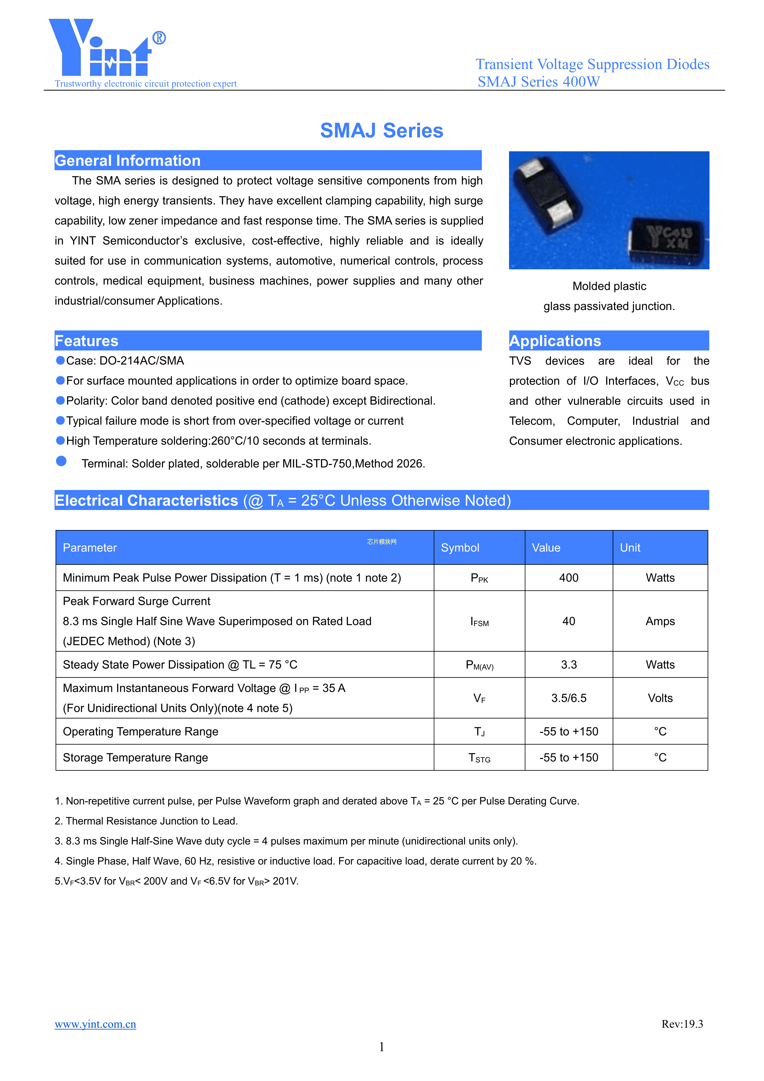 SMAJ15CA数据手册SMA封装Yint(音特电子)PDF规格书,中英文下载