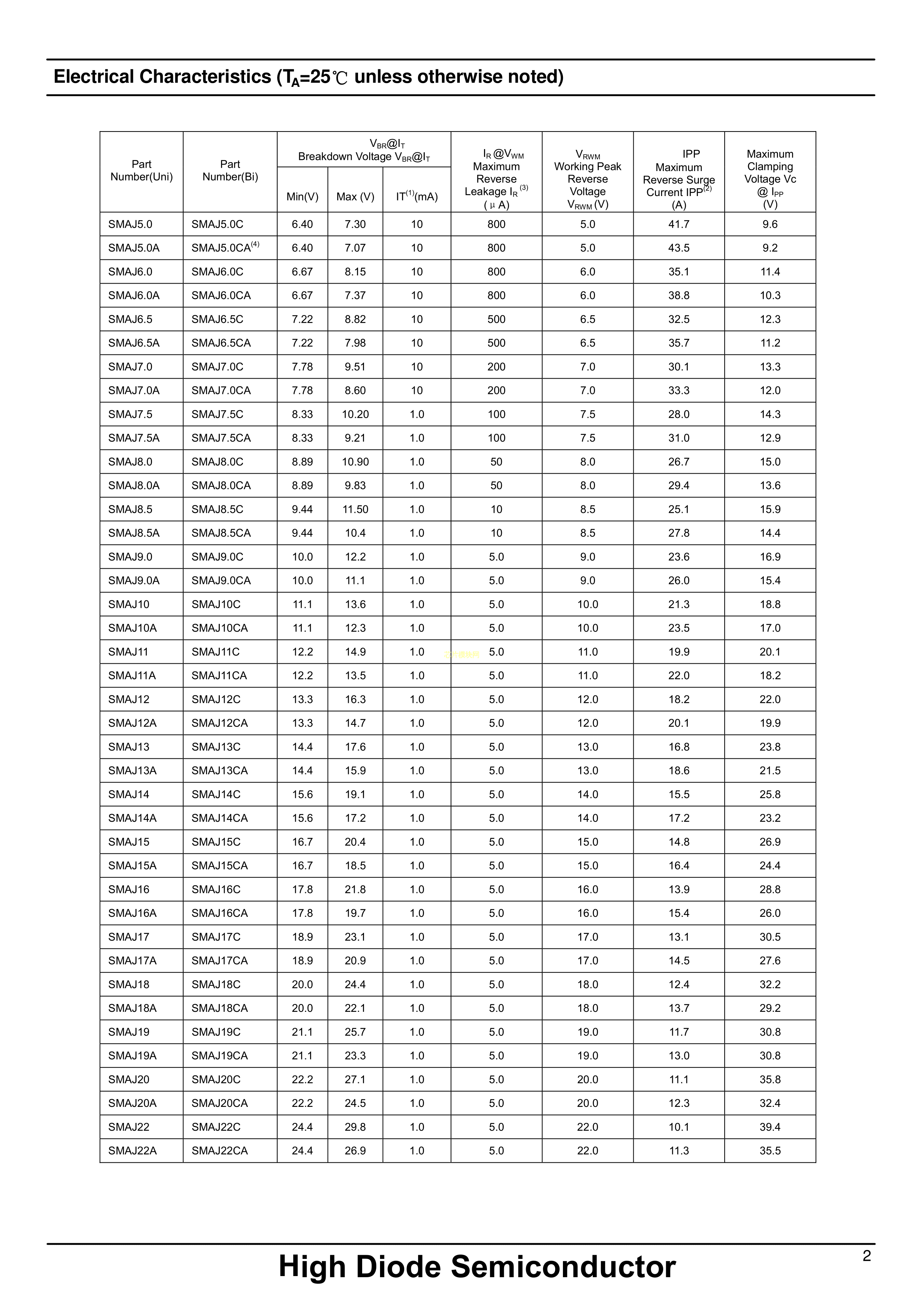 SMAJ15CA数据手册SMAG封装High Diode(海德)PDF规格书,中英文下载