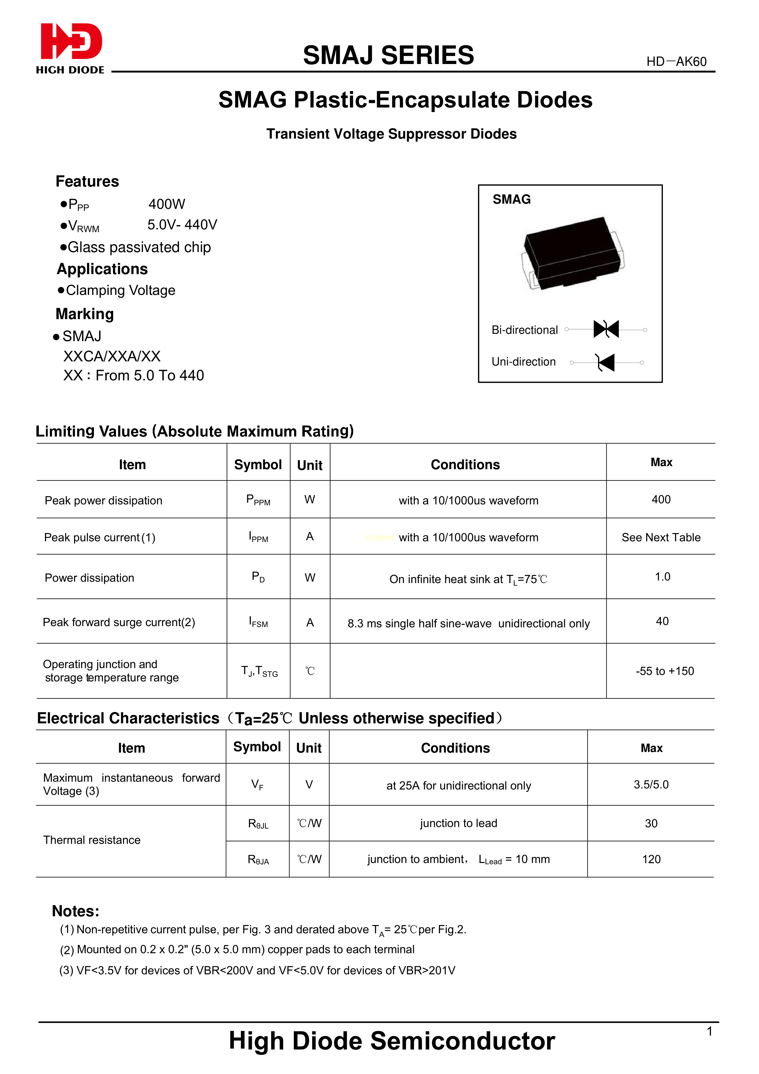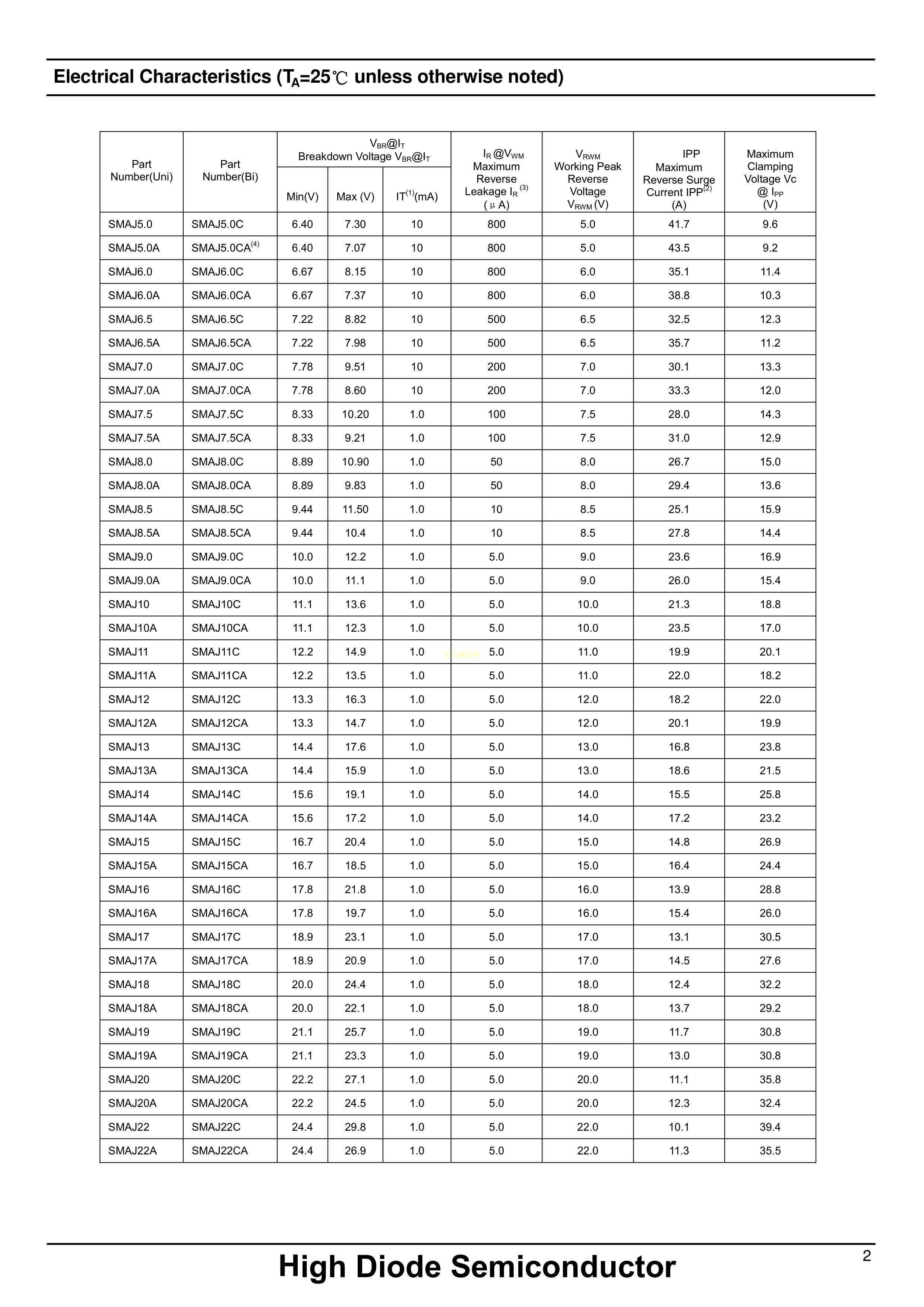 SMAJ18A数据手册SMA封装High Diode(海德)PDF规格书,中英文下载