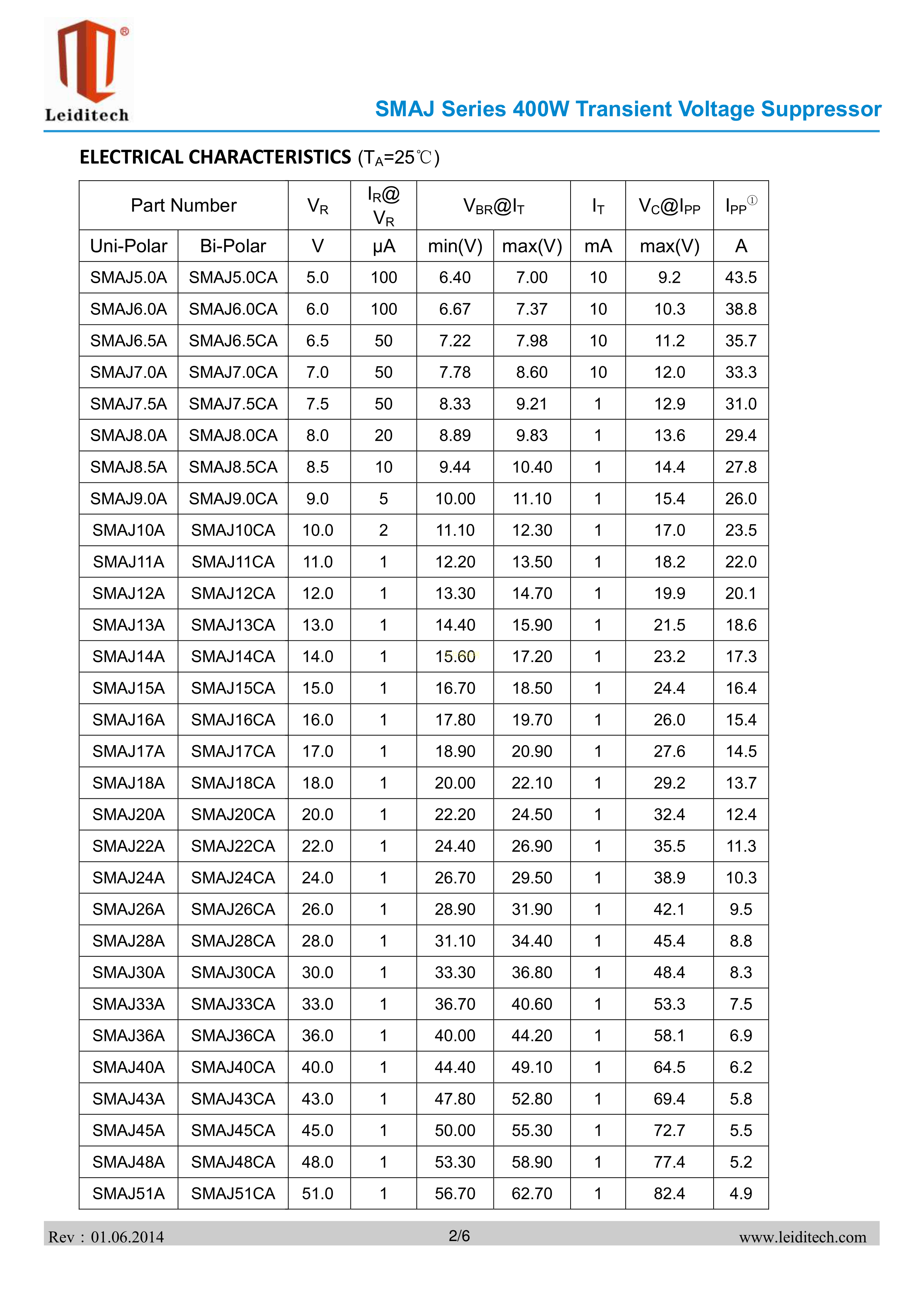 SMAJ18A数据手册SMA封装Leiditech(雷卯电子)PDF规格书,中英文下载