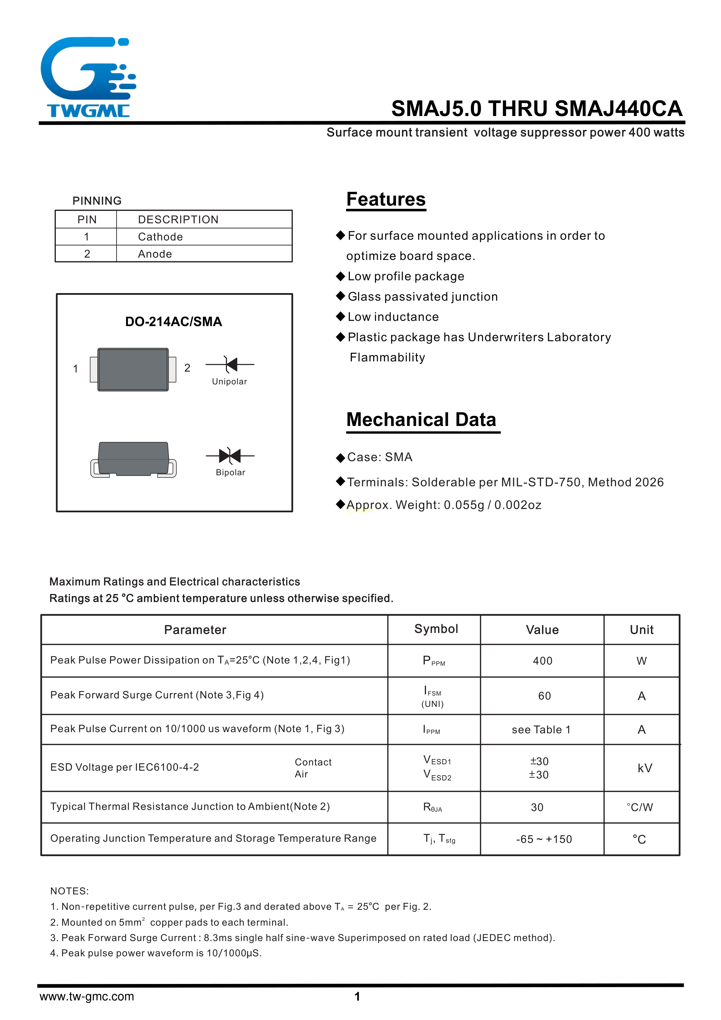 SMAJ24A数据手册SMA封装TWGMC(台湾迪嘉)PDF规格书,中英文下载