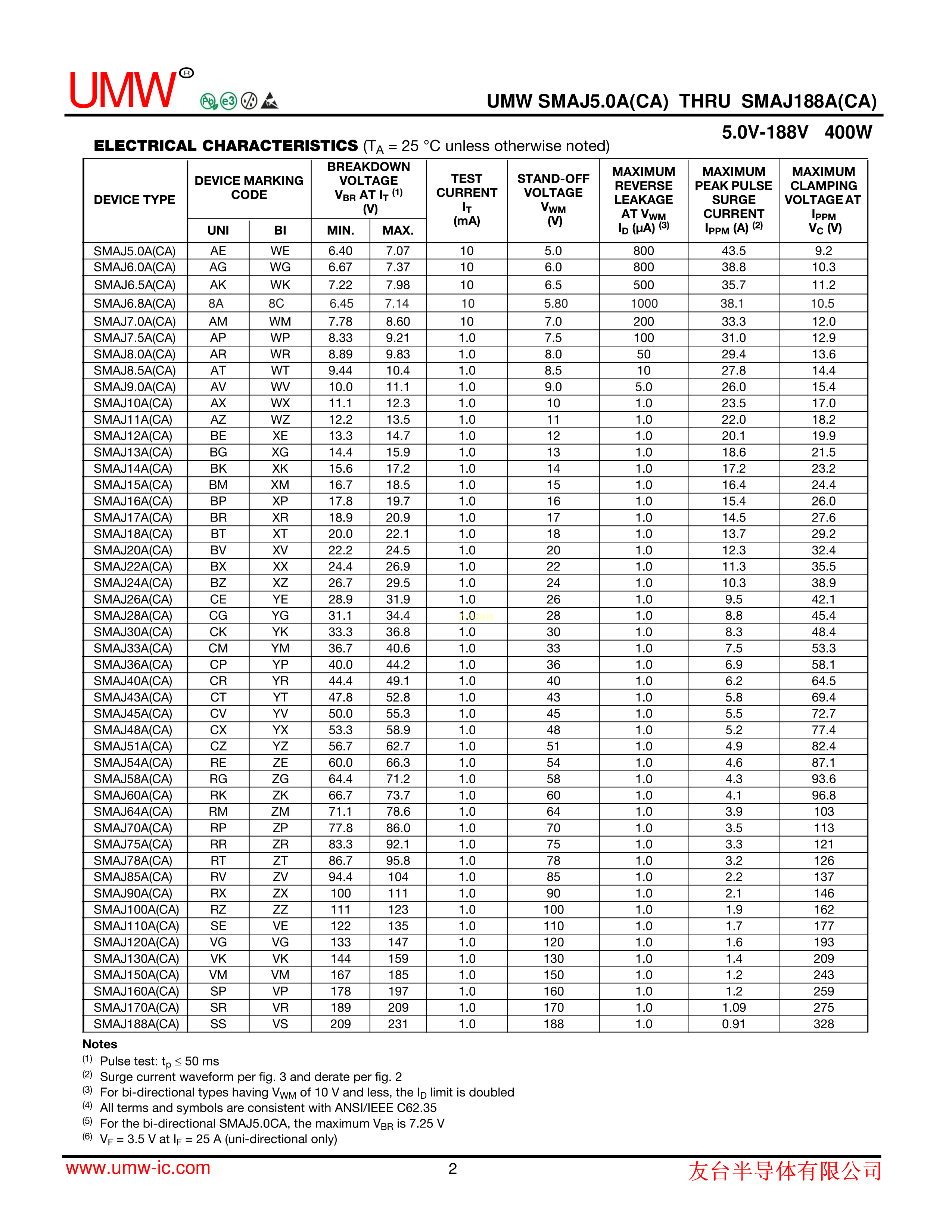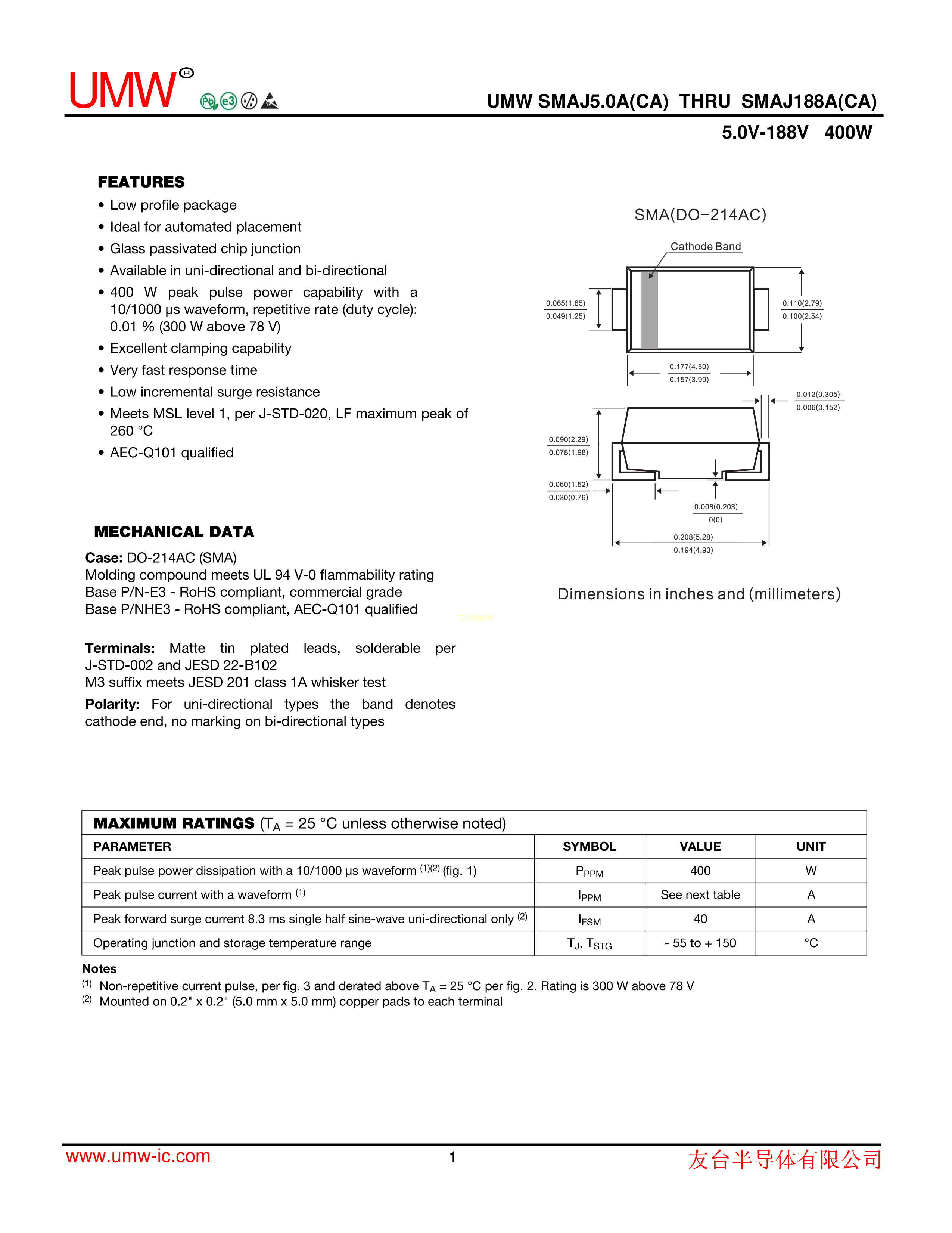 SMAJ24A数据手册SMA封装UMW(友台半导体)PDF规格书,中英文下载