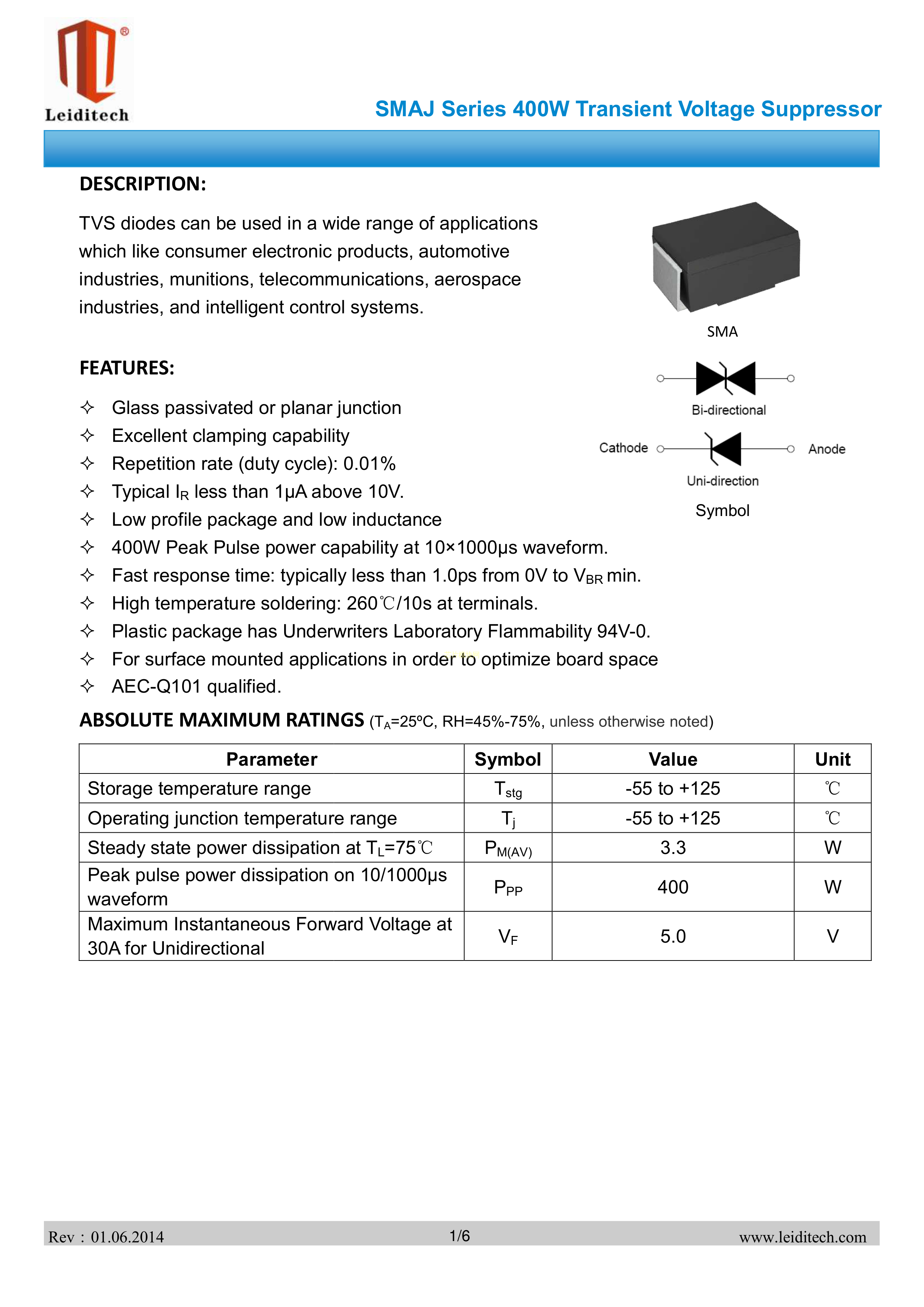SMAJ36CA数据手册SMA封装Leiditech(雷卯电子)PDF规格书,中英文下载