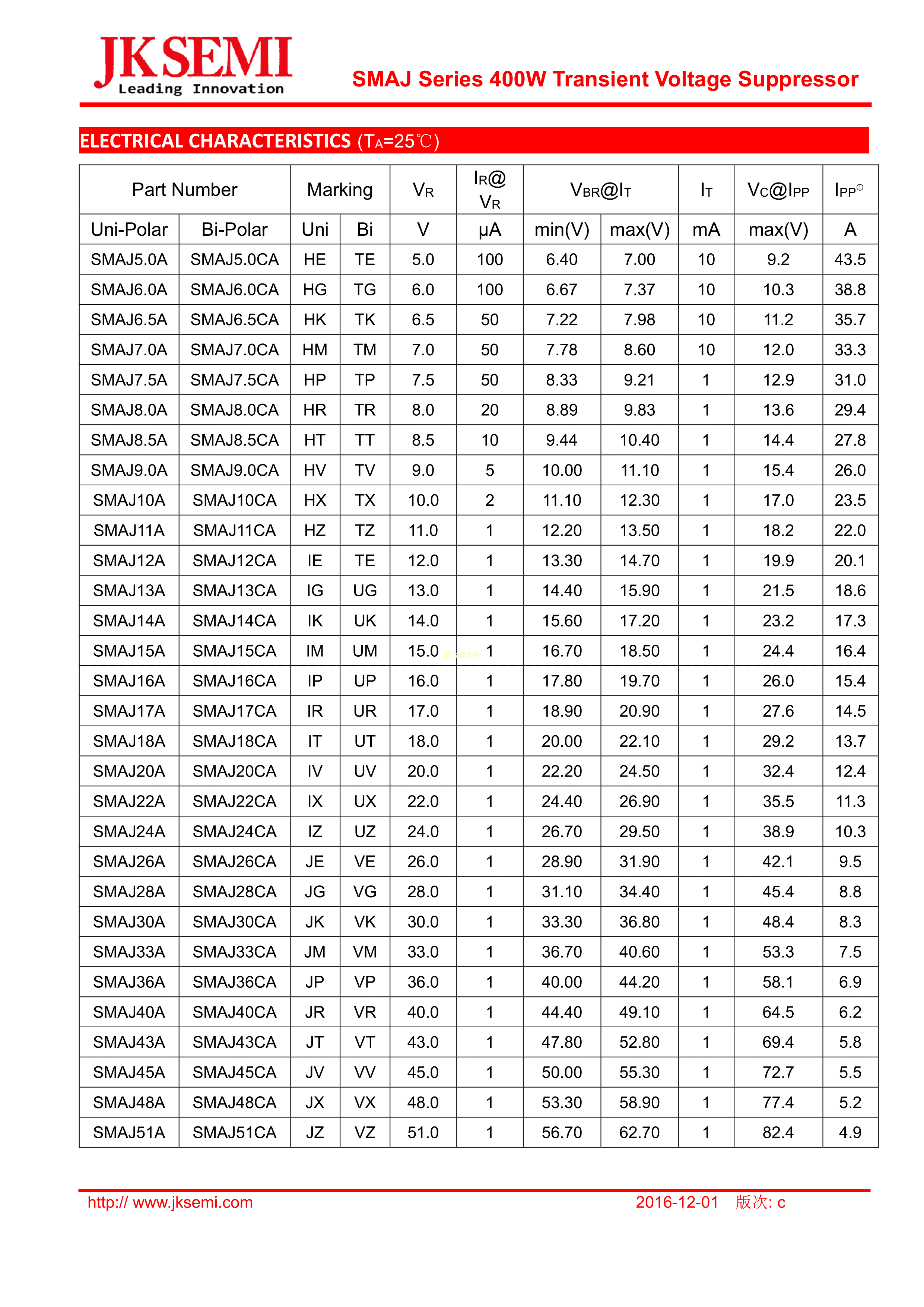 SMAJ45CA数据手册SMA(DO-214AC)封装JKSEMI(金开盛)PDF规格书,中英文下载