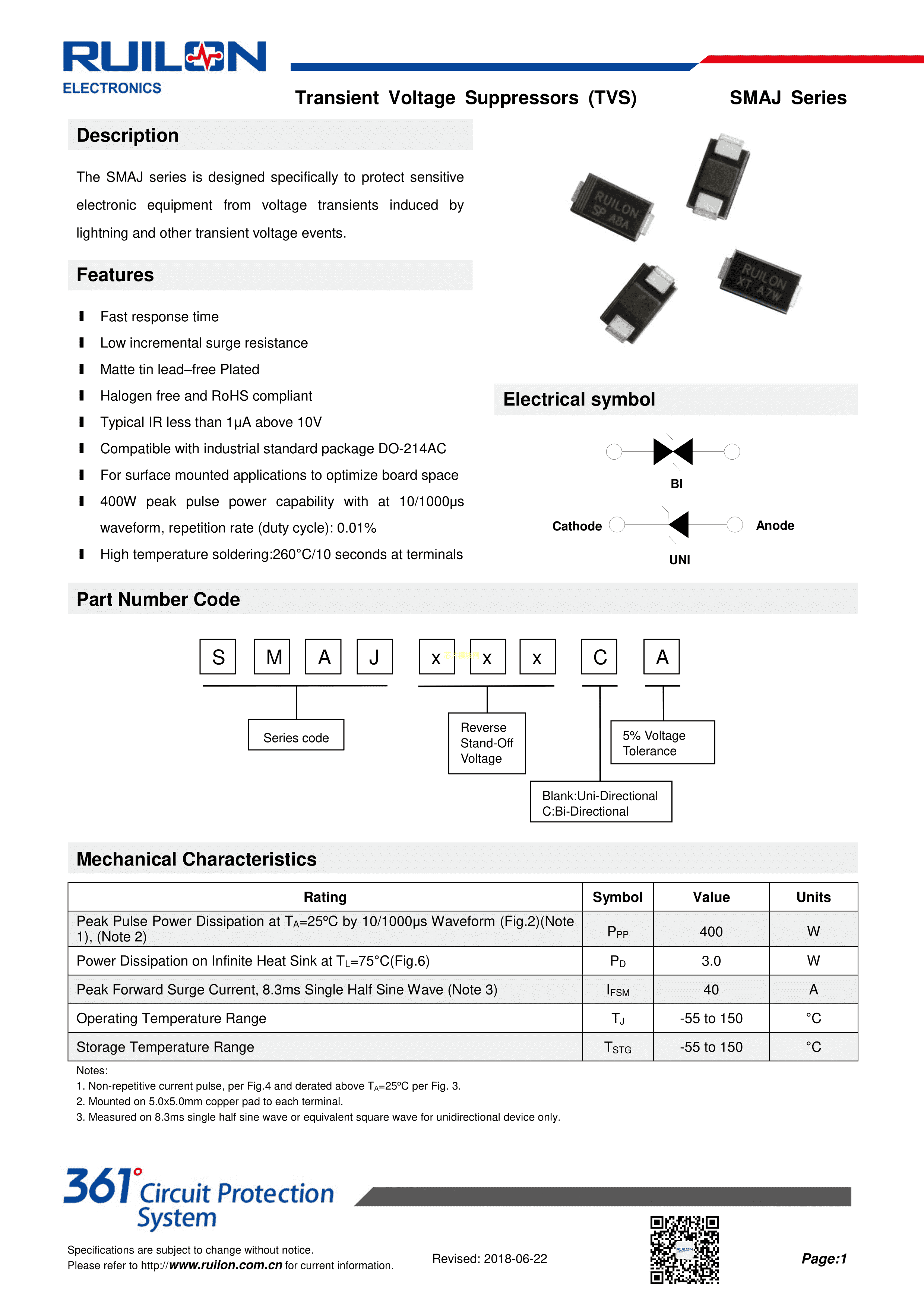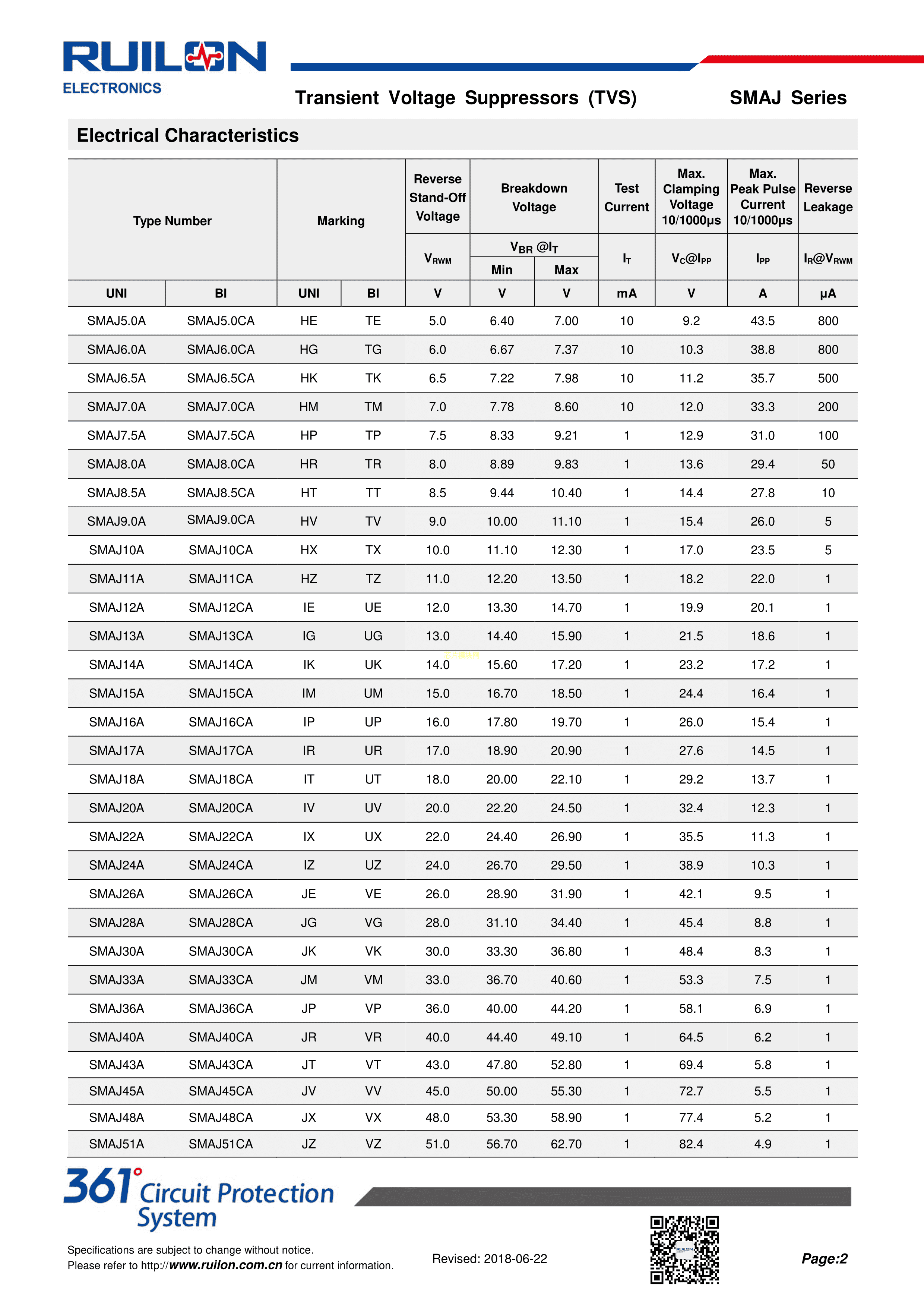 SMAJ6.5A数据手册SMA封装RUILON(瑞隆源)PDF规格书,中英文下载