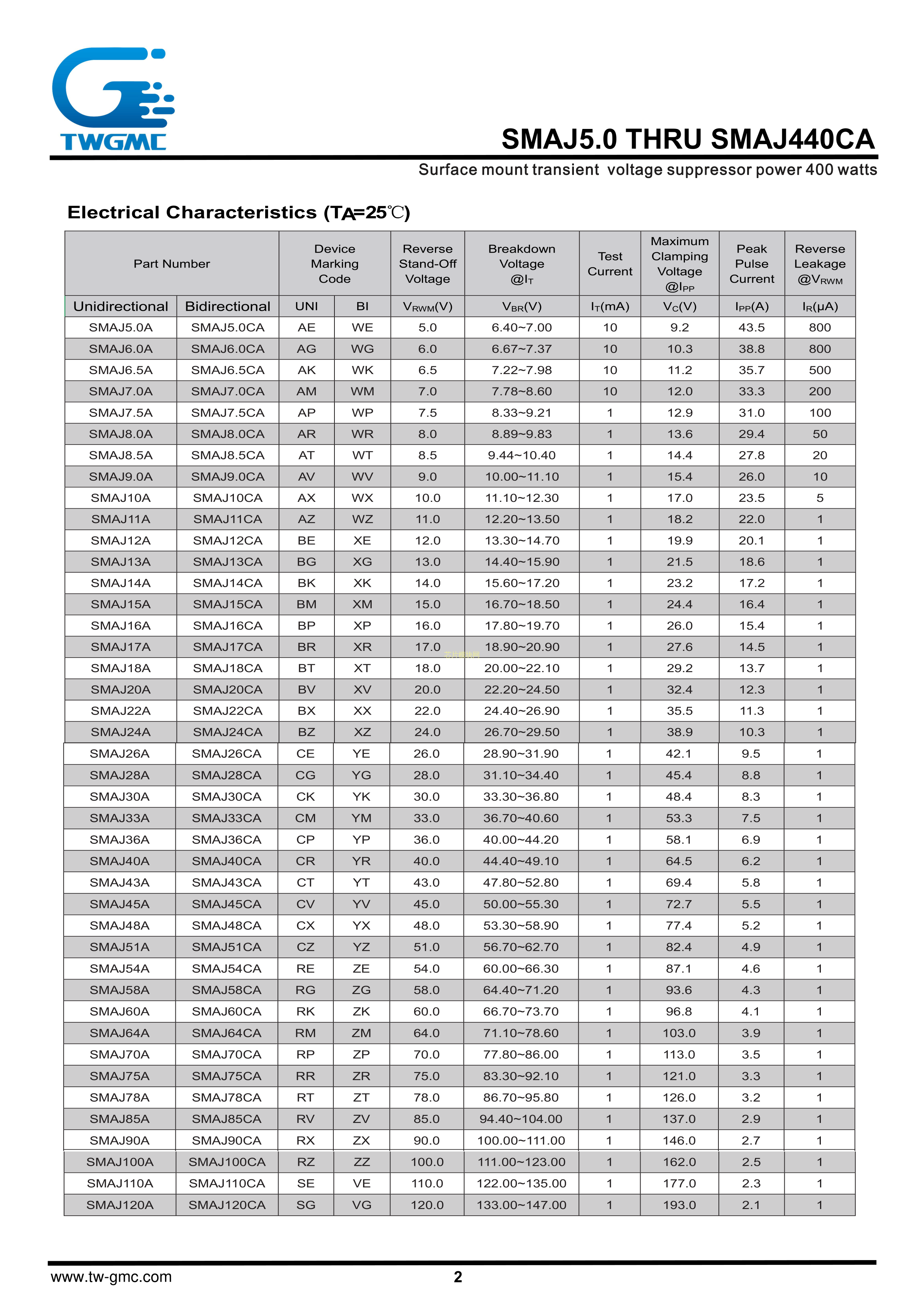 SMAJ6.5CA数据手册SMA封装TWGMC(台湾迪嘉)PDF规格书,中英文下载