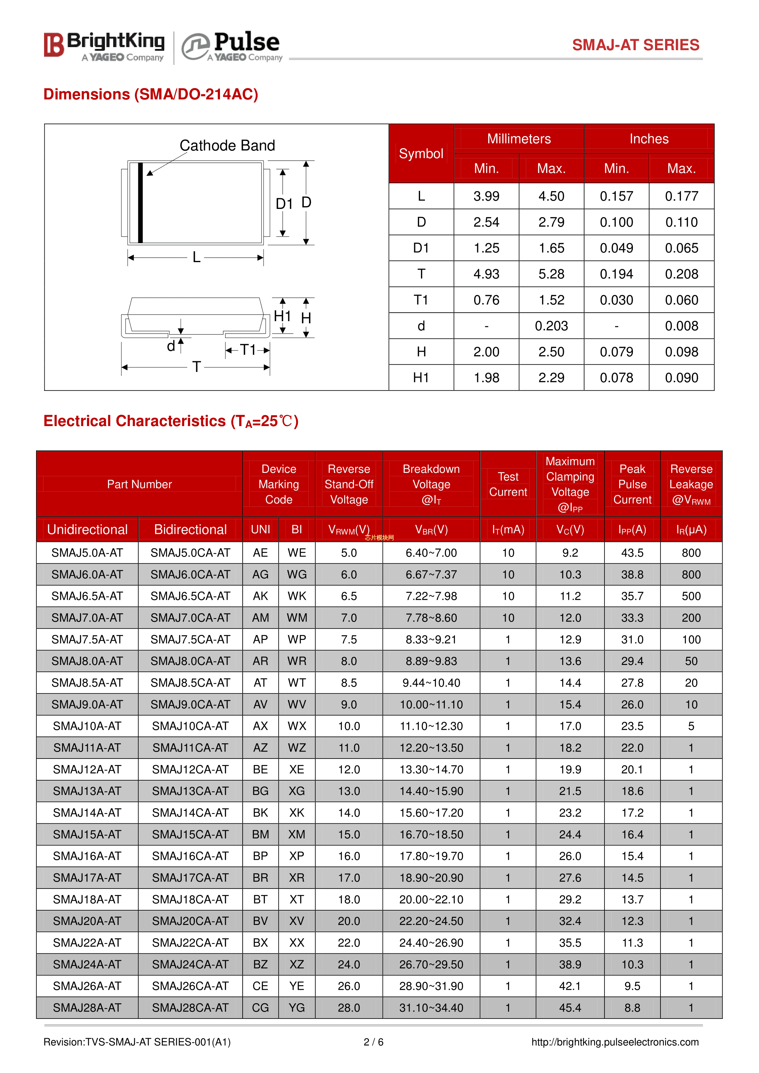 SMAJ6.5CA-AT数据手册SMA(DO-214AC)封装Brightking(台湾君耀)PDF