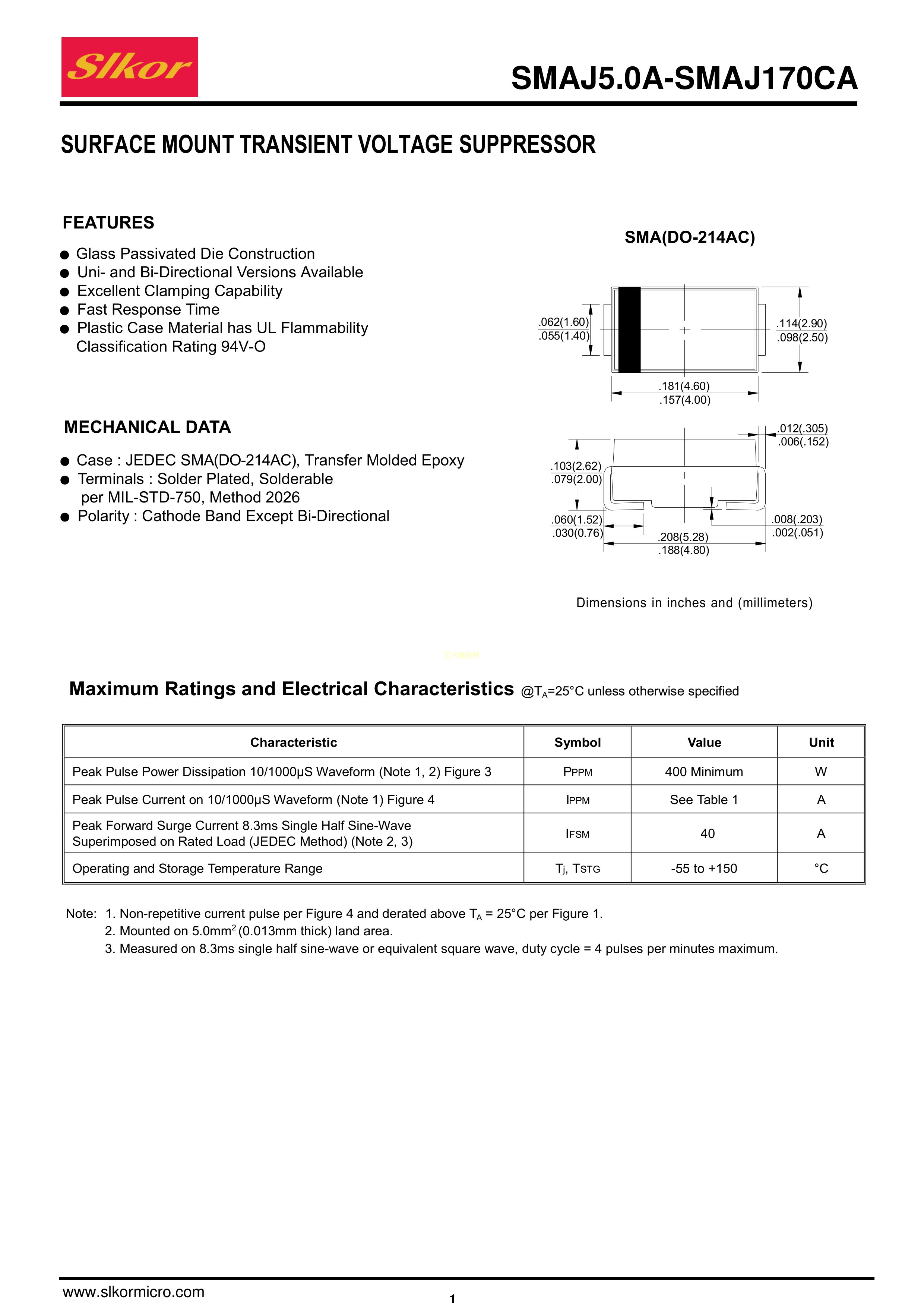 SMAJ6.8CA数据手册SMA封装Slkor(萨科微)PDF规格书,中英文下载