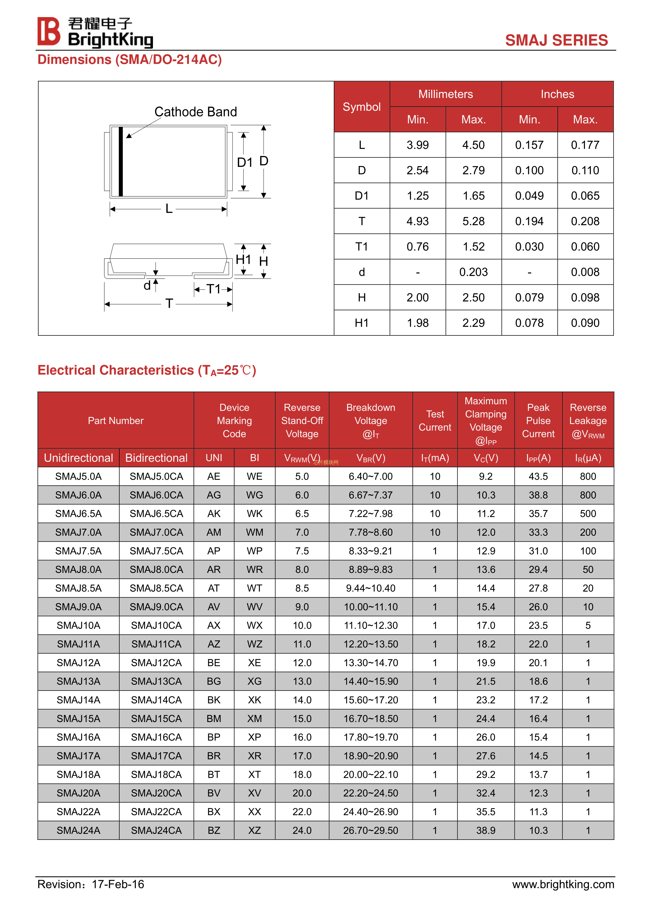 SMAJ60CA数据手册SMA(DO-214AC)封装Brightking(台湾君耀)PDF规格书,
