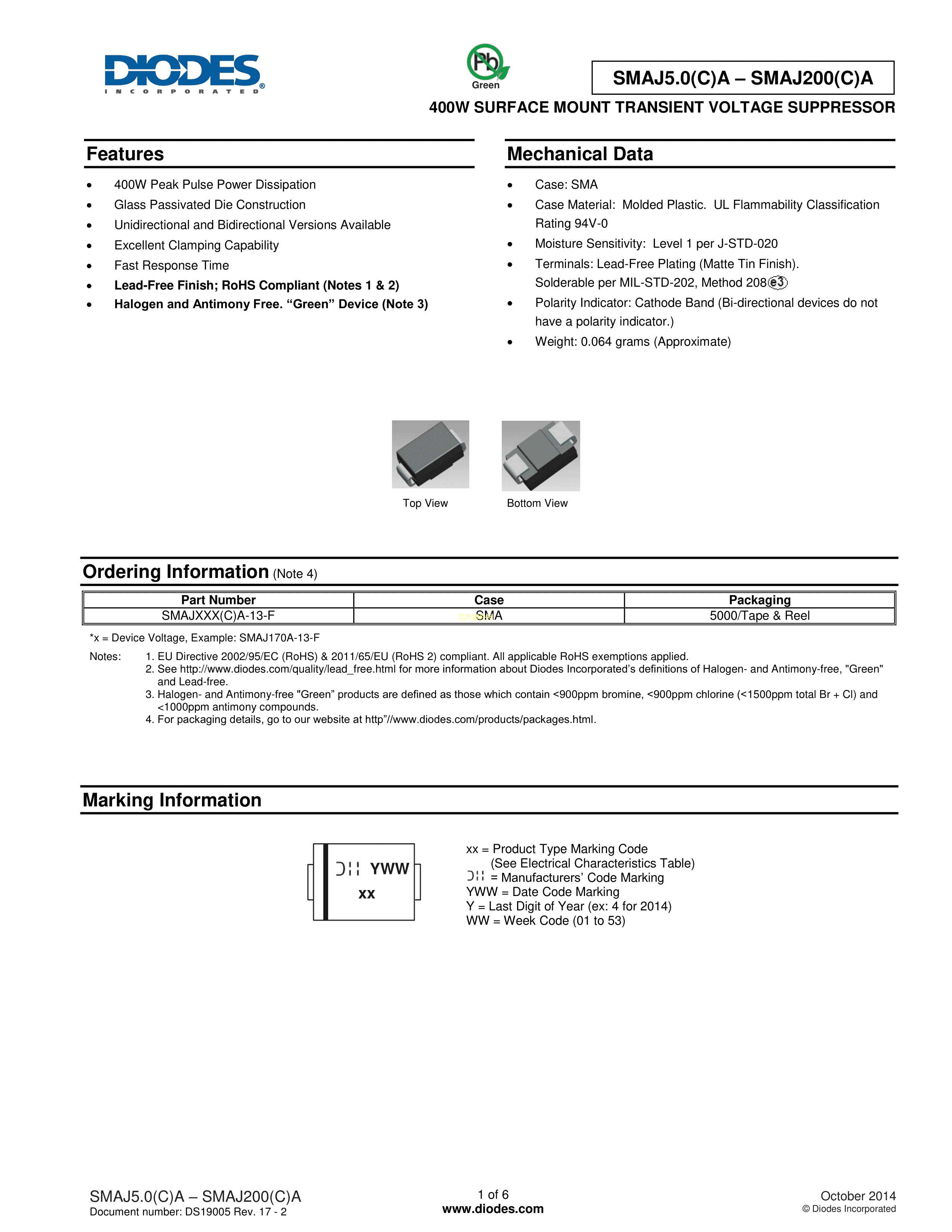 SMAJ7.5A-13-F数据手册SMA(DO-214AC)封装DIODES(美台)PDF规格书,中