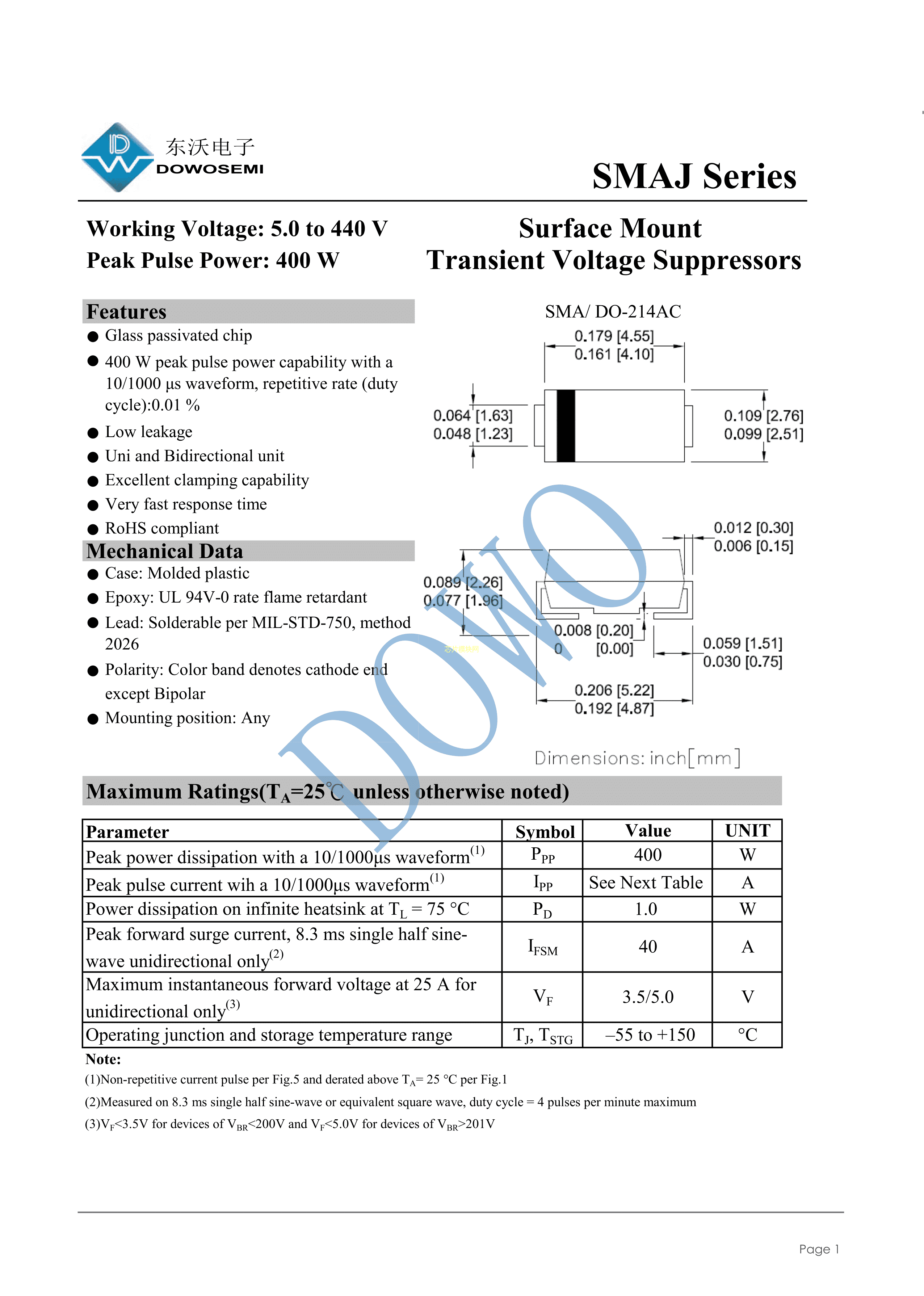 SMAJ75A数据手册SMA(DO-214AC)封装DOWO(东沃)PDF规格书,中英文下载