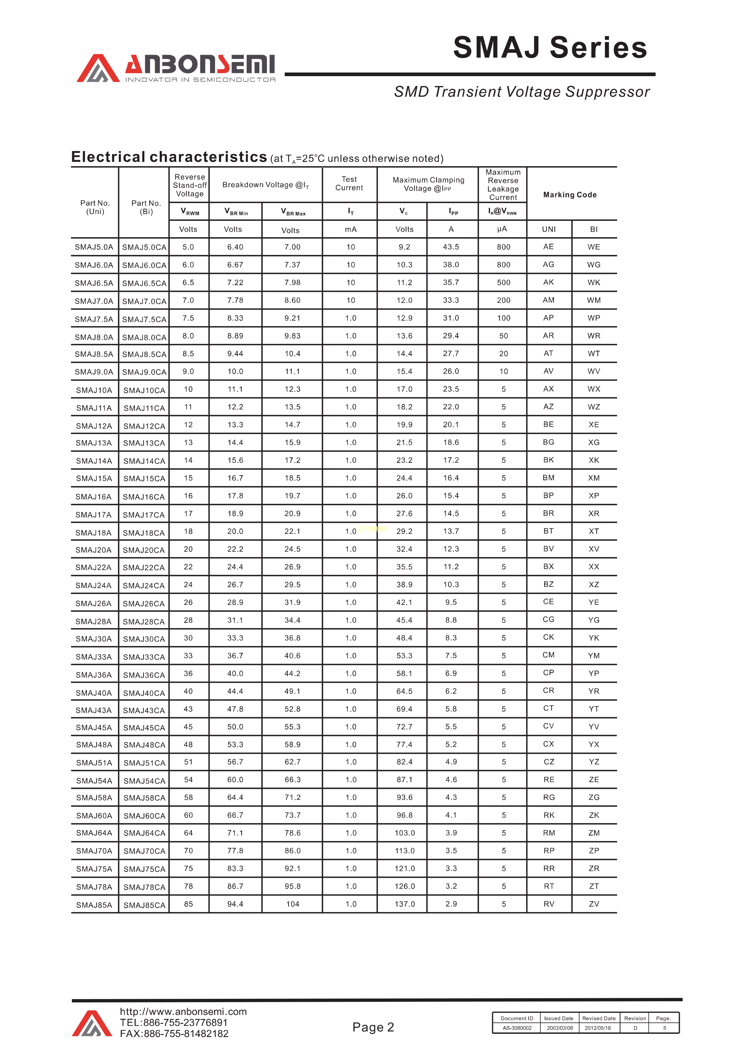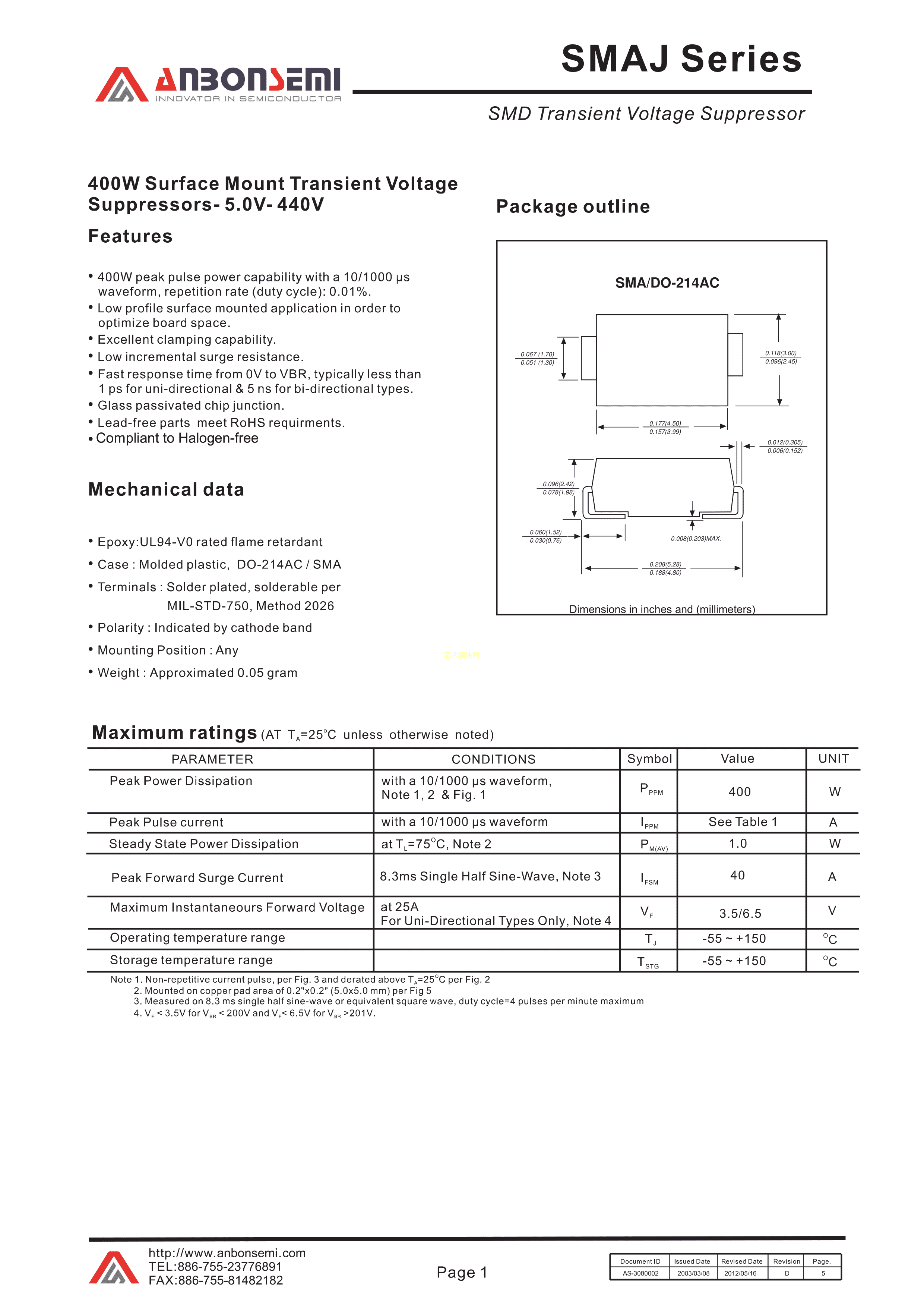 SMAJ9.0A数据手册SMA封装AnBon(台湾安邦)PDF规格书,中英文下载