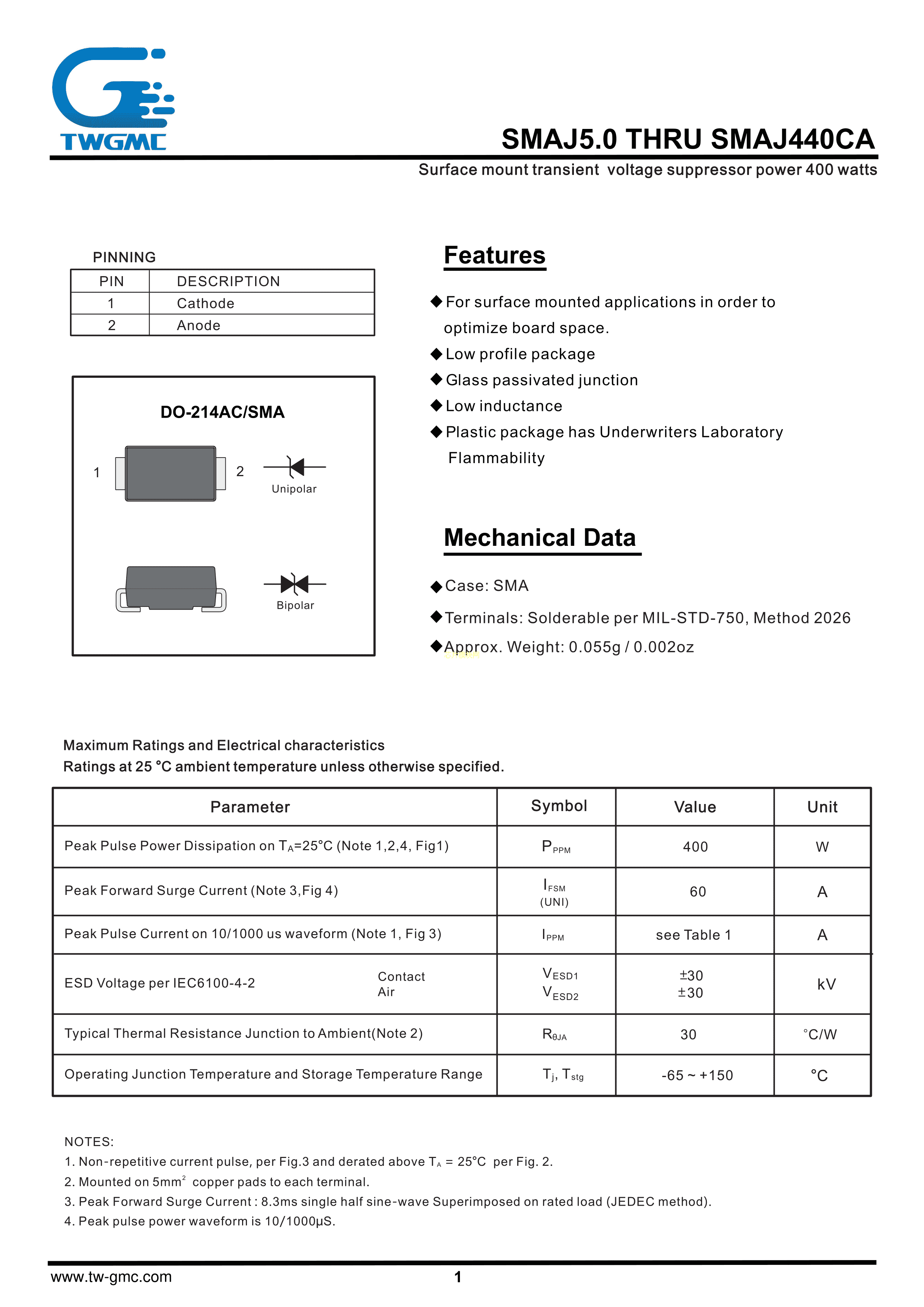 SMAJ9.0A数据手册SMA封装TWGMC(台湾迪嘉)PDF规格书,中英文下载