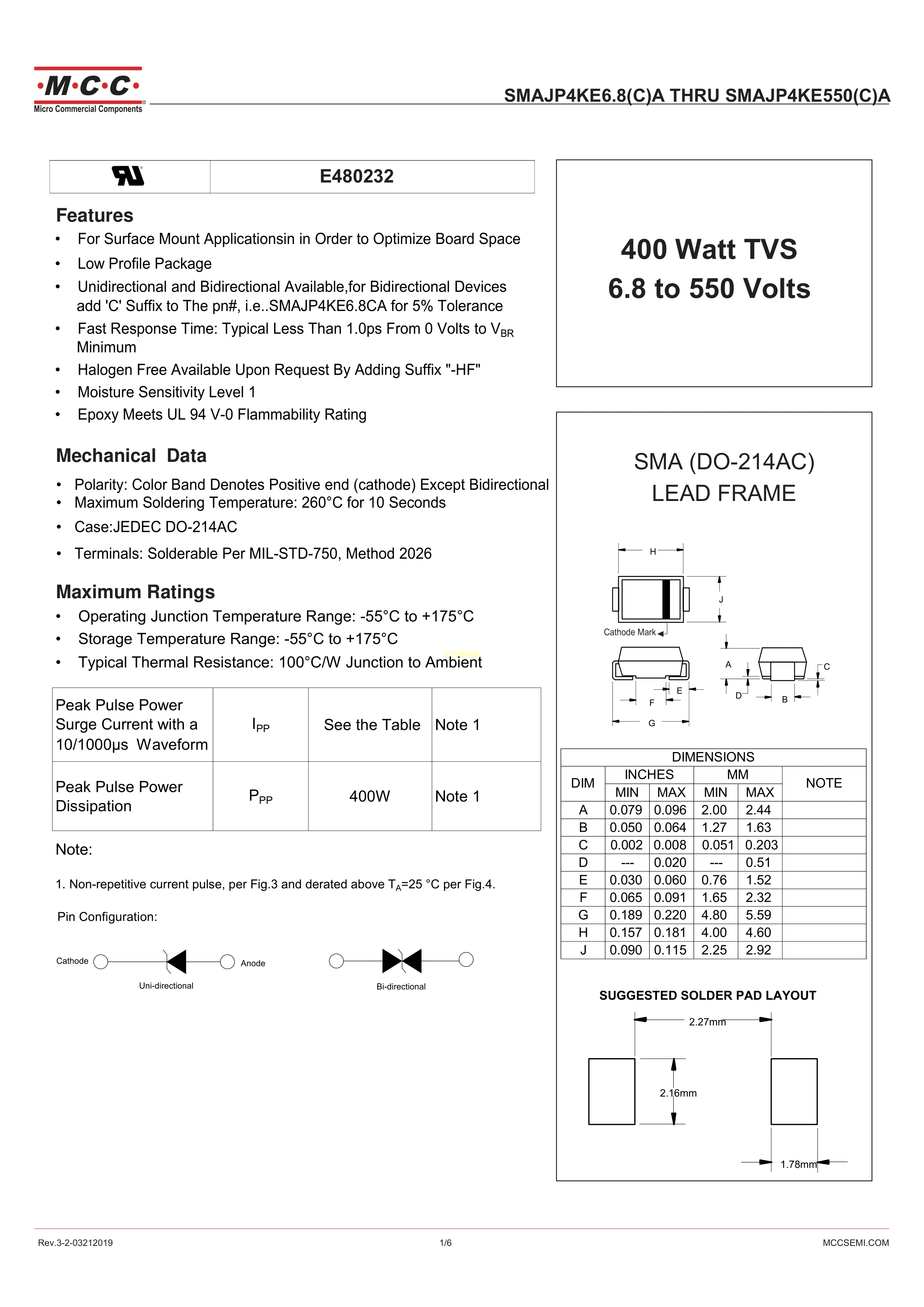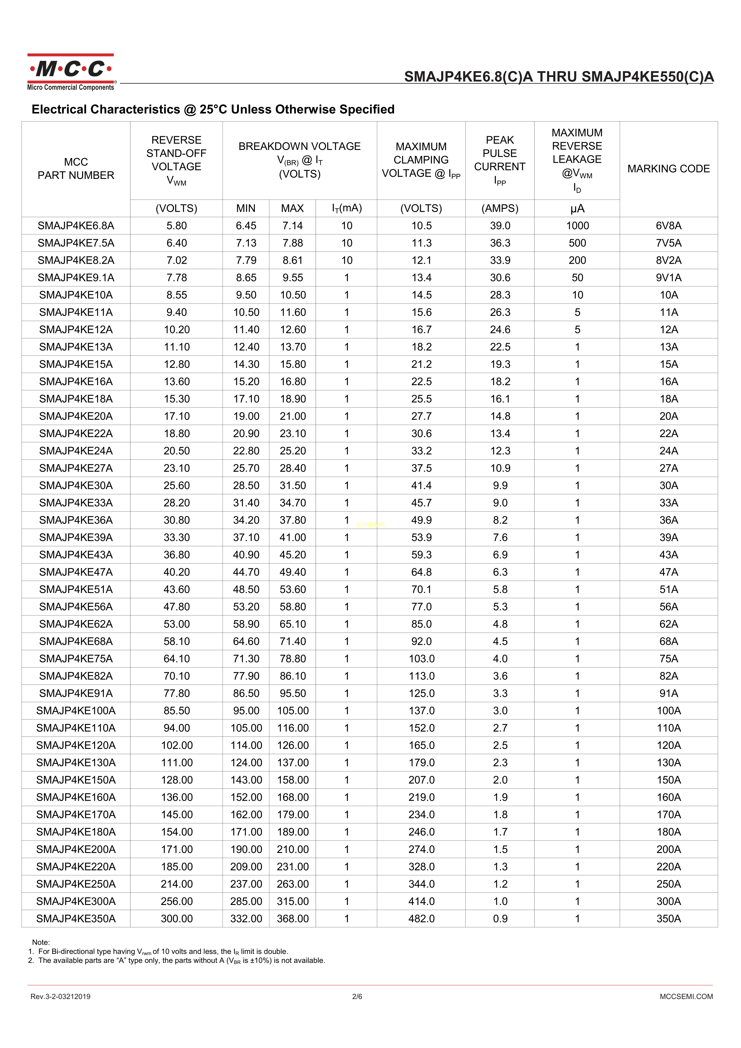 SMAJP4KE300A-TP数据手册SMA封装MCC(美微科)PDF规格书,中英文下载
