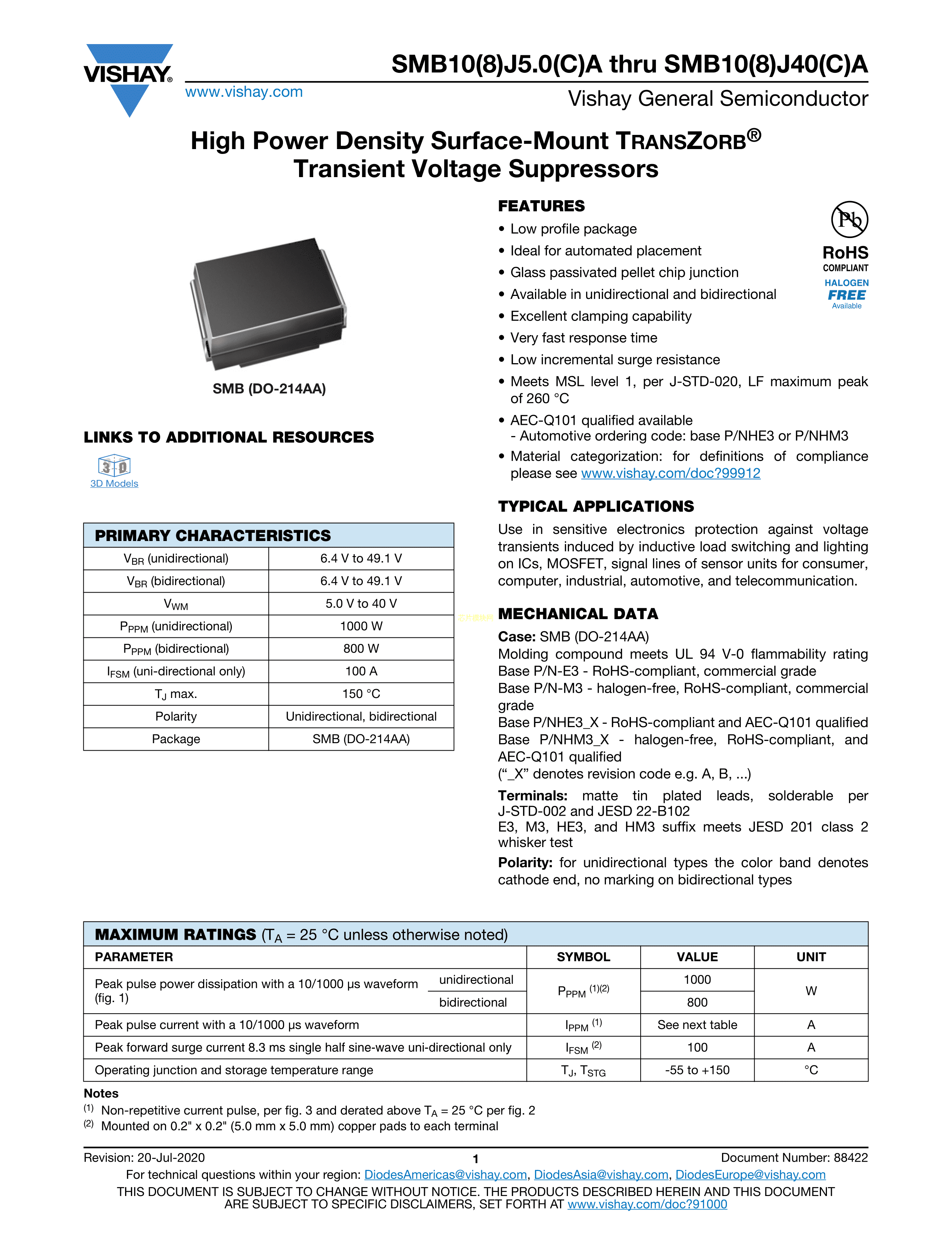 SMB8J40CA-E3-5B数据手册SMB(DO-214AA)封装VISHAY(威世)PDF规格书