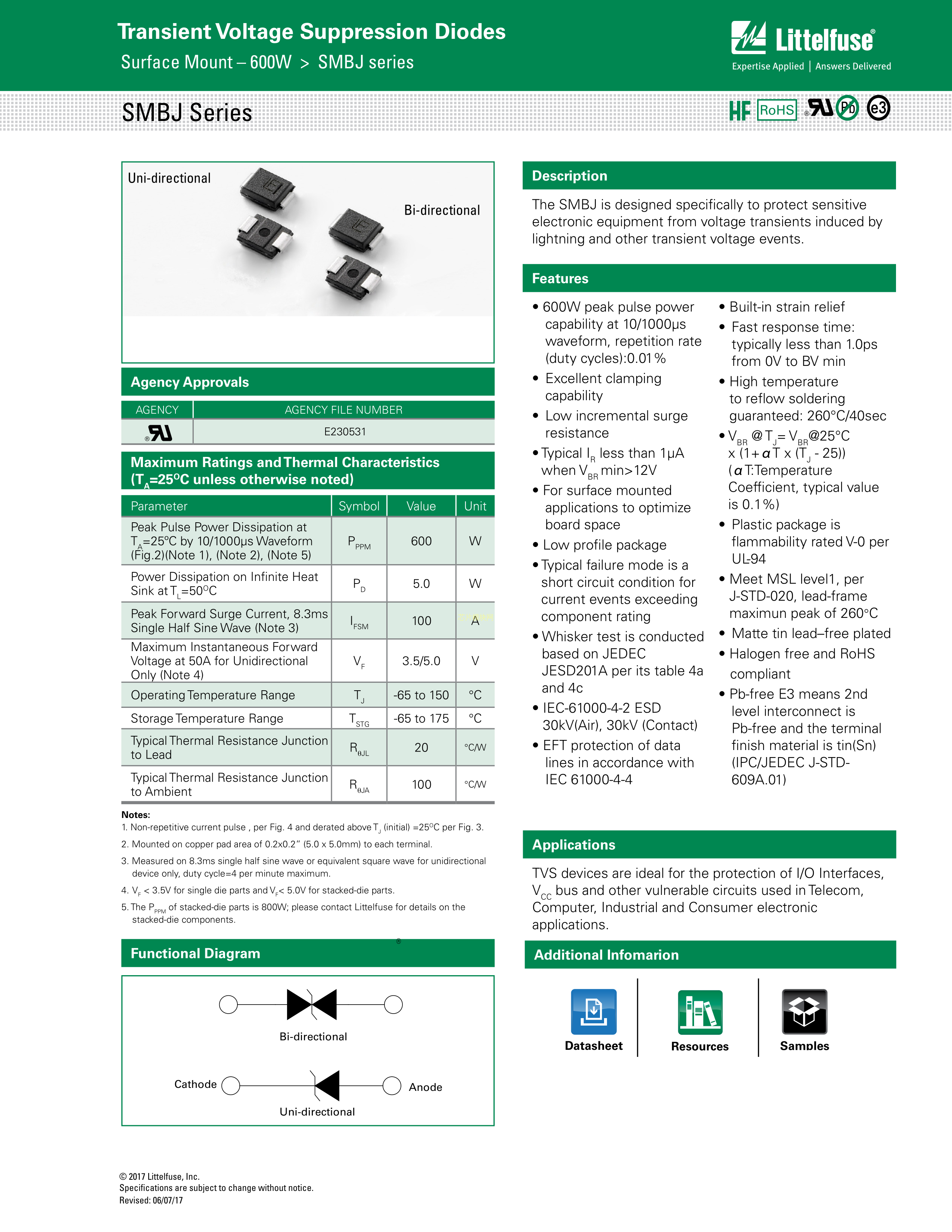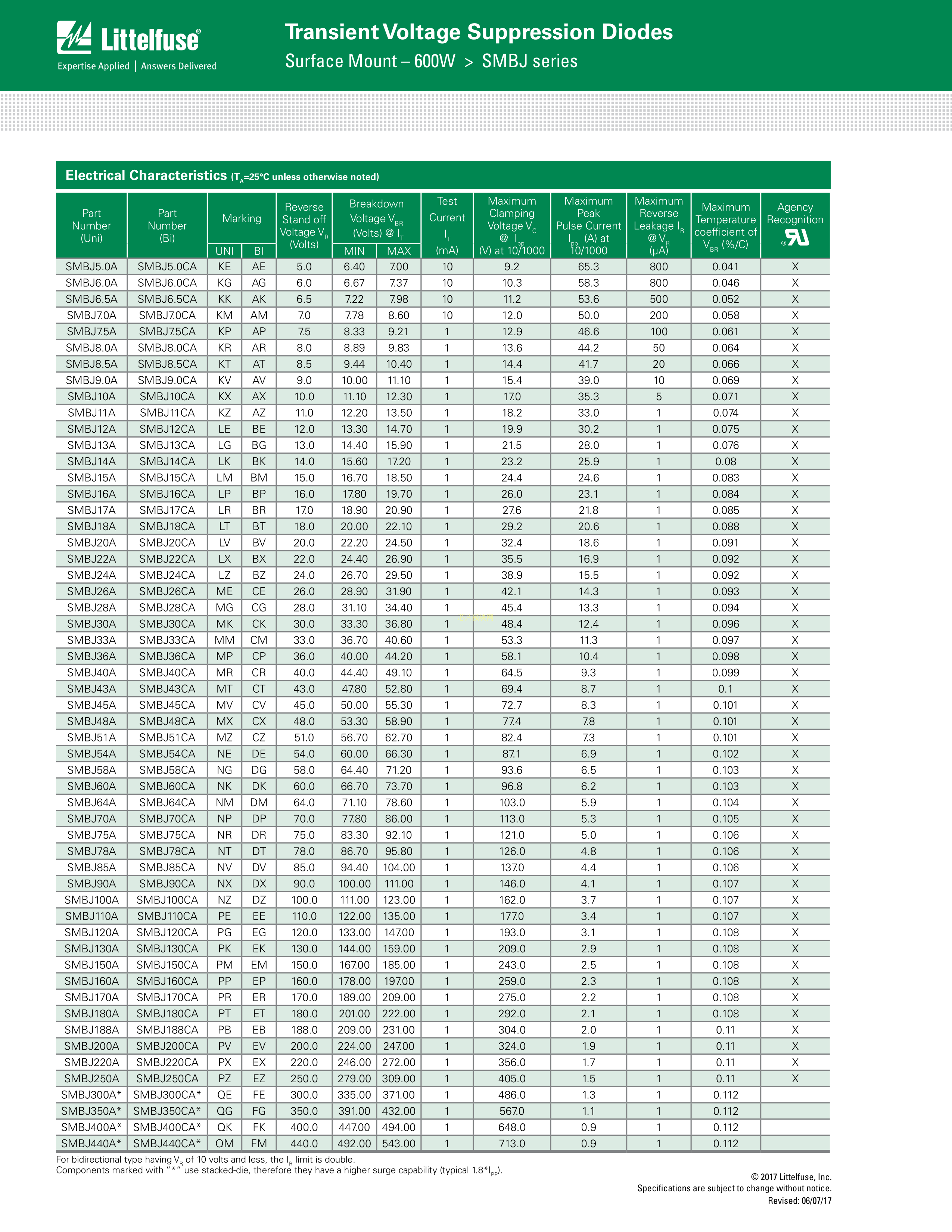 SMBJ13A数据手册SMB(DO-214AA)封装Littelfuse(美国力特)PDF规格书,中