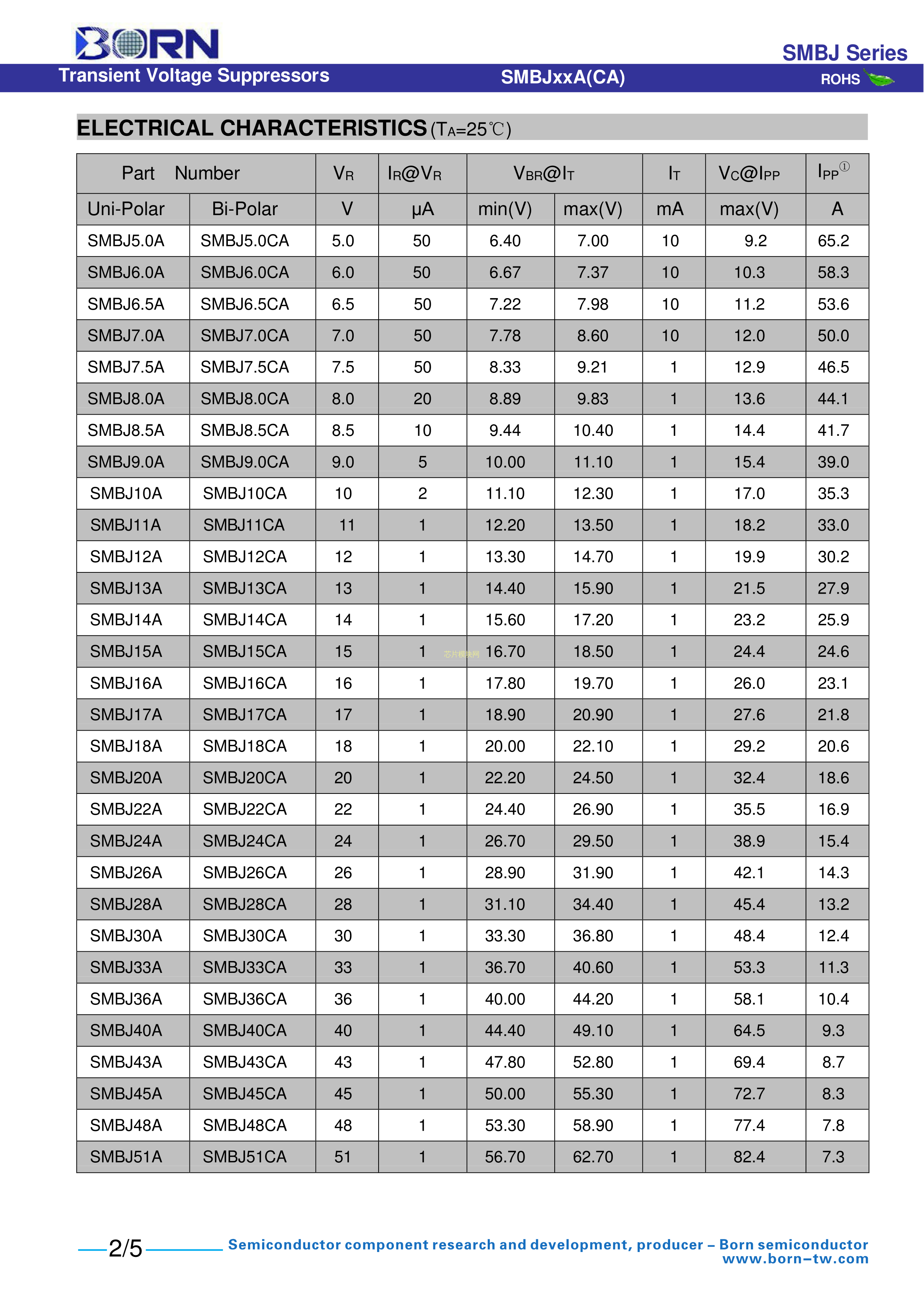 SMBJ16A数据手册SMB(DO-214AA)封装BORN(伯恩半导体)PDF规格书,中英文下载
