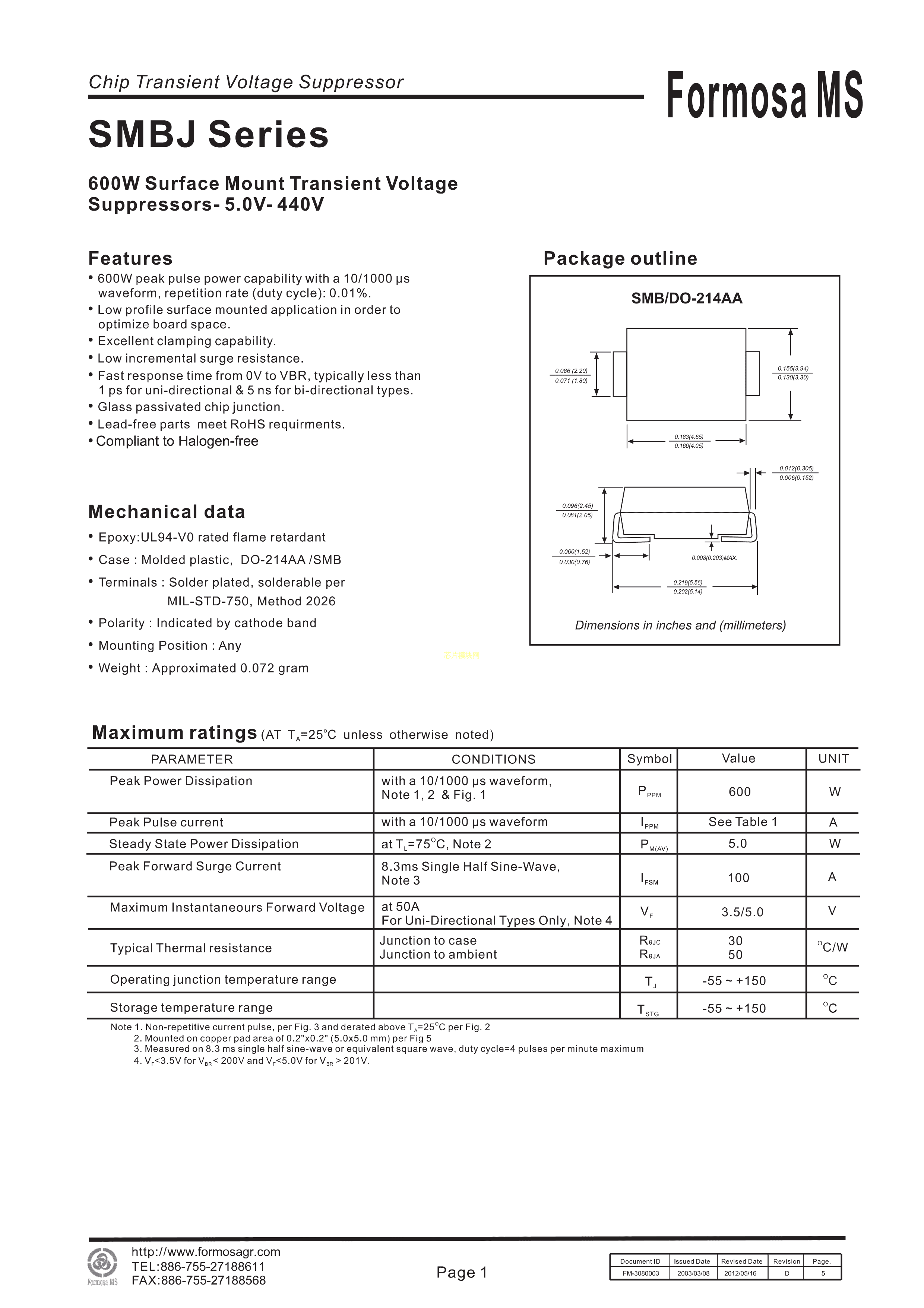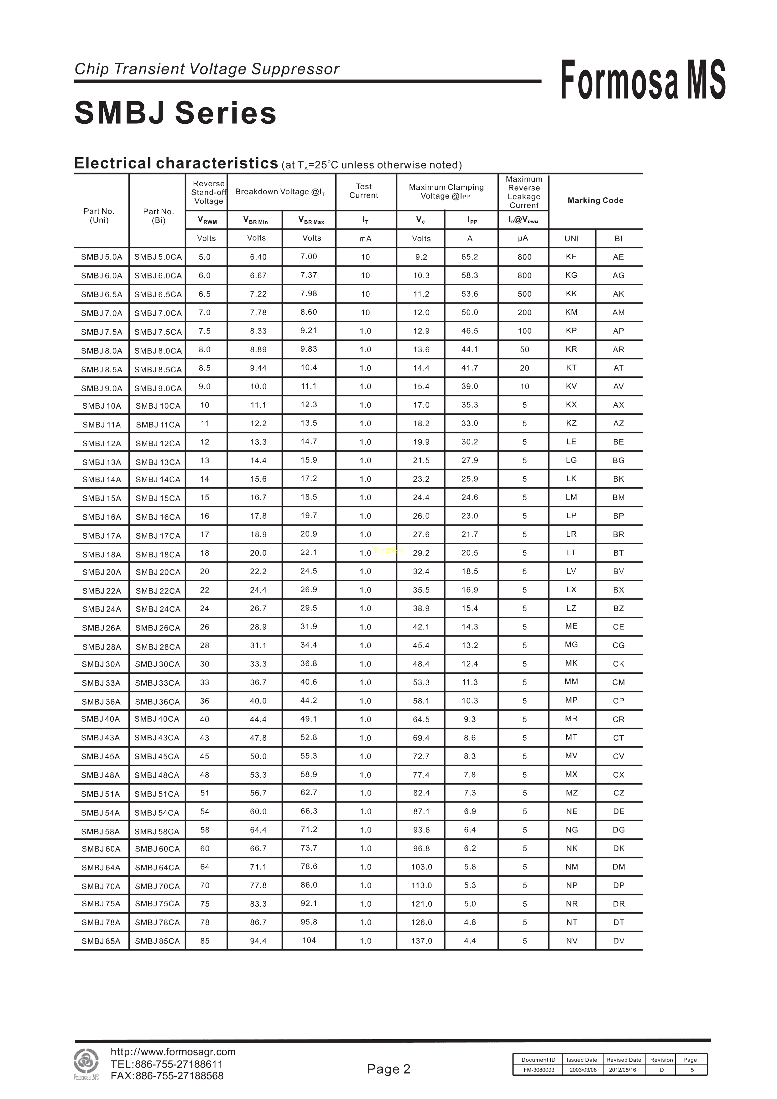 SMBJ16A数据手册SMB(DO-214AA)封装FMS(台湾美丽微)PDF规格书,中英文下载
