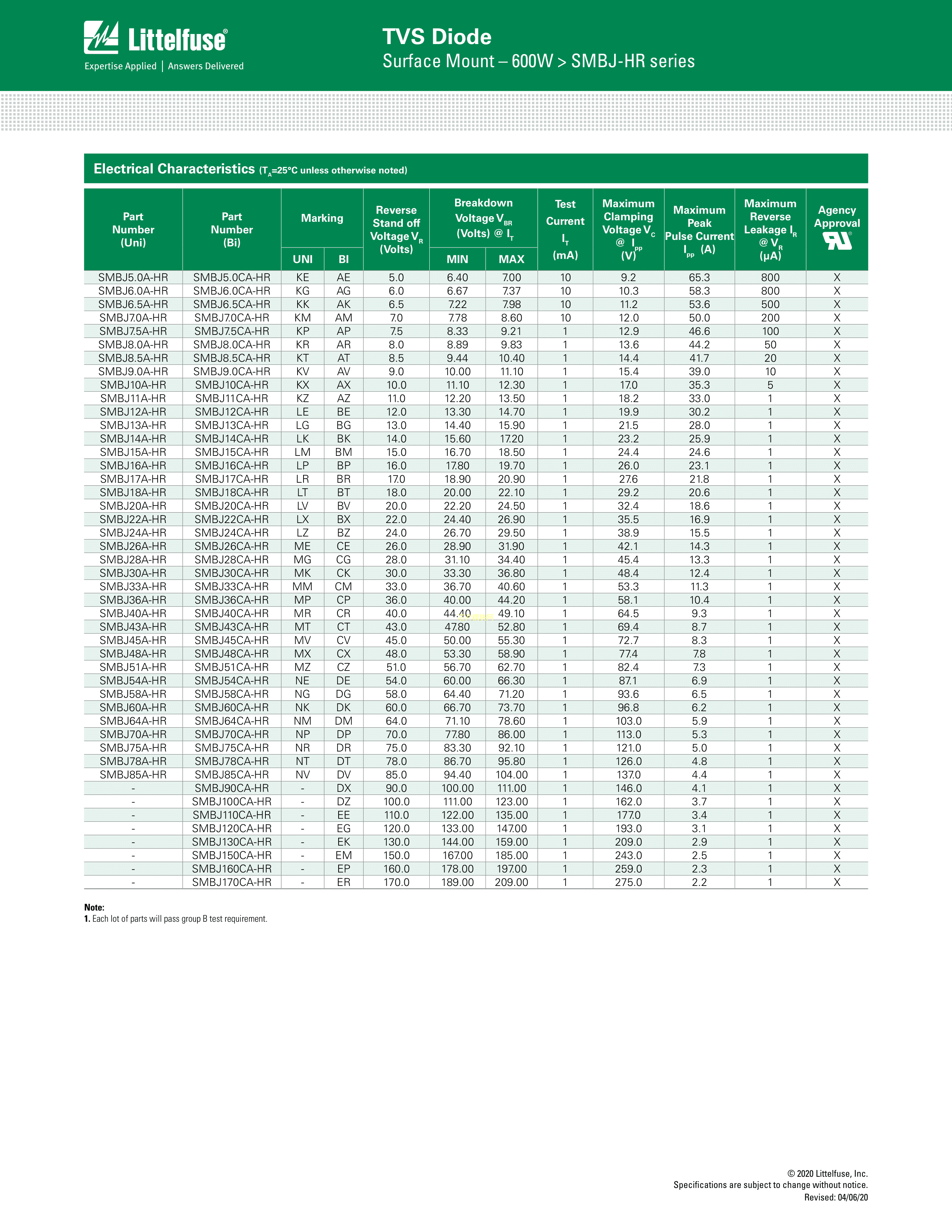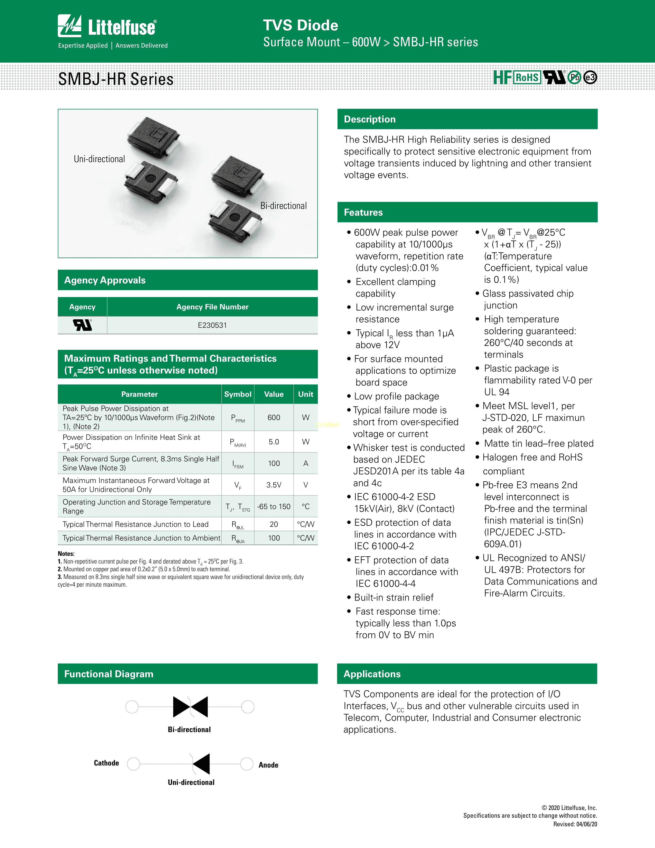 SMBJ17CA-HR数据手册DO-214AA(SMBJ)封装Littelfuse(美国力特)PDF