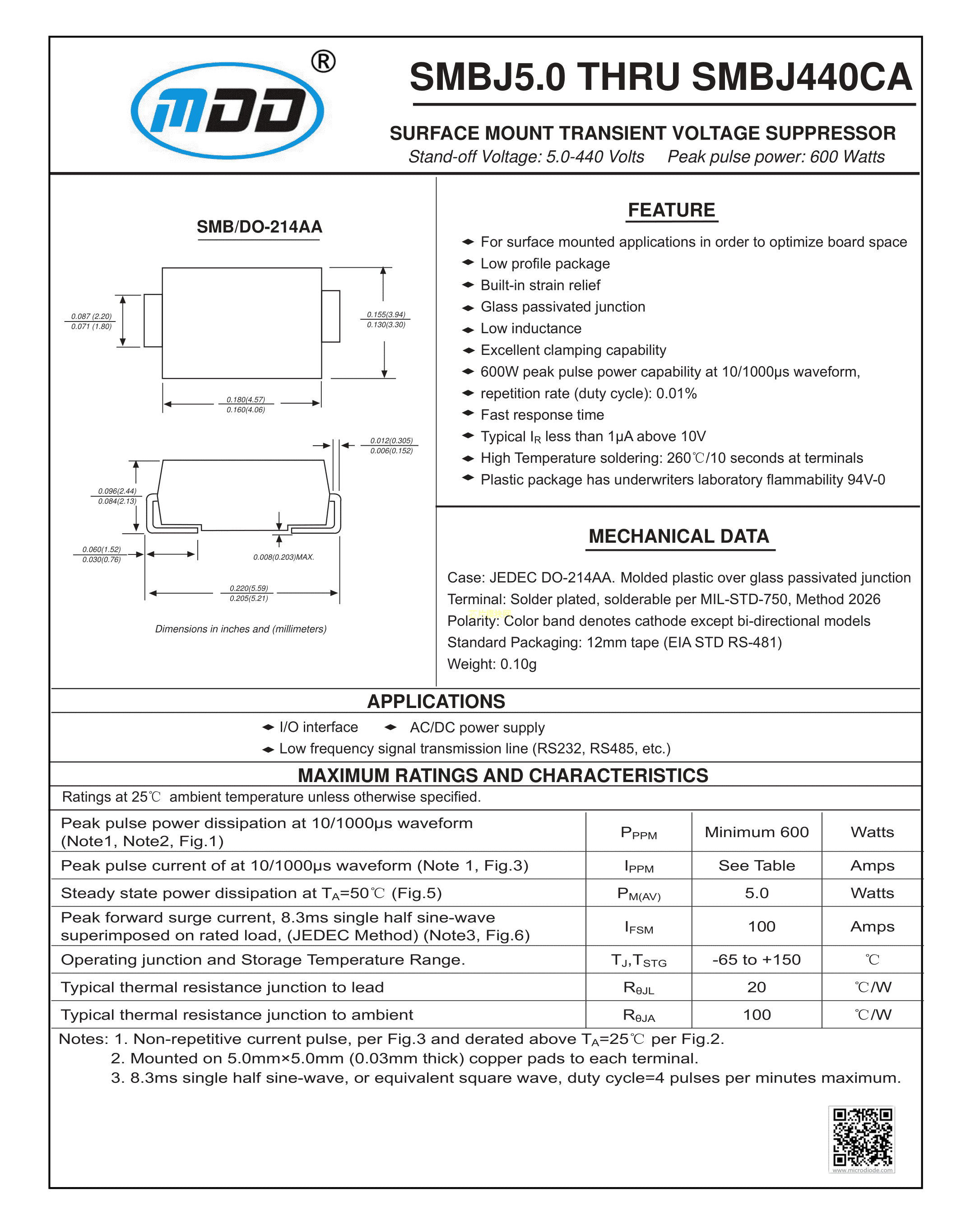 SMBJ190CA数据手册SMB(DO-214AA)封装MDDPDF规格书,中英文下载