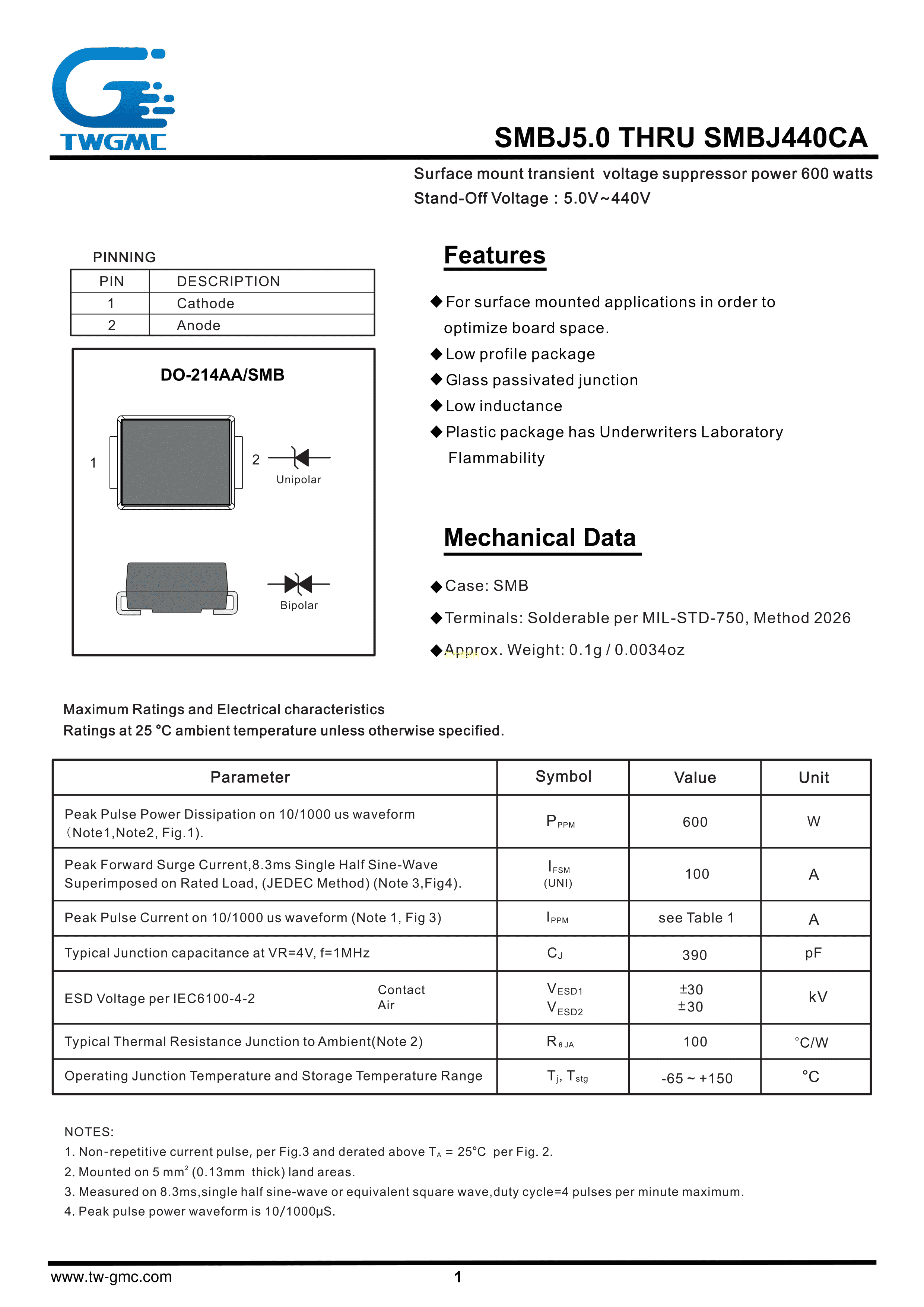 SMBJ20A数据手册SMB封装TWGMC(台湾迪嘉)PDF规格书,中英文下载
