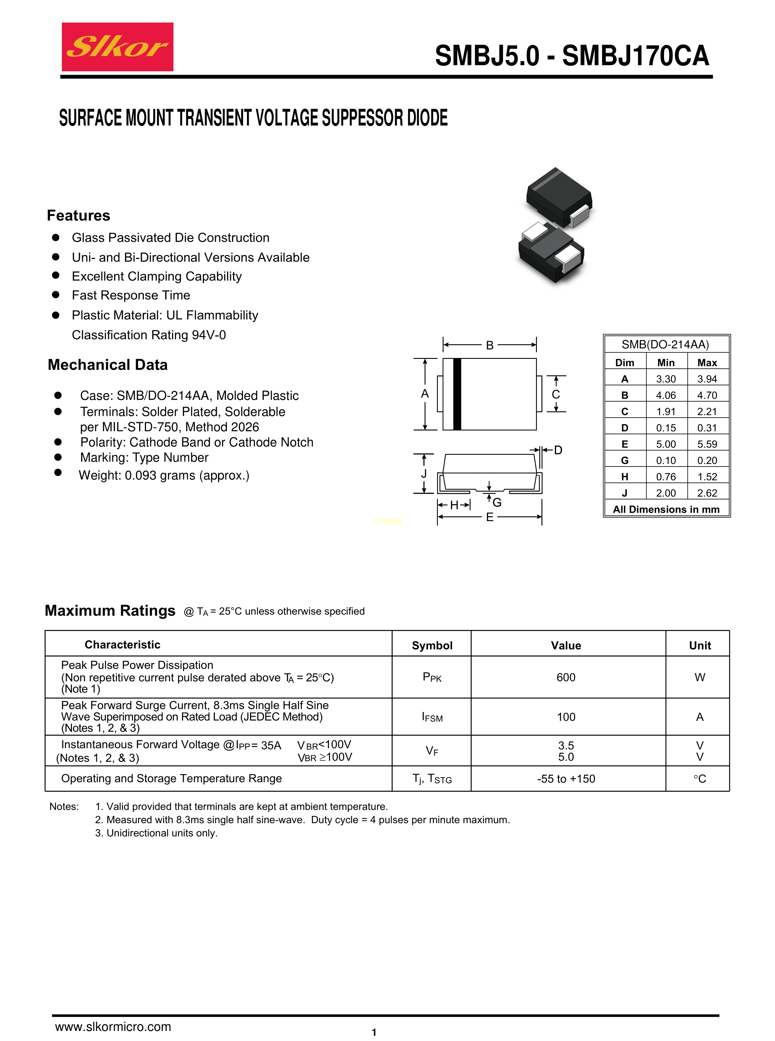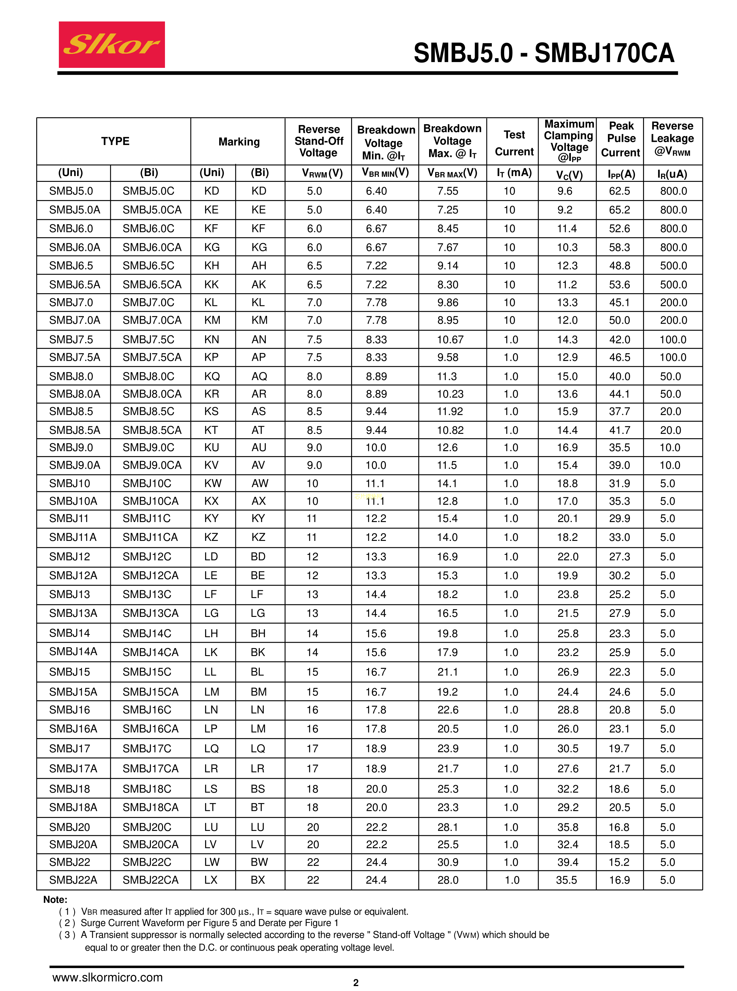 SMBJ22CA数据手册SMB封装Slkor(萨科微)PDF规格书,中英文下载