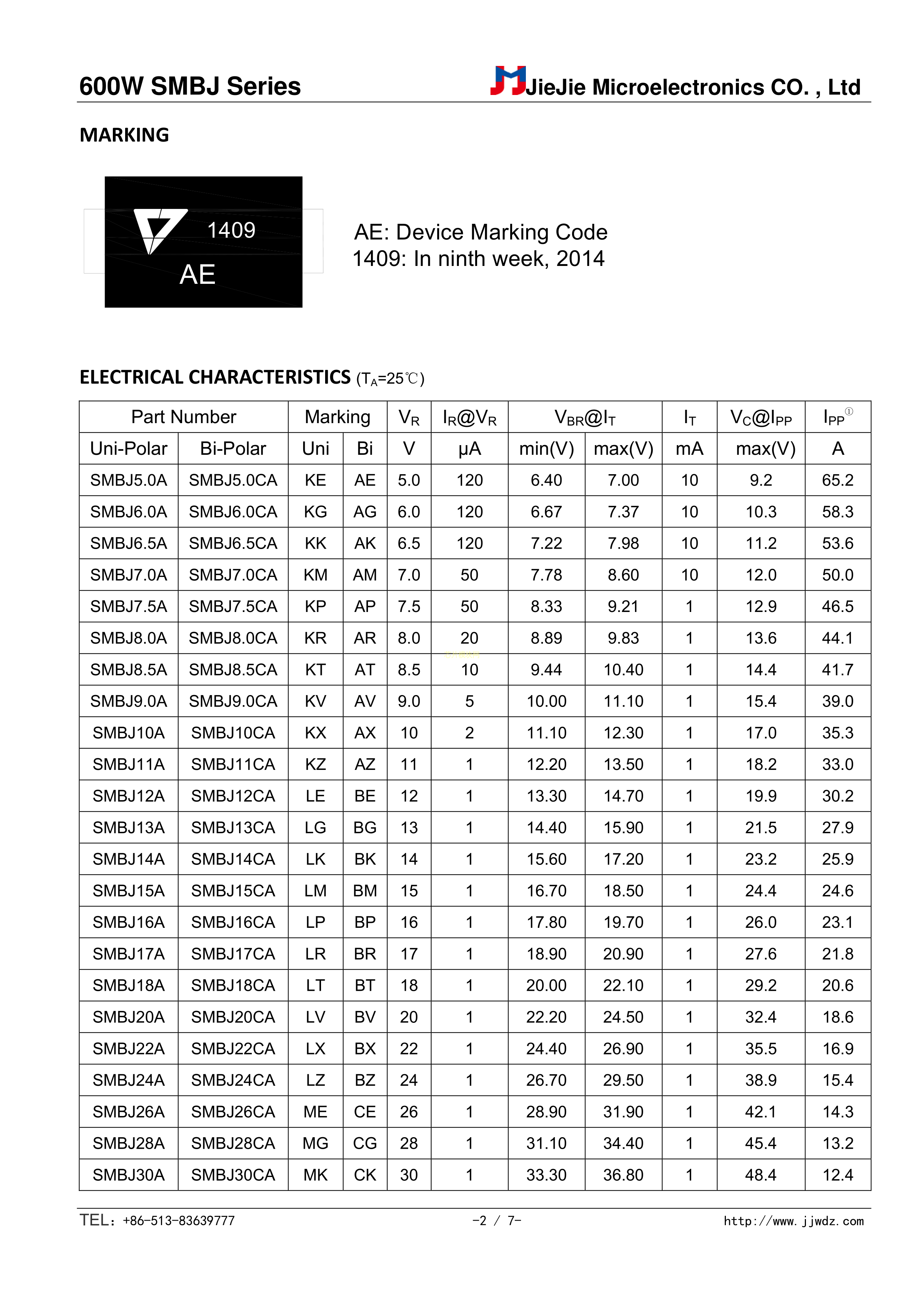 SMBJ28CA数据手册SMB(DO-214AA)封装JJW(捷捷微)PDF规格书,中英文下载