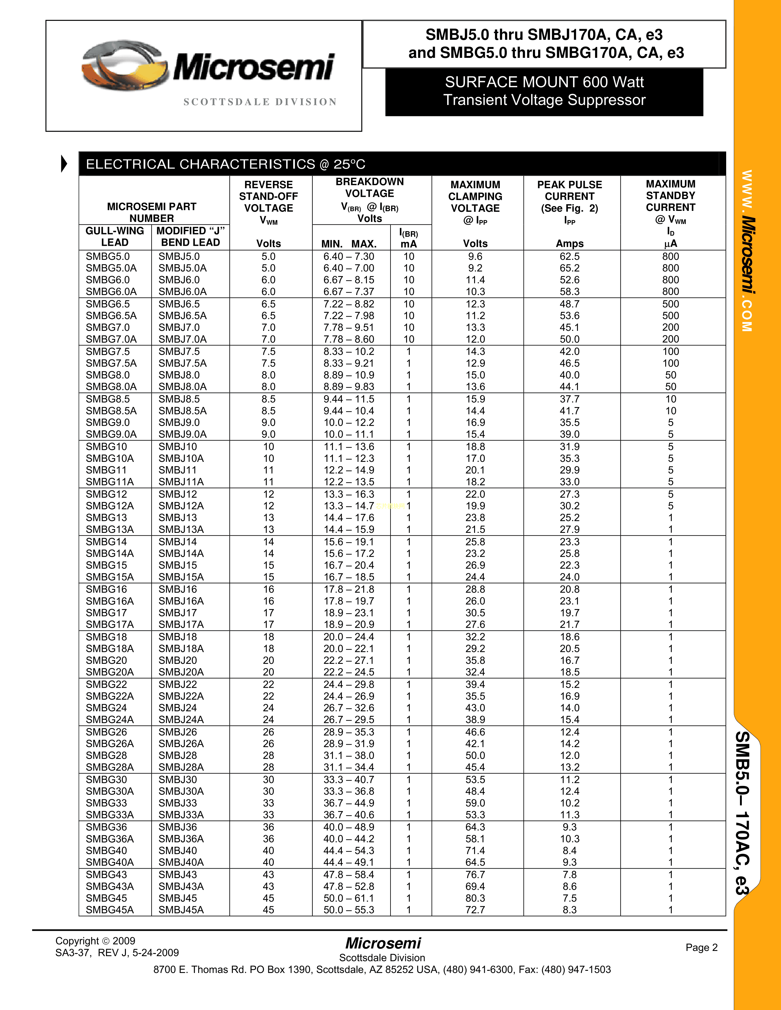 SMBJ28CAE3-TR13数据手册SMBJ(DO-214AA)封装Microsemi(美高森美)