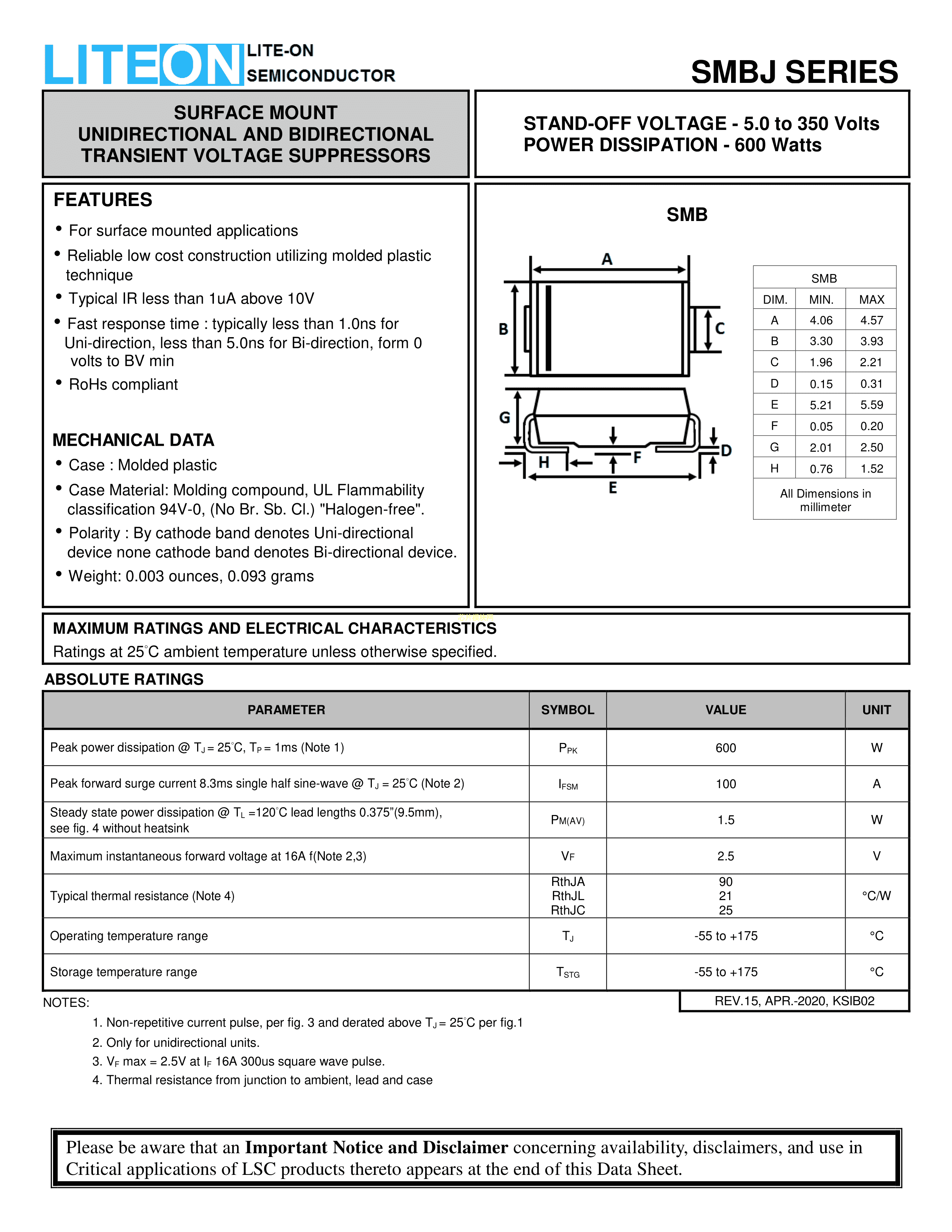 SMBJ33CA数据手册SMB封装LITEON(台湾敦南)PDF规格书,中英文下载
