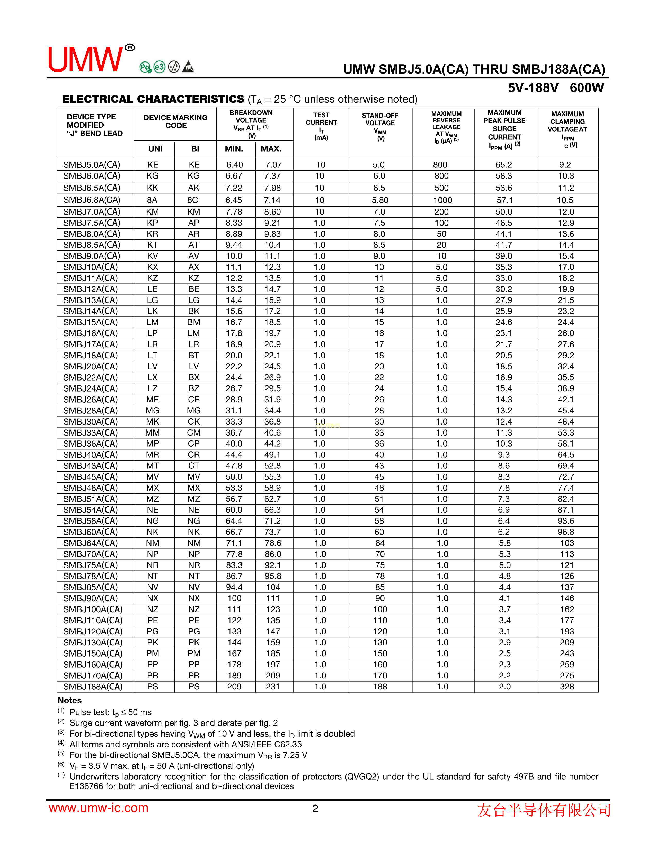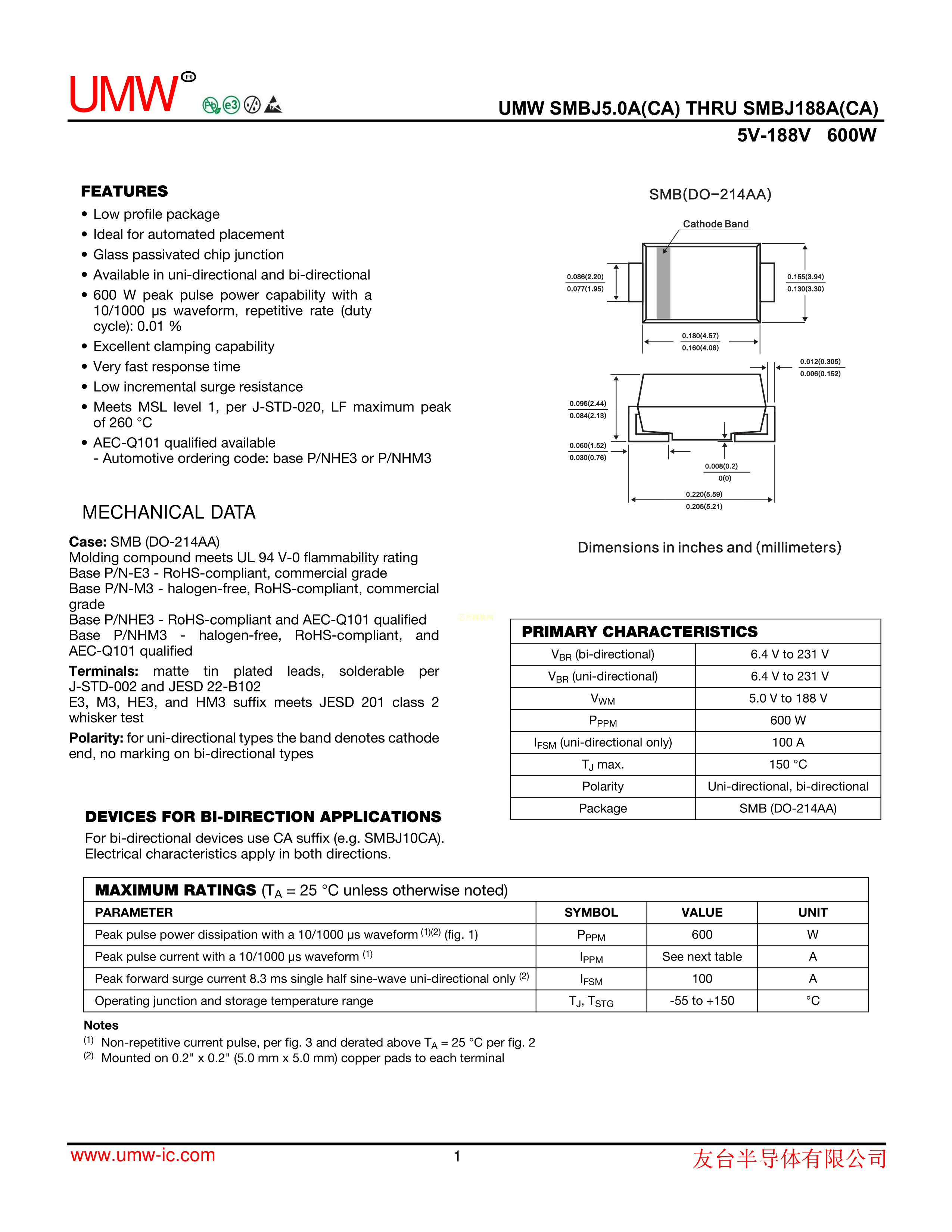 SMBJ33CA数据手册SMB封装UMW(友台半导体)PDF规格书,中英文下载