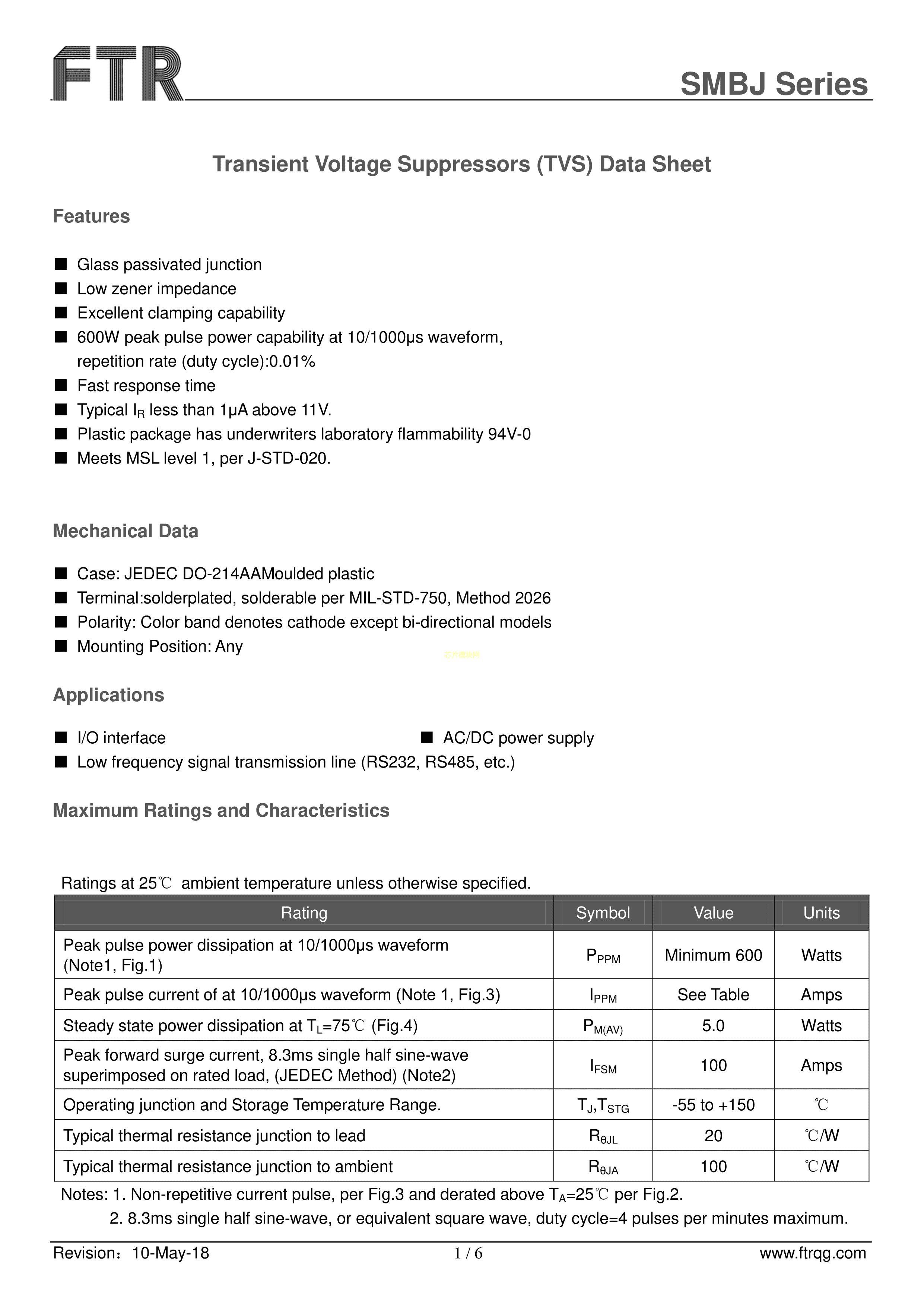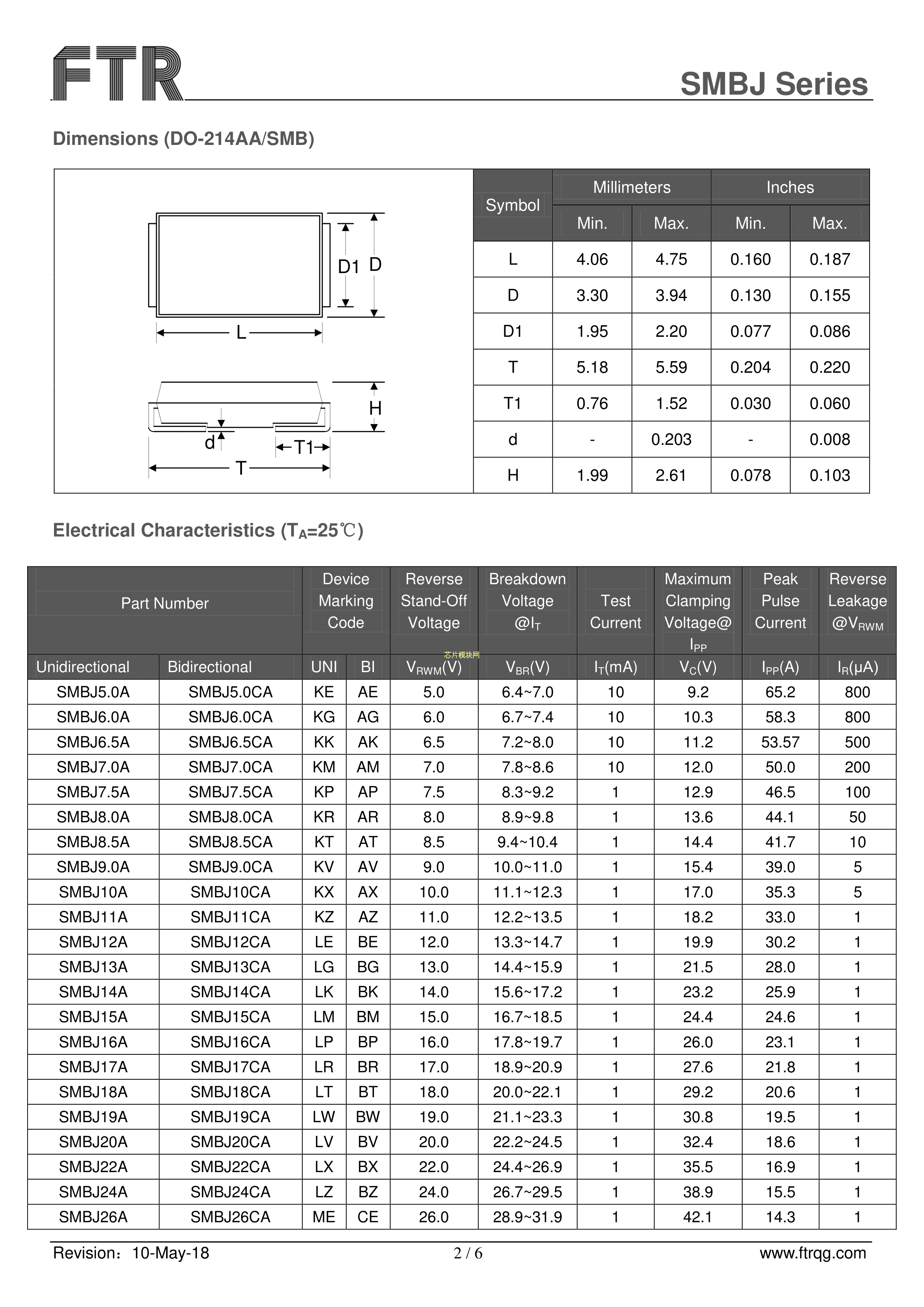SMBJ36CA数据手册SMB(DO-214AA)封装FTR(乔光电子)PDF规格书,中英文下载