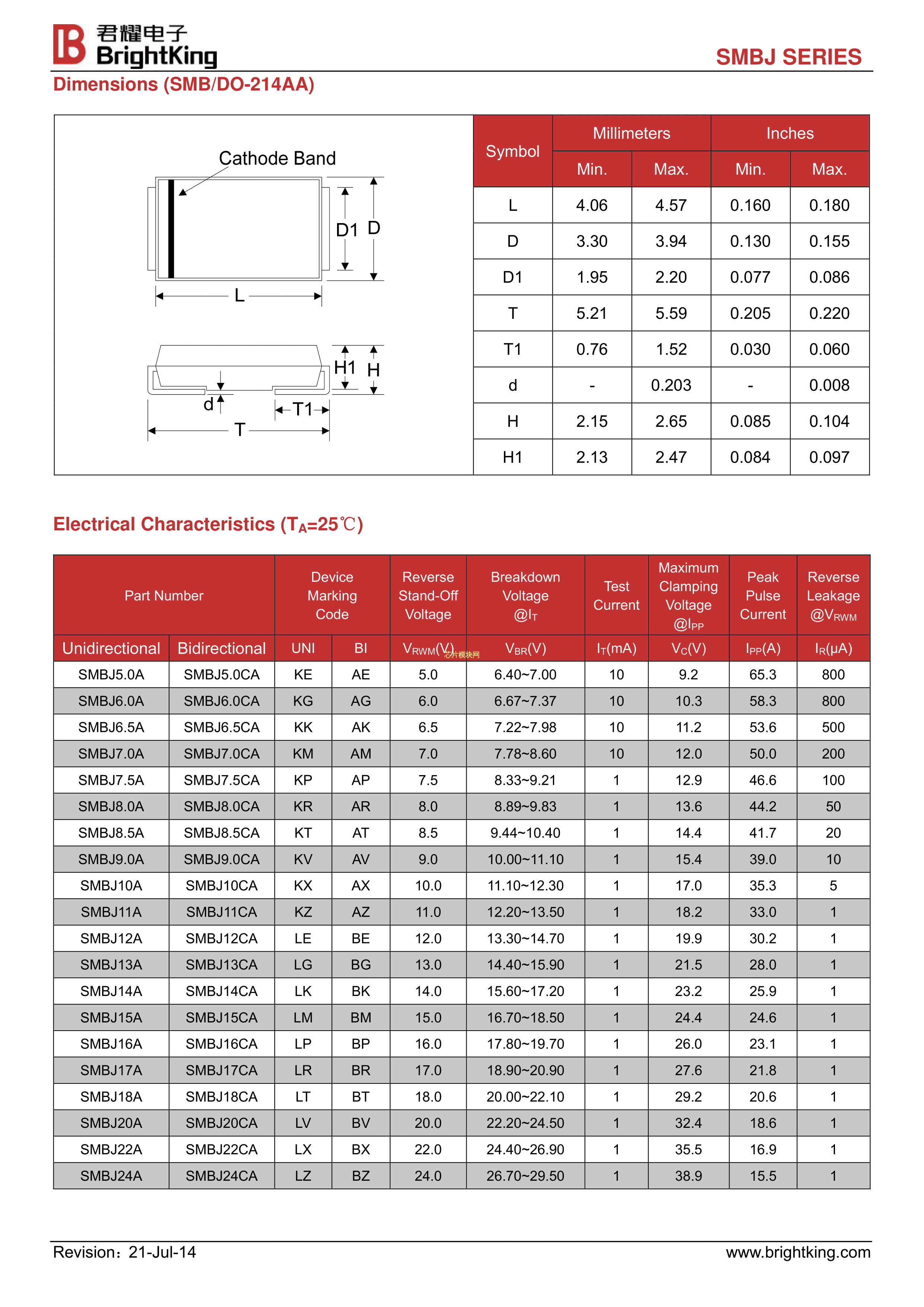 SMBJ400A数据手册SMB(DO-214AA)封装Brightking(台湾君耀)PDF规格书,中英文下载